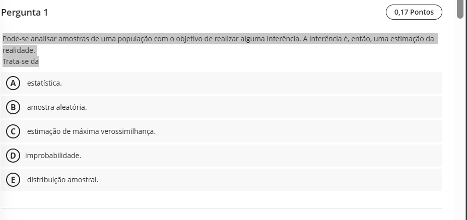 Pergunta 1 0,17 Pontos Pode-se analisar amostras de uma população com o objetivo de realizar alguma inferência. A inferência é, então, uma estimação da realidade. Trata-se da A estatística. B amostra aleatória. C estimação de verossimilhança. D improbabilidade. E distribuição amostral.