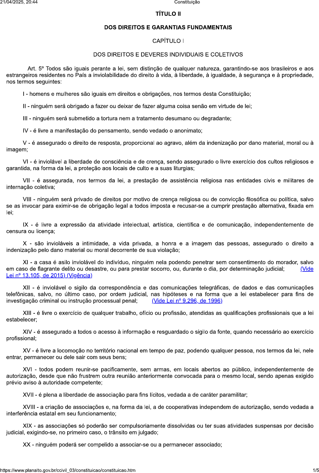 21/04/2025, 20:44 Constituição TÍTULO DOS DIREITOS E GARANTIAS FUNDAMENTAIS CAPÍTULO DOS DIREITOS E DEVERES INDIVIDUAIS E COLETIVOS Art. 5° Todos são iguais perante a lei, sem distinção de qualquer natureza, garantindo-se aos brasileiros e aos estrangeiros residentes no País a inviolabilidade do direito à vida, à liberdade, à igualdade, à segurança e à propriedade, nos termos seguintes: homens e mulheres são iguais em direitos e obrigações, nos termos desta Constituição; ninguém será obrigado a fazer ou deixar de fazer alguma coisa senão em virtude de lei; III ninguém será submetido a tortura nem a tratamento desumano ou degradante; IV é livre a manifestação do pensamento, sendo vedado o anonimato; V é assegurado o direito de resposta, proporcional ao agravo, além da indenização por dano material, moral ou à imagem; VI é inviolável a liberdade de consciência e de crença, sendo assegurado o livre exercício dos cultos religiosos e garantida, na forma da lei, a proteção aos locais de culto e a suas liturgias; VII é assegurada, nos termos da lei, a prestação de assistência religiosa nas entidades civis e militares de internação coletiva; VIII ninguém será privado de direitos por motivo de crença religiosa ou de convicção filosófica ou política, salvo se as invocar para eximir-se de obrigação legal a todos imposta e recusar-se a cumprir prestação alternativa, fixada em lei; IX é livre a expressão da atividade intelectual, artística, científica e de comunicação, independentemente de censura ou licença; X são invioláveis a intimidade, a vida privada, a honra e a imagem das pessoas, assegurado o direito a indenização pelo dano material ou moral decorrente de sua violação; XI a casa é asilo inviolável do indivíduo, ninguém nela podendo penetrar sem consentimento do morador, salvo em caso de flagrante delito ou desastre, ou para prestar socorro, ou, durante o dia, por determinação judicial; (Vide Lei n° 13.105, de 2015) (Vigência) XII é inviolável o sigilo da correspondência e das comunicações telegráficas, de dados e das comunicações telefônicas, salvo, no último caso, por ordem judicial, nas hipóteses e na forma que a lei estabelecer para fins de investigação criminal ou instrução processual penal; (Vide Lei n° 9.296, de 1996) XIII é livre o exercício de qualquer trabalho, ofício ou profissão, atendidas as qualificações profissionais que a lei estabelecer; XIV é assegurado a todos o acesso à informação e resguardado o sigilo da fonte, quando necessário ao exercício profissional; XV é livre a locomoção no território nacional em tempo de paz, podendo qualquer pessoa, nos termos da lei, nele entrar, permanecer ou dele com seus bens; XVI - todos podem reunir-se pacificamente, sem armas, em locais abertos ao público, independentemente de autorização, desde que não frustrem outra reunião anteriormente convocada para o mesmo local, sendo apenas exigido prévio aviso à autoridade competente; XVII é plena a liberdade de associação para fins lícitos, vedada a de caráter paramilitar; XVIII a criação de associações e, na forma da lei, a de cooperativas independem de autorização, sendo vedada a interferência estatal em seu funcionamento; XIX as associações só poderão ser compulsoriamente dissolvidas ou ter suas atividades suspensas por decisão judicial, exigindo-se, no primeiro caso, o trânsito em julgado; XX - ninguém poderá ser compelido a associar-se ou a permanecer associado; 1/521/04/2025, 20:44 Constituição XXI - as entidades associativas, quando expressamente autorizadas, têm legitimidade para representar seus filiados judicial ou extrajudicialmente; XXII é garantido o direito de propriedade; XXIII a propriedade atenderá a sua função social; XXIV a lei estabelecerá o procedimento para desapropriação por necessidade ou utilidade pública, ou por interesse social, mediante justa e prévia indenização em dinheiro, ressalvados os casos previstos nesta Constituição; XXV no caso de iminente perigo público, a autoridade competente poderá usar de propriedade particular, assegurada ao proprietário indenização ulterior, se houver dano; XXVI a pequena propriedade rural, assim definida em lei, desde que trabalhada pela família, não será objeto de penhora para pagamento de débitos decorrentes de sua atividade produtiva, dispondo a lei sobre os meios de financiar o seu XXVII aos autores pertence o direito exclusivo de utilização, publicação ou reprodução de suas obras, transmissível aos herdeiros pelo tempo que a lei fixar; XXVIII são assegurados, nos termos da lei: a) a proteção às participações individuais em obras coletivas e à reprodução da imagem e voz humanas, inclusive nas atividades desportivas; b) o direito de fiscalização do aproveitamento econômico das obras que criarem ou de que participarem aos criadores, aos intérpretes e às respectivas representações sindicais e associativas; XXIX a lei assegurará aos autores de inventos industriais privilégio temporário para sua utilização, bem como proteção às criações industriais, à propriedade das marcas, aos nomes de empresas e a outros signos distintivos, tendo em vista o interesse social e o desenvolvimento tecnológico e econômico do País; XXX é garantido o direito de herança; XXXI a sucessão de bens de estrangeiros situados no País será regulada pela lei brasileira em benefício do cônjuge ou dos filhos brasileiros, sempre que não lhes seja mais favorável a lei pessoal do "de cujus"; XXXII - o Estado promoverá, na forma da lei, a defesa do consumidor; XXXIII todos têm direito a receber dos órgãos públicos informações de seu interesse particular, ou de interesse coletivo ou geral que serão prestadas no prazo da lei, sob pena de responsabilidade, ressalvadas aquelas cujo sigilo seja imprescindível à segurança da sociedade e do Estado; (Vide Lei 12.52