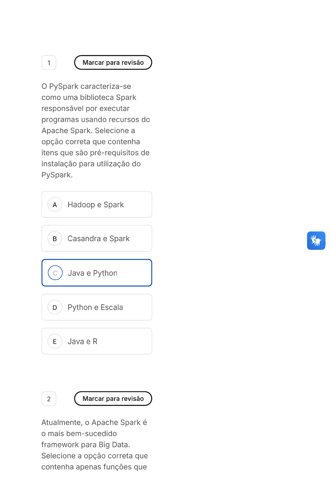 1 Marcar para revisão PySpark caracteriza-se como uma biblioteca Spark responsável por executar programas usando recursos do Apache Spark. Selecione a opção correta que contenha itens que são pré-requisitos de instalação para utilização do PySpark. A Hadoop e Spark B Casandra e Spark C Java e Python D Python e Escala E Java e R 2 Marcar para revisão Atualmente, o Apache Spark é o mais bem-sucedido framework para Big Data. Selecione a opção correta que contenha apenas funções quepodem ser categorizadas como transformações no Spark. A count, collect e take. B map, sample e collect. C map, filter e union. D reduce, first e map. E map, take e reduce. 3 Marcar para revisão paradigma MapReduce é uma estratégia de computação com capacidade de processar grandes conjuntos de dados de maneira distribuída em várias máquinas. Em relação à técnica MapReduce, selecione a opção que é responsável por consolidar os resultados produzidos ao longo do processamento. A Agregação B MapeamentoC Separação D Redução E Processamento 4 Marcar para revisão Os componentes do Spark têm como objetivo facilitar o desenvolvimento de projetos com finalidades específicas. Nesse sentido, selecione a opção que contém o componente responsável por estabelecer uma conexão com o Cluster. A Spark.Catalog B SparkSession C DataFrame D RDD E SparkContext5 Marcar para revisão Dado que Felipe quer fazer a junção entre dois conjuntos de dados e escreveu o seguinte código: import pandas as pd df1 = ['foo', 'bar', 'baz', 'foo'], 'value': 2, 3, 5]}) df2 = ['foo', 'bar', 'baz', 'foo'], 'value': [5, 6, 7, 8]}) df1.merge(df2, left_on='lkey', right_on='rkey') Qual destas alternativas descreve as saídas do código? I. O conjunto resultante terá colunas Ikey, value_x, rkey, value_y II. código não executará, pois Filipe não definiu os sufixos de coluna III. O resultado do código em questão retornará um pd.Series juntando os conjuntos pela Ikey e rkey. Apenas a opção está A correta. Apenas a opção B está correta. Apenas a opção III C está correta.Apenas as opções e D III estão corretas. Apenas as opções e E III estão corretas. 6 Marcar para revisão Gabriel entrou recentemente em uma empresa de gestão de fundos de investimento. No seu primeiro dia de trabalho, lhe é conferida a tarefa de buscar os relatórios do pessoal da contabilidade para fazer suas análises exploratórias SM2 Tópicos De Big Data Em Python T dados de seus relatorios de um SAP que retorna valores brutos de compras, quantidades de produtos 00 : 42 : 55 etc. Então os contadores Ocultar hora min seg organizam, por agregação, informação relevante no relatório em planilhas por Questão 9 de 10 eles desenvolvidos. Por questões de acesso e 1 2 3 4 5 segurança, Gabriel só pode lidar com essas planilhas. 6 7 8 9 10 Este tipo de coleta feita por Gabriel e pelos Contadores Respondidas (10) Em branco (0) é respectivamente dos tipos: Finalizar provaA Secundária; Primária. B Primária; Primária. C Secundária; Terciária. D Primária; Secundária. Secundária; E Secundária. 7 Marcar para revisão Sobre o Pandas DataFrame, o que podemos afirmar? - É o coletivo de séries temporais pandas.Series - a estrutura de dados que representa os dados em painel - uma matriz conjunto de vetores IV - É o bloco fundamental da análise de dados moderna, principalmente para aprendizado de máquina. Analise as frases listadas e assinale a alternativa correta. A Apenas a opção III. Apenas as opções I, B II, IV.Apenas as opções I, II, C III. Apenas as opções II, D III. Todas as opções I, II, E III, IV. 8 Marcar para revisão termo mineração de dados é amplamente usado na comunidade técnica a esmo, mas, na realidade, ele se refere ao processo de: A CNN B KDD C DNN D LSTM E RNN 9 Marcar para revisãoQual o tipo de método nos permite visualizar a árvore de decisão na biblioteca Scikit- Learn? A console.log B print C plot_tree D cout E printf 10 Marcar para revisão As técnicas de aprendizado de máquina para aprendizado supervisionado são: - Classificação - - Agrupamento III - Regressão A Apenas I e B Apenas e III C Apenas e IIID Apenas I E Apenas