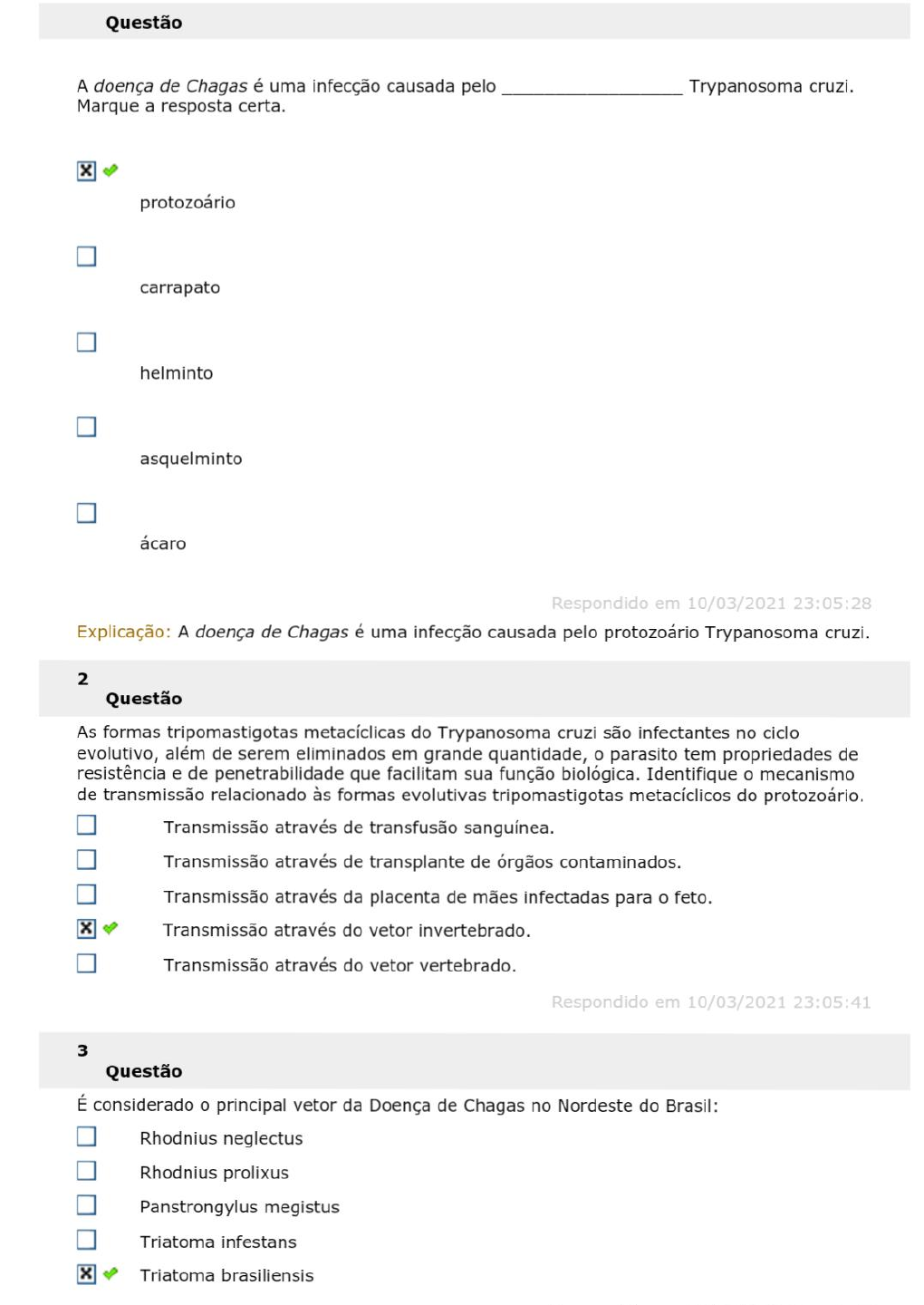 Questão A doença de Chagas é uma infecção causada pelo Trypanosoma cruzi. Marque a resposta certa. X protozoário carrapato helminto asquelminto ácaro Respondido em 10/03/2021 23:05:28 Explicação: A doença de Chagas é uma infecção causada pelo protozoário Trypanosoma cruzi. 2 Questão As formas tripomastigotas do Trypanosoma cruzi são infectantes no ciclo evolutivo, além de serem eliminados em grande quantidade, o parasito tem propriedades de resistência e de penetrabilidade que facilitam sua função biológica. Identifique o mecanismo de transmissão relacionado às formas evolutivas tripomastigotas metacíclicos do protozoário. Transmissão através de transfusão sanguínea. Transmissão através de transplante de órgãos contaminados. Transmissão através da placenta de mães infectadas para o feto. Transmissão através do vetor invertebrado. Transmissão através do vetor vertebrado. Respondido em 10/03/2021 23:05:41 3 Questão É considerado o principal vetor da Doença de Chagas no Nordeste do Brasil: Rhodnius neglectus Rhodnius prolixus Panstrongylus megistus Triatoma infestans Triatoma brasiliensis4 Questão A Doença de Chagas é endêmica no Brasil e de acordo com a literatura há várias formas de transmissão. Muitas infecções podem apresentar uma fase febril, tornando-se depois, assintomáticas. Outros casos permanecem sem sintomas indefinidamente. Nos casos sintomáticos, a frequência com que cada órgão ou tecido é atingido é bastante variável. Marque a opção que se refere a fase longa assintomática da Doença de Chagas. Fase crônica indeterminada. Fase aguda assintomática. Fase aguda. Fase sintomática. Fase crônica. Respondido em 10/03/2021 23:05:51 5 Questão A principal via de transmissão da doença de Chagas é a vetorial, mas, a infecção pode ser adquirida por vias alternativas, que exigem medidas preventivas específicas. Marque a alternativa em que se pode identificar forma de prevenção da doença de Chagas: Uso de preservativos e controle de mosquitos vetores. Controle nos bancos de sangue e uso de preservativos. Controle de pombos e dos percevejos vetores. Controle de roedores e dos mosquitos vetores. Controle nos bancos de sangue e dos percevejos vetores. Respondido em 10/03/2021 23:06:11 6 Questão A forma infectante de Trypanosoma cruzi para o hospedeiro vertebrado é: Amastigota Epimastigota Tripomastigota Promastigota Tripomastigota Respondido em 10/03/2021 23:06:147 Questão Um grupo de pessoas foi contaminado por mal de Chagas após terem ingerido um suco de fruta que continha fezes do barbeiro ou próprio animal triturado. Uma das pessoas faleceu. A partir deste caso marque a alternativa correta com relação as seguintes afirmativas: I Essa doença endêmica de algumas regiões do Brasil, pode vir a ser tornar uma epidemia, principalmente por meio do mecanismo relatado. II Na transmissão por ingestão do protozoário, a infestação é direta, tirando do ciclo um dos vetores da doença. III Certamente existem outras pessoas infectadas com o mal de Chagas no fato relatado, caso contrario, a doença não teria aparecido. Apenas as alternativas I e II estão corretos. Apenas a afirmativa II está correta. Apenas a alternativa I está correta. Todas as afirmativas estão corretas. Apenas a afirmativa III está correta. Respondido em 10/03/2021 23:06:17 8 Questão Sobre a doença de Chagas marque a alternativa que melhor identifica um aspecto clínico da fase aguda desta protozoose: Meningoencefalite. Disfagia, regurgitação e dor epigástrica. Arritmias complexas. Parasitemia. Insuficiência cardíaca. Respondido em 10/03/2021 23:06:211 Questão A malária é uma doença infecciosa, causada por parasitas protozoários, transmitida por mosquitos. Malária espalha-se em regiões tropicais e sub-tropicais, como partes das Américas, Ásia e Cada ano há entre 1 e 3 milhões de mortes decorrentes de malária, sendo a maioria de crianças na África Sub-Saariana. Malária é uma das doenças mais comuns e um grande problema de saúde pública em vários países. A doença é causada por parasitas protozoários do gênero Plasmodium. Os parasitas da malária são transmitidos por mosquitos fêmeas do gênero Anopheles. Os mosquitos do gênero Anopheles ao sugar o sangue do homem infectado INGEREM o Plasmodium na forma de: Merozoíta Esporozoita Tripomastigota Gametas Esquizonte Respondido em 10/03/2021 23:06:49 2 Questão A qual forma clínica corresponde essa descrição de um caso clinico? ¿Paciente apresentava uma lesão na derme ulcerada com borda elevada, com aparência de cratera de vulcão ou de Leishmaniose muco cutânea. Nenhuma das respostas anteriores. Leishmaniose cutânea ou tegumentar Leishmaniose visceral Leishmaniose cutânea difusa Respondido em 10/03/2021 23:06:55 3 Questão Marque a alternativa que se refere a doença parasitária que é transmitida por vetor. Leishmaniose Ascaríase Larva Migrans cutânea Amebíase Giardíase Respondido em 10/03/2021 23:06:586 Questão Com relação à transmissão da malária ao homem é correto afirmar: Picada do mosquito que inocula as formas tripomastigotas Picada do mosquito que inocula formas merozoitas Picada do mosquito que inocula formas esquizontes Picada do mosquito que inocula formas amastigotas Picada do mosquito que inocula formas esporozoitas Respondido em 10/03/2021 23:07:18 7 Questão Cisticercose é causada por: B) Ingestão de larvas da Taenia E) Ingestão do ovo da Taenia saginata D) Ingestão das proglote da Taenia A) Ingestão do ovo da Taenia solium C) Pela penetração de larvas da Taenia Respondido em 10/03/2021 23:07:44 Explicação: A cisticercose é uma infecção causada pela ingestão acidental do ovo da Taenia solium. 8 Questão Segundo dados da Organização Mundial de Saúde, a malária ameaça mais de um bilhão de pessoas no mundo. o agente etiológico e agente transmissor desta doença, são, respectivamente: o flagelado do gênero T