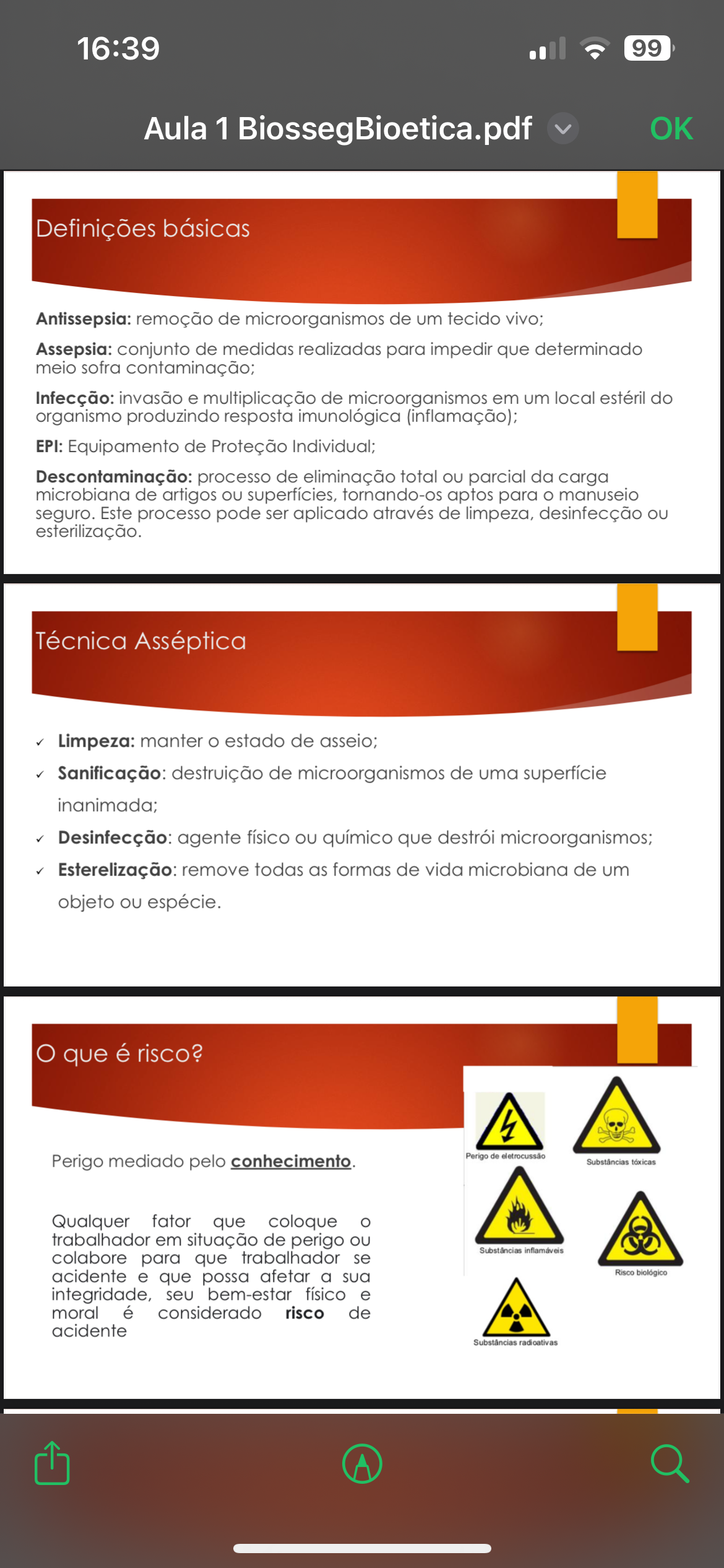 16:39 99 Aula 1 BiossegBioetica.pdf OK Definições básicas Antissepsia: remoção de microorganismos de um tecido vivo; Assepsia: conjunto de medidas realizadas para impedir que determinado meio sofra contaminação; Infecção: invasão e multiplicação de microorganismos em um local estéril do organismo produzindo resposta imunológica EPI: Equipamento de Proteção Individual; Descontaminação: processo de eliminação total ou parcial da carga microbiana de artigos ou superfícies, tornando-os aptos para manuseio seguro. Este processo pode ser aplicado através de limpeza, desinfecção ou esterilização. Técnica Asséptica Limpeza: manter estado de asseio; Sanificação: destruição de microorganismos de uma superfície inanimada; Desinfecção: agente físico ou químico que destrói microorganismos; Esterelização: remove todas as formas de vida microbiana de um objeto ou espécie. O que é risco? 4 Perigo mediado pelo conhecimento. Perigo de eletrocussão Substâncias Qualquer fator que coloque trabalhador em situação de perigo ou & colabore para que trabalhador se Substâncias inflamáveis acidente e que possa afetar a sua Risco biológico integridade, seu bem-estar físico e moral é considerado risco de acidente radioativas Q