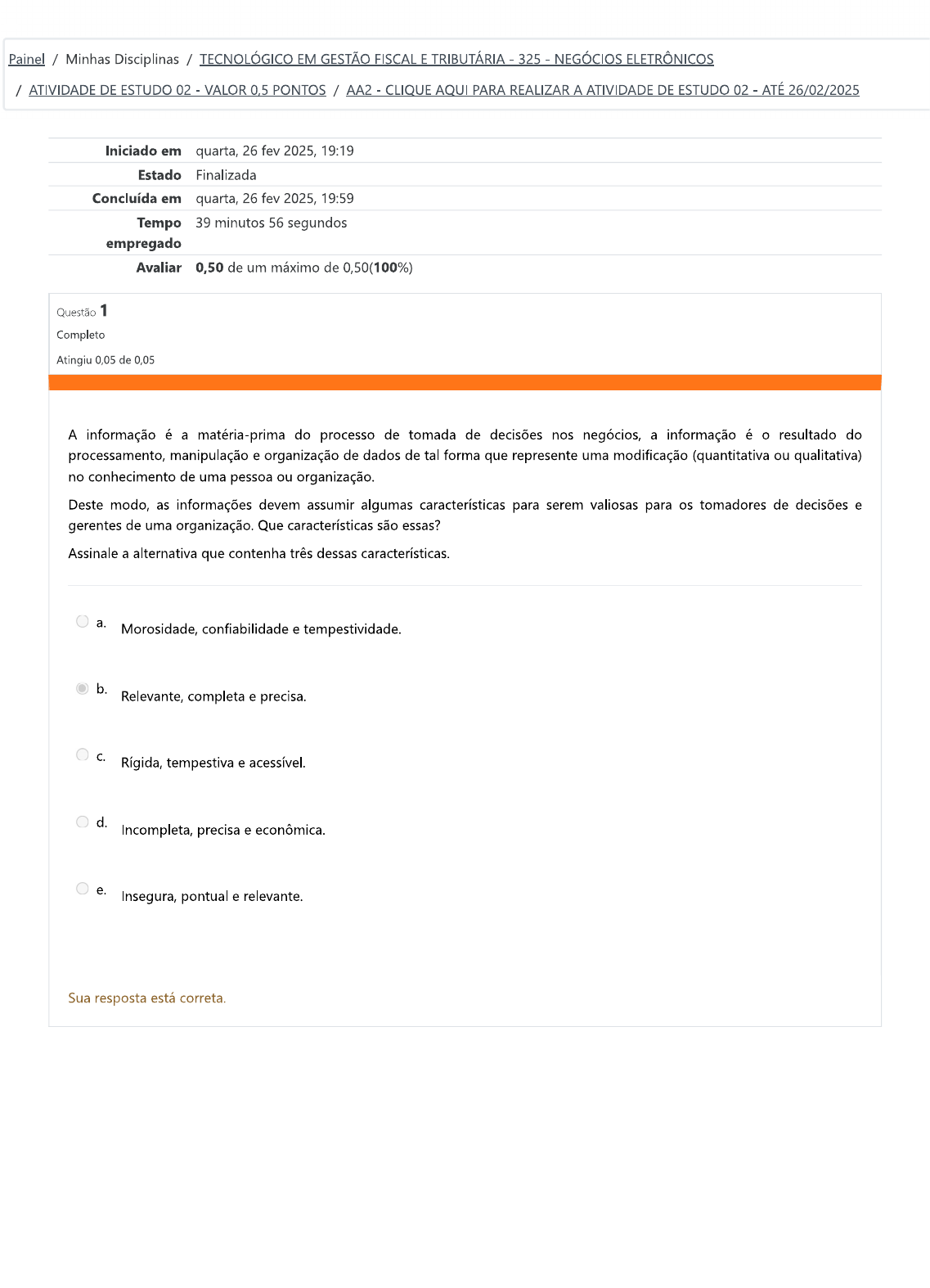 Painel / Minhas Disciplinas / TECNOLÓGICO EM GESTÃO FISCAL E TRIBUTÁRIA - 325 NEGÓCIOS ELETRÔNICOS / ATIVIDADE DE ESTUDO 02 - VALOR 0,5 PONTOS / AA2 - CLIQUE AQUI PARA REALIZAR A ATIVIDADE DE ESTUDO 02 - ATÉ 26/02/2025 Iniciado em quarta, 26 fev 2025, 19:19 Estado Finalizada Concluída em quarta, 26 fev 2025, 19:59 Tempo 39 minutos 56 segundos empregado Avaliar 0,50 de um máximo de 0,50(100%) Questão 1 Completo Atingiu 0,05 de 0,05 A informação é a matéria-prima do processo de tomada de decisões nos negócios, a informação é o resultado do processamento, manipulação e organização de dados de tal forma que represente uma modificação (quantitativa ou qualitativa) no conhecimento de uma pessoa ou organização. Deste modo, as informações devem assumir algumas características para serem valiosas para os tomadores de decisões e gerentes de uma organização. Que características são essas? Assinale a alternativa que contenha três dessas características. a. Morosidade, confiabilidade e tempestividade. b. Relevante, completa e precisa. C. Rígida, tempestiva e acessível. d. Incompleta, precisa e econômica. e. Insegura, pontual e relevante. Sua resposta está correta.Questão 2 Completo Atingiu 0,05 de 0,05 A Segurança da Informação não é restrita somente a informações ou dados eletrônicos. Esse conceito pode ser ampliado a todo tipo de recursos que uma organização considera importante manter protegidos para seu pleno funcionamento, como itens de hardware e softwares, capital intelectual, marcas, patentes, etc. Sendo assim, analise as afirmatSendo assim, analise as afirmativas abaixo e julgue com "V" para verdadeiro e "F" para falso: ( ) Informação pode ser considerada, todo tipo de registro ou fatos brutos que ainda não foram tratados e/ou processados e são representados por meio de números, letras, gráficos, som, entre outros, que podem ser armazenados, medidos e observados. ( ) Os dados são sequências de fatos brutos, resultantes de eventos ocorridos nas organizações ou no ambiente físico, antes de serem organizados e estruturados de forma que as pessoas possam entendê-los e utilizá-los. ( ) dado é a matéria-prima do processo de tomada de decisões nos negócios. ( ) Dado é o resultado do processamento, manipulação e organização de dados de tal forma que represente uma modificação (quantitativa ou qualitativa) no conhecimento de uma pessoa ou organização Assinale a alternativa correta: a. F, V, F, F. b. F, F, V, V. C. V, F, F, V. d. V, V, V, V. e. F, F, F, F. Sua resposta está correta.Questão 3 Completo Atingiu 0,05 de 0,05 Refere-se a um segmento de código que é replicado através da anexação de cópias de si mesmo nos executáveis existentes. A nova cópia do vírus é executada quando o usuário ativa o programa hospedeiro. Tal afirmação se refere a: Assinale a alternativa correta: a. Cavalo de Troia. b. Hospedeiro. C. Dados. d. Worm. e. Vírus. Sua resposta está correta.Questão 4 Completo Atingiu 0,05 de 0,05 O conceito de marketing digital também pode ser considerado uma evolução do chamado E-marketing ou Marketing Eletrônico. Essas denominações buscam apresentar definições para as estratégias e ações de marketing que ocorrem nos meios e dispositivos digitais (internet) e nas mídias eletrônicas como a televisão digital, por exemplo. Neste sentido, analise as asserções abaixo: I. As estratégias de Marketing Digital ou Marketing Eletrônico tem se tornado essencial para as empresas manterem sua competitividade no mercado e para se comunicarem com seus consumidores. conceito é simples, se cada vez mais as pessoas passam mais tempo conectadas a internet, as empresas e marcas precisam estar nesse mesmo ambiente digital para oferecer seus produtos e serviços. PORÉM, II. Para se destacar na na Web, uma empresa precisa ter gestão profissional. Não basta apenas estar presente e investir recursos na rede para estar praticando o chamado marketing digital. A respeito dessas asserções, assinale a opção correta: a. As asserções e são proposições verdadeiras, mas a II não é uma justificativa correta da I. b. A asserção é uma proposição falsa e a é uma proposição verdadeira. C. As asserções e II são proposições falsas. d. As asserções e II são proposições verdadeiras e a II é uma justificativa correta da I. e. A asserção I é uma proposição verdadeira e a II é uma proposição falsa. Sua resposta está correta.Questão 5 Completo Atingiu 0,05 de 0,05 Uma das principais funções do marketing é o estudo do comportamento do consumidor para o desenvolvimento de estratégias para influenciar em suas decisões de compra, seja on-line ou off-line. Sendo assim, o processo de compra, usualmente, é dividido em cinco estágios. Quanto a esses estágios, analise as afirmativas a seguir: I. Busca de informações: É a primeira etapa do processo, onde o consumidor reconhece a necessidade de adquirir um determinado produto ou serviço dando início ao processo de compra. II. Avaliação das alternativas: após o reconhecimento da necessidade e utilizar as informações sobre os produtos ou serviços disponíveis, o consumidor precisa escolher entre as diferentes alternativas. III. Decisão de compra: nesse estágio de avaliação, o consumidor classifica as marcas e forma intenções de compras. Geralmente, sua decisão de compra é voltada para sua marca favorita. IV. Comportamento pós-compras: após a compra, o consumidor pode ficar satisfeito ou insatisfeito, e isso se caracteriza no chamado comportamento pós-compra. V. Descarte: penúltima etapa do processo de compra, ocorre quando o consumidor não utiliza mais o bem ou serviço. Assinale a alternativa correta: a. Todas as alternativas estão corretas. b. Apenas I, II e III estão corretas. C. Apenas está correta. d. Apenas e V estão corretas. e. Apenas II, III e IV estão corretas. Sua resposta está correta.Questão 6 Compl