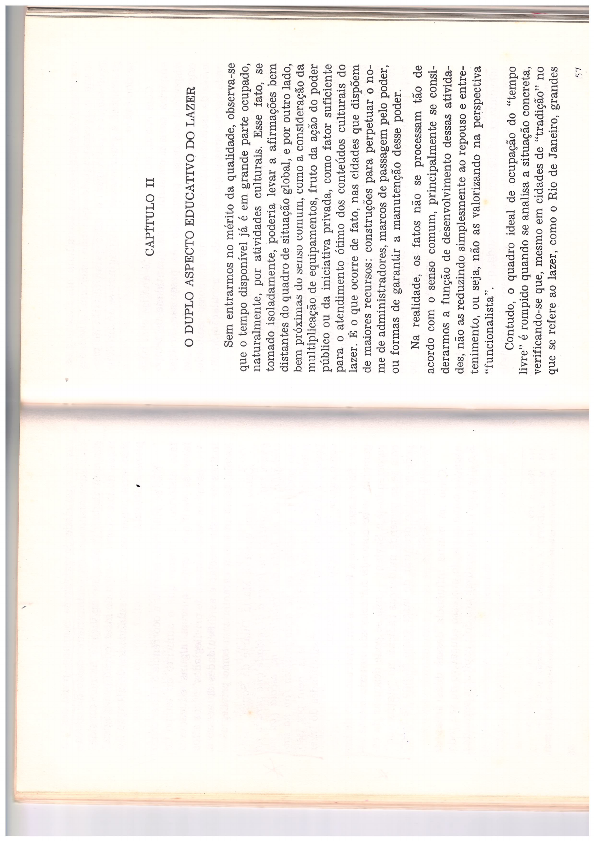 CAPÍTULO II DUPLO ASPECTO EDUCATIVO DO LAZER Sem entrarmos no mérito da qualidade, observa-se que o tempo disponível já é em grande parte ocupado, naturalmente, por atividades culturais. Esse fato, se tomado isoladamente, poderia levar a afirmações bem distantes do quadro de situação global, e por outro lado, bem próximas do senso comum, como a consideração da multiplicação de equipamentos, fruto da ação do poder público ou da iniciativa privada, como fator suficiente para o atendimento ótimo dos conteúdos culturais do lazer. É o que ocorre de fato, nas cidades que dispõem de maiores recursos: construções para perpetuar o no- me de administradores, marcos de passagem pelo poder, ou formas de garantir a manutenção desse poder. Na realidade, os fatos não se processam tão de acordo com o senso comum, principalmente se consi- derarmos a função de desenvolvimento dessas ativida- des, não as reduzindo simplesmente ao repouso e entre- tenimento, ou seja, não as valorizando na perspectiva "funcionalista". Contudo, o quadro ideal de ocupação do "tempo livre" é rompido quando se analisa a situação concreta, verificando-se que, mesmo em cidades de "tradição" no que se refere ao lazer, como o Rio de Janeiro, grandes 57contingentes populacionais trabalham nos finais de se- zado, o estímulo, a iniciação, que possibilitem a passa- mana e, mesmo aqueles que não exercem atividades gem de níveis menos elaborados, simples, para níveis profissionais, participam de uma gama restrita de pro- mais elaborados, complexos, com o enriquecimento do gramações, a grande maioria restringindo-se ao ambien- espírito crítico, na prática ou na observação. Verifica-se, te doméstico assim, um duplo processo educativo o lazer como Com efeito, faltam elementos de análise com base veículo e como objeto de educação empírica para a constatação da quantidade de tempo Praticamente todos os autores, ligados ao estudo do disponível da nossa população. As pesquisas do tipo lazer, reconhecem esse seu duplo aspecto educativo. E orçamento/tempo só contribuem para confundir, ao essa afirmação confirma as observações feitas no capí- invés de esclarecer, principalmente na nossa realidade, tulo anterior, ou seja, a impossibilidade de rotulações onde apenas uma pequena parcela da população é con- maniqueístas do pensamento manifestado pelos vários siderada "economicamente ativa" Entretanto, embora o reconhecimento desse Contudo, não podemos negar que alguns gêneros duplo aspecto educativo seja quase unânime, variam os são bastante difundidos entre a população em geral. enfoques dados ao tratamento da relação lazer/educa- Mas esse fato nos dá apenas uma visão muito particula- ção. Como vimos, existe uma vinculação entre os valo- rizada da apropriação do lazer pela população. Deixa de res atribuídos ao lazer e à educação, sobretudo entre os considerar aspectos importantes, verificados na situa- autores do primeiro campo de atuação, área central ção, tais como: a restrição quantitativa e sobretudo deste estudo. qualitativa no acesso à produção cultural, o consumo No primeiro capítulo, essa relação foi examinada desligado da cultura vivida e a prática isolada e confor- com respeito aos campos privilegiados para a ocorrência mista. Em outras palavras, deixa de considerar a neces- da educação, e confrontada com opiniões de autores sidade de uma ação educativa que procure colaborar na mais diretamente ligados à área pedagógica. É propósito correção dessas tendências indesejáveis, do ponto de deste capítulo, ao examinar o duplo aspecto educativo vista de quem considera o plano cultural como um canal do lazer, procurar estabelecer as relações entre os valo- possível para mudanças de repercussão, inclusive, no res atribuídos, analisados anteriormente, e o lazer, en- plano social. É o que procurarei analisar no decorrer tendido como instrumento e objeto de educação. Em- deste capítulo. bora não restrita a uma única questão, a indagação Trata-se de um posicionamento baseado em duas principal diz respeito às implicações entre os valores constatações: (a primeira, que o lazer é um veículo pri- expressos pelas correntes "moralista", "romântica", vilegiado de educação; e a segunda, que para a prática "utilitarista" e "compensatória" e o duplo aspecto edu- positiva das atividades de lazer é necessário o aprendi- cativo do lazer. 1. Centro latino americano de Pesquisas em Ciências Sociais, Lazer na região 3. o assunto é abordado por vários autores e, mais especificamente, por metropolitana do Rio de Renato REQUIXA, Sugestões de diretrizes para uma política nacional de 2. Abordo a questão no ensaio Lazer e humanização, p. 34. lazer, pp. 52-59. 58 59Silvia Claudete Educ. Física Reg 1. o LAZER COMO VEÍCULO DE EDUCAÇÃO dos em conceber novas formas de educação a dessas ocupações de lazer propicia Tratando-se do lazer como veículo de educação, é necessário considerar suas potencialidades para o de- Requixa tanto considera que se pode educar pela senvolvimento pessoal e social dos indivíduos. Tanto prática do lazer, como também reconhece a importância de se educar para o lazer. Só que, nesse último caso, cumprindo objetivos como relaxa- argumenta que o próprio exercício do lazer será mento e o prazer propiciados pela prática ou pela con- o melhor estímulo educativo para o próprio lazer" Ao templação, quanto objetivos instrumentais, no sentido preconizar uma política de lazer, o autor adverte que de contribuir para a compreensão da realidade, as ativi- talvez fosse melhor referir-se a uma política educacio- dades de lazer favorecem, a par do desenvolvimento nal, " que considere outros tempos, outros espaços pessoal, também o desenvolvimento social, pelo reconhe- e recursos, que faça do lazer uma escola para todas as cimento das responsabilidades sociais, a partir do agu-