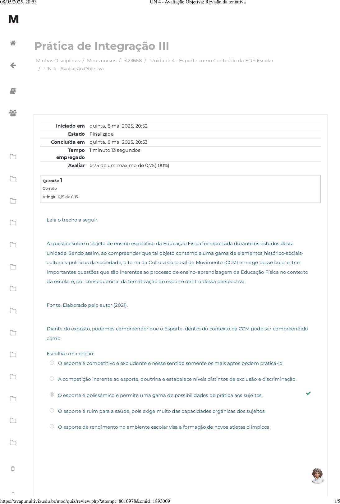 Minhas Disciplinas / Meus cursos / 423668 / Unidade 4 - Esporte como Conteúdo da EDF Escolar / UN 4 - Avaliação Objetiva Prática de Integração III Iniciado em quinta, 8 mai 2025, 20:52 Estado Finalizada Concluída em quinta, 8 mai 2025, 20:53 Tempo empregado 1 minuto 13 segundos Avaliar 0,75 de um máximo de 0,75(100%) Questão 1 Correto Atingiu 0,15 de 0,15 Leia o trecho a seguir. A questão sobre o objeto de ensino específico da Educação Física foi reportada durante os estudos desta unidade. Sendo assim, ao compreender que tal objeto contempla uma gama de elementos histórico-sociais- culturais-políticos da sociedade, o tema da Cultura Corporal de Movimento (CCM) emerge desse bojo, e, traz importantes questões que são inerentes ao processo de ensino-aprendizagem da Educação Física no contexto da escola, e, por consequência, da tematização do esporte dentro dessa perspectiva. Fonte: Elaborado pelo autor (2021). Diante do exposto, podemos compreender que o Esporte, dentro do contexto da CCM pode ser compreendido como: Escolha uma opção: O esporte é competitivo e excludente e nesse sentido somente os mais aptos podem praticá-lo. A competição inerente ao esporte, doutrina e estabelece níveis distintos de exclusão e discriminação. O esporte é polissêmico e permite uma gama de possibilidades de prática aos sujeitos. O esporte é ruim para a saúde, pois exige muito das capacidades orgânicas dos sujeitos. O esporte de rendimento no ambiente escolar visa a formação de novos atletas olímpicos. 08/05/2025, 20:53 UN 4 - Avaliação Objetiva: Revisão da tentativa https://avap.multivix.edu.br/mod/quiz/review.php?attempt=8010978&cmid=1893009 1/5 https://avap.multivix.edu.br/my/ https://avap.multivix.edu.br/course/view.php?id=34257 https://avap.multivix.edu.br/course/view.php?id=34257§ion=5 https://avap.multivix.edu.br/mod/quiz/view.php?id=1893009 https://avap.multivix.edu.br/my/ https://avap.multivix.edu.br/course/view.php?id=34257 https://avap.multivix.edu.br/user/index.php?id=34257 https://avap.multivix.edu.br/course/view.php?id=34257§ion=1 https://avap.multivix.edu.br/course/view.php?id=34257§ion=2 https://avap.multivix.edu.br/course/view.php?id=34257§ion=3 https://avap.multivix.edu.br/course/view.php?id=34257§ion=4 https://avap.multivix.edu.br/course/view.php?id=34257§ion=5 https://avap.multivix.edu.br/course/view.php?id=34257§ion=6 https://avap.multivix.edu.br/course/view.php?id=34257§ion=7 https://avap.multivix.edu.br/course/view.php?id=34257§ion=8 https://avap.multivix.edu.br/course/view.php?id=34257§ion=9 https://avap.multivix.edu.br/course/view.php?id=34257§ion=10 https://avap.multivix.edu.br/course/view.php?id=34257§ion=11 https://avap.multivix.edu.br/course/view.php?id=34257§ion=12 https://avap.multivix.edu.br/course/view.php?id=34257§ion=13 https://avap.multivix.edu.br/course/view.php?id=34257§ion=14 https://avap.multivix.edu.br/hooks/portal/ https://avap.multivix.edu.br/mod/page/view.php?id=1252%2F%22%20target%3D%22_blank https://avap.multivix.edu.br/ https://avap.multivix.edu.br/ https://avap.multivix.edu.br/ https://avap.multivix.edu.br/ https://avap.multivix.edu.br/ https://avap.multivix.edu.br/ Questão 2 Correto Atingiu 0,15 de 0,15 Leia o trecho a seguir. Como vimos durante os estudos desta unidade, o esporte pode e deve ser ensinado a todos, para além das técnicas e distintas modalidades esportivas, mas sim, contemplar inúmeras questões inerentes à sua prática consciente, e, das suas diferentes formas de organização. Nesse sentido, ao final da Educação Básica, seria muito interessante que todos os alunos pudessem deixar o Ensino Médio portando conhecimentos sobre o esporte, como uma possibilidade de agrega-lo às suas rotinas diárias, e, principalmente, da sua importância sob os aspectos do estilo de vida e da qualidade de vida. Fonte: Elaborado pelo autor (2021). De acordo com o texto, assinale a alternativa que apresenta corretamente as incumbências inerentes ao trabalho pedagógico do professor de Educação Física. Escolha uma opção: Ensinar o esporte de participação com viés voltado ao alto rendimento esportivo, a busca e seleção de novos talentos esportivos. Ensinar o esporte educacional com viés das competições esportivas internacionais e nacionais e todas as suas regras oficiais. Ensinar o esporte de modo não-profissional visando a descoberta de talentos a partir do vínculo empregatício e de remuneração. Ensinar o esporte educacional com o viés olímpico, na perspectiva da formação de atletas de alto rendimento no ambiente escolar. Ensinar o esporte como uma prática para toda a vida, para que assim os sujeitos possam usufruir de seus benefícios. 08/05/2025, 20:53 UN 4 - Avaliação Objetiva: Revisão da tentativa https://avap.multivix.edu.br/mod/quiz/review.php?attempt=8010978&cmid=1893009 2/5 https://avap.multivix.edu.br/my/ https://avap.multivix.edu.br/course/view.php?id=34257 https://avap.multivix.edu.br/user/index.php?id=34257 https://avap.multivix.edu.br/course/view.php?id=34257§ion=1 https://avap.multivix.edu.br/course/view.php?id=34257§ion=2 https://avap.multivix.edu.br/course/view.php?id=34257§ion=3 https://avap.multivix.edu.br/course/view.php?id=34257§ion=4 https://avap.multivix.edu.br/course/view.php?id=34257§ion=5 https://avap.multivix.edu.br/course/view.php?id=34257§ion=6 https://avap.multivix.edu.br/course/view.php?id=34257§ion=7 https://avap.multivix.edu.br/course/view.php?id=34257§ion=8 https://avap.multivix.edu.br/course/view.php?id=34257§ion=9 https://avap.multivix.edu.br/course/view.php?id=34257§ion=10 https://avap.multivix.edu.br/course/view.php?id=34257§ion=11 https://avap.multivix.edu.br/course/view.php?id=34257§ion=12 https://avap.multivix.edu.br/course/view.php?id=34257§ion=13 https://avap.multivix.edu.br/course/view.php?id=34257§ion=14 https://avap.multivix.edu.br/hooks/portal/ https://avap.multivix.edu.br/mod/page/view.php?id=1252%2F%22%20target%3