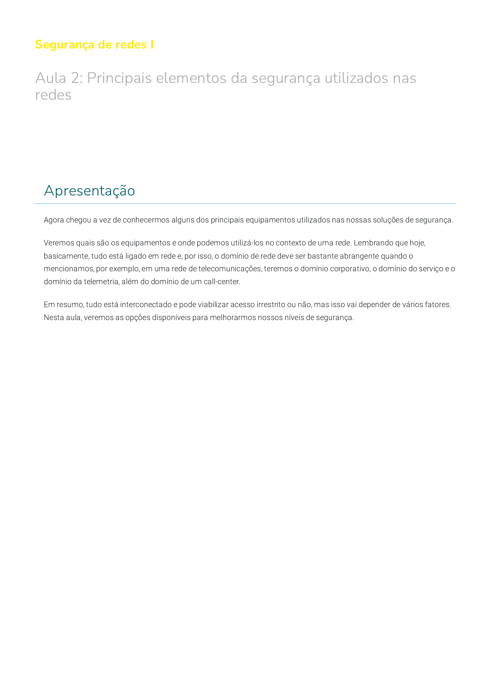 Segurança de redes I Aula 2: Principais elementos da segurança utilizados nas redes Apresentação Agora chegou a vez de conhecermos alguns dos principais equipamentos utilizados nas nossas soluções de segurança. Veremos quais são os equipamentos e onde podemos utilizá-los no contexto de uma rede. Lembrando que hoje, basicamente, tudo está ligado em rede e, por isso, o domínio de rede deve ser bastante abrangente quando o mencionamos, por exemplo, em uma rede de telecomunicações, teremos o domínio corporativo, o domínio do serviço e o domínio da telemetria, além do domínio de um call-center. Em resumo, tudo está interconectado e pode viabilizar acesso irrestrito ou não, mas isso vai depender de vários fatores. Nesta aula, veremos as opções disponíveis para melhorarmos nossos níveis de segurança. Objetivos Listar as opções de elementos de segurança; Descrever os elementos de segurança de redes e suas funções – firewall camada 3 e 4, firewall camada 7, IDS e IPS, roteador com ACL. Elementos aplicados à segurança na rede A cada dia, vemos surgir novas soluções de hardware e software, com seus protocolos peculiares ou de padrão aberto, para serem implementados como resposta às demandas por um ambiente cada vez mais seguro e como solução para problemas que até então não haviam sido encarados como problemas de segurança. O mundo está cada vez mais conectado. Áreas, setores e tecnologias, até então consideradas seguras e sem riscos, agora estão são classificadas como ameaçadas em função de sua exposição a ataques ou invasões, pois seu domínio ou contexto de rede passou a ser exposto e por isso, em função da sua integração ou da necessidade de sua interconexão, deveremos realizar uma aplicação de procedimentos para tornar o ambiente seguro e controlado. Para prosseguirmos nesta aula, vale chamar atenção para o conceito de dois termos citados no parágrafo anterior, são eles: Interconexão É no nosso contexto, a ligação ou a relação entre duas ou mais redes, entre dois ou mais, sistemas etc. Integração É no nosso contexto, a ação, o processo ou o resultado de assimilar completamente um domínio ou contexto de rede ou sistema formando um único contexto resultante. Por hywards (Fonte: Shutterstock). Hoje em dia, há uma grande variedade de processos, hardware e softwares para utilizarmos nos nossos processos de segurança de rede. Novas tecnologias de rede surgem dia após dia e verificamos que, na mesma proporção, cresce o número de novos dispositivos destinados ao aspecto de se construir um ambiente mais seguro e mais bem guardado e monitorado, respeitando políticas mais robustas. Sobre o aspecto da usabilidade de recursos para que possamos estruturar uma arquitetura segura, podemos destacar a possibilidade de empregarmos os seguintes elementos de rede nesta tarefa: Firewalls: convencionais ou Next Generation. IDS2’s e IPS’s. Roteadores portando ACL’s ou softwares de segurança embarcados. Softwares de antivírus nos desktops. Camadas de segurança adaptadas com softwares especializados para Hardering de ambiente. Exemplo: Uso do Bastille Linux. Ferramentas de autenticação: Hardwares e softwares. Construção de sistemas de acesso remoto com tunelamento criptografado. Uso de mecanismos (hardware e software) de criptografia. A utilização de todos ou parte deles, acima citados, terá uma dependência direta do contexto que se desenvolverá na ocasião da demanda. Não há uma regra de ouro ou a chamada “receita de bolo” para que possamos construir uma arquitetura adequada. A melhor arquitetura é a aquela que desenvolver para a situação um domínio mais robusto e complexo, dotando o contexto de um poder de segurança capaz de combater os possíveis sinistros. Nesse momento de nossa aula, cabe ressaltar que o processo de exposição, em muitos casos, é necessário e se dá devido ao próprio serviço criado e ao posicionamento da rede no cenário da comunicação que construímos. A exposição, portanto, muitas vezes faz parte da questão e não podemos evitá-la, mas devemos nos assegurar de que, por conta dessa exposição, não teremos um processo de sinistro de rede. Para isso, criamos nossas barreiras de segurança, utilizando o que temos disponível no mercado aliado a procedimentos construídos junto às áreas de processos internos da empresa. Modelo de referência para assuntos de gerenciamento de rede – FCAPS O acompanhamento constante da rede deve ser uma meta realizada e não um desejo a realizar. A rede deve ser sistematicamente acompanhada em todos os seus aspectos peculiares. Pensando nisso, a ISO criou o seu modelo de referência para assuntos de gerenciamento de rede, denominado FCAPS. Ele é dividido em cinco disciplinas básicas e fundamentais que desenham a organização das estruturas técnica e operacionais para que o seu ambiente possa ser acompanhado sistematicamente. No FCAPS, as equipes estarão distribuídas entre as cinco disciplinas, ou áreas funcionais, de acordo com o seu nível de competência, responsabilidade e operacionalidade da rede. Gerenciamento de Falhas; Gerenciamento de Configurações; Gerenciamento de Contabilidade; Gerenciamento de Desempenho; Gerenciamento de Segurança. Desse modelo elaborado pela ISO, nascem as cinco áreas funcionais de todo e qualquer universo de uma estrutura padrão de gerenciamento de rede. A seguir, veja detalhadamente cada uma dessas áreas: Clique nos botões para ver as informações. Área especializada na detecção, no isolamento, na notificação e na correção de falhas em uma infraestrutura de rede, de serviço ou privada. Gerência de Falhas Área especializada pelo registro e pela manutenção dos parâmetros de configuração dos serviços desenvolvidos e providos por uma infraestrutura de rede, os quais vão desde versões de hardware e de software a configurações de portas de equipamentos. Gerência de Configur