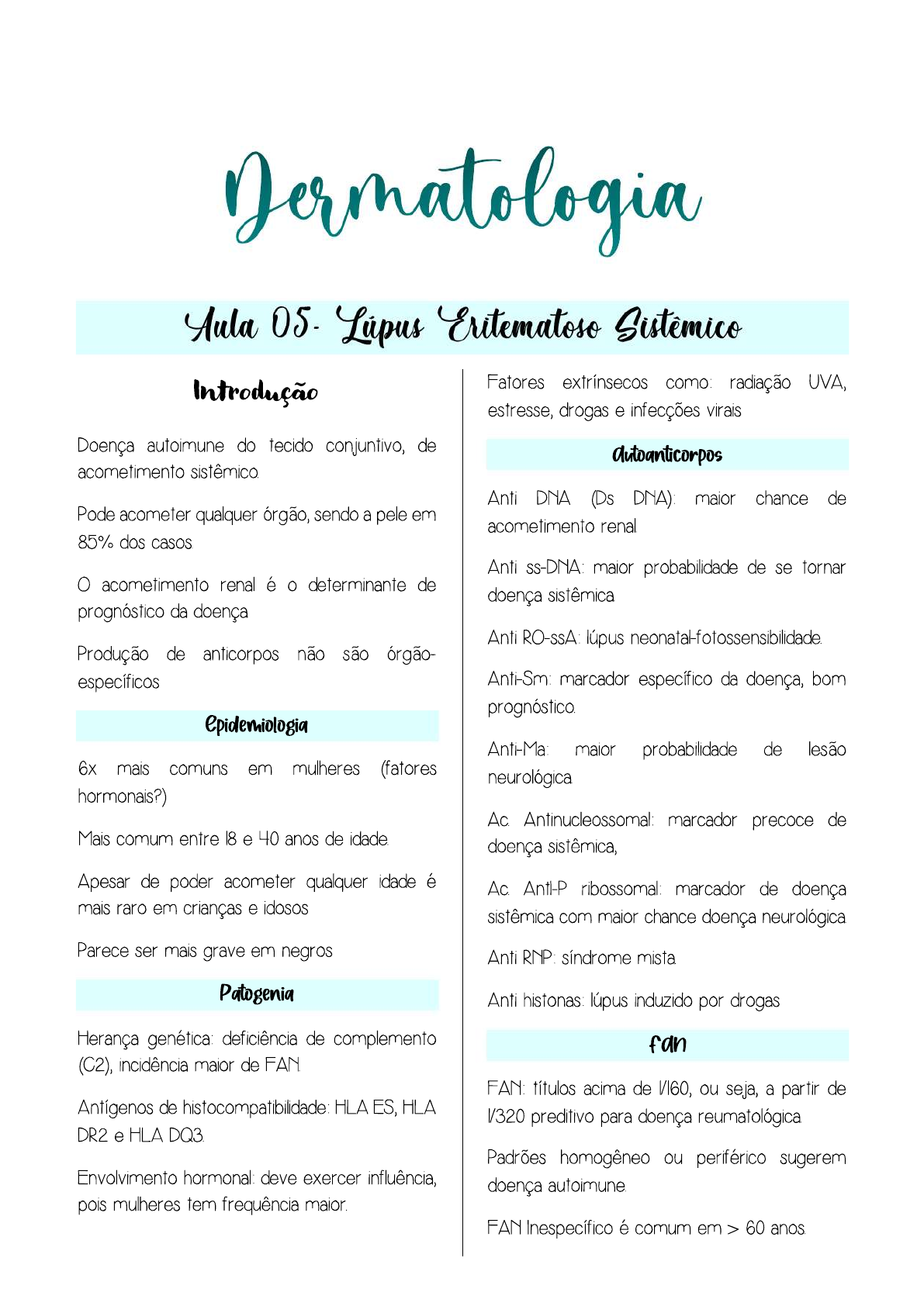 Dermatologia Aula 05- Lupus Eritematoso Sistemico Introdução Fatores extrínsecos como: radiação UVA, estresse, drogas e infecções virais Doença autoimune do tecido conjuntivo, de acometimento sistêmico Anti DNA (Ds DNA): maior chance de Pode acometer qualquer órgão, sendo a pele em acometimento renal 85% dos casos Anti maior probabilidade de se tornar O acometimento renal é O determinante de doença sistêmica prognóstico da doença Anti lúpus neonatal-fotossensibilidade Produção de anticorpos não são órgão- específicos Anti-Sm: marcador específico da doença, bom epidemiologia maior probabilidade de lesão 6x mais comuns em mulheres (fatores neurológica hormonais?) Ac marcador precoce de Mais comum entre 18 e 40 anos de idade. doença sistêmica, Apesar de poder acometer qualquer idade é Ac ribossomal: marcador de doença mais raro em crianças e idosos sistêmica com maior chance doença neurológica Parece ser mais grave em negros Anti RNP: síndrome mista Patogenia Anti histonas: lúpus induzido por drogas Herança genética: deficiência de complemento fan (C2), incidência maior de FAN FAN: títulos acima de 1/160, ou seja, a partir de Antígenos de HLA ES, HLA 1/320 preditivo para doença reumatológica DR2 e HLA DQ3 Padrões homogêneo ou periférico sugerem Envolvimento deve exercer influência, doença pois mulheres tem frequência maior. FAN Inespecífico é comum em > 60 anosSistema Complemento Lupus Via consome Clq e C4. Crônico Via alternativa: consome Ocorre na proporção de duas mulheres para C2 - deficiência congênita homem Deficiência de C3: lesão renal É a forma clínica que menos representa doença Consumo de C4 no lesão do SNC sistêmica (5 a Outras alterações laboratoriais Lesões discoides Anemia Erupções cutâneas geralmente face, cabeça e pescoço, podendo outras áreas como mãos e Leucopenia Trombocitopenia Eritema, infiltração, escamas aderidas e as vezes com espiculas córneas que penetram folículos Hpergamaglobulinemia Dosar anticorpo anti-fosfolípide Deixam atrofia cicatricial e telangectasias, Falso VDRL+ Pode acometer a mucosa, formando lesões VHS (atividade da doença) circulares eritematosas com centro Urina Fenômeno de Raynaud (cianose de extremidade Ureia devido a vasoconstrição) Creatinina Quase todos OS pacientes começam com uma formas clínicas lesão acastanhada na orelha (lóbulos e dentro do pavilhão) Lúpus Eritematoso Cutâneo Crônico (LECC) Pode ter padrão verrucoso (associado à Lúpus Eritematoso Cutâneo Subagudo (LECSA) tabagismo de longa data). Lúpus Eriteratoso Sistêmico (LES) ou Cutâneo Eventualmente, há eritema bimalar, podendo ser Agudo (LECA) de padrão Lúpus Eritematoso Induzido par drogas Outra variante, quando a doença se extende à Lúpus Eritematoso Neonatal hipoderme, é a paniculite lúpica (lobular), em que O lóbulo da gordura está inflamado.Lupus |- Eritema malar 2- Lesões discoides Subagudo (LECSA) 3- Fotossensibilidade Úlceras orais ou nasais Mais de 80% dos casos estão relacionados à 5- Artrite exposição solar (fotossensibilidade) 6- Serosite 7- Nefrite (comprometimento renal) Lesões pápulo-escamoso psoriasiforme. 8- Alterações neurológicas Lesões anulares policíclicas, não cicatriciais 9- Alterações hematológicas 10- Alterações Imunológicas Geralmente bom prognóstico. Anticorpos nucleares Acometimento renal brando e pouco comum, induzido por drogas Autoanticorpo Anti-Ro Hidralazina Padrão numular eritematosas e descamativas, Procainamida que pioram muito com a exposição solar Geralmente, ocorrem mais em tronco e áreas Psoralênicos Quinidina Lupus Isoniazida (LES) Metildopa Eritema malar Captopril Lesões maculosas ou papulosas difusas Carbamazepina Lesões bolhosas Hindatoína Peniclimanina Queda dos cabelos com alopecia difusa Telangectasias peringueais Tetracilinas Febre Neonatal Mal-estar Autoanticorpo materno IgG, Artralgias Lesões cutâneas muito semelhantes às Ulcerações, petéquias e púrpuras no palato duro observadas no LES Lesões líquen símile na mucosa jugal Recém-nascidos de mães portadoras de LES, surgindo logo após nascimento ou após Critérios para definição de Les exposição à radiação ultravioleta 4 DOS CRITÉRIOS FECHAM 0 DIAGNÓSTICO:Lesões em áreas fotoexpostas, como máculas Biológicos com aspecto promissor. ou pápulas eritematosas anulares ou policíclicas, transitória Podem estar presentes pápulas e placas crostosas, além de As lesões cutâneas regridem espontaneamente, em geral do 3° ao 6° mês de idade, época em que OS anticorpos maternos, transmitidos via transplacentária à criança, são metabolizados Anti bloqueio Anti La: lesões cutâneas Histologia Imunoflorescência O depósito se dá ao longo da agressão e, no caso, predominam ou C3. Tratamento Fotoproteção Corticoides tópicos Cloroquina 250 a 500 mg/dia ou Hidroxicloroquina 400 mg/dia (diminuem a fotos sensibilidade) Prednisona 0,5 a mg/kg/dia Ciclofosfamida 50 a 100 mg/dia (pode substituir O corticoide depois que a doença estiver estabilizada) Azatioprina 50 mg/dia Vasodilatadores (Nifedipina 20 a 60 mg/dla, Pentoxifilina 400 mg/dia) Pulsoterapia com corticoterapia (doses mais elevadas) Metotrexate (imunossupressor)