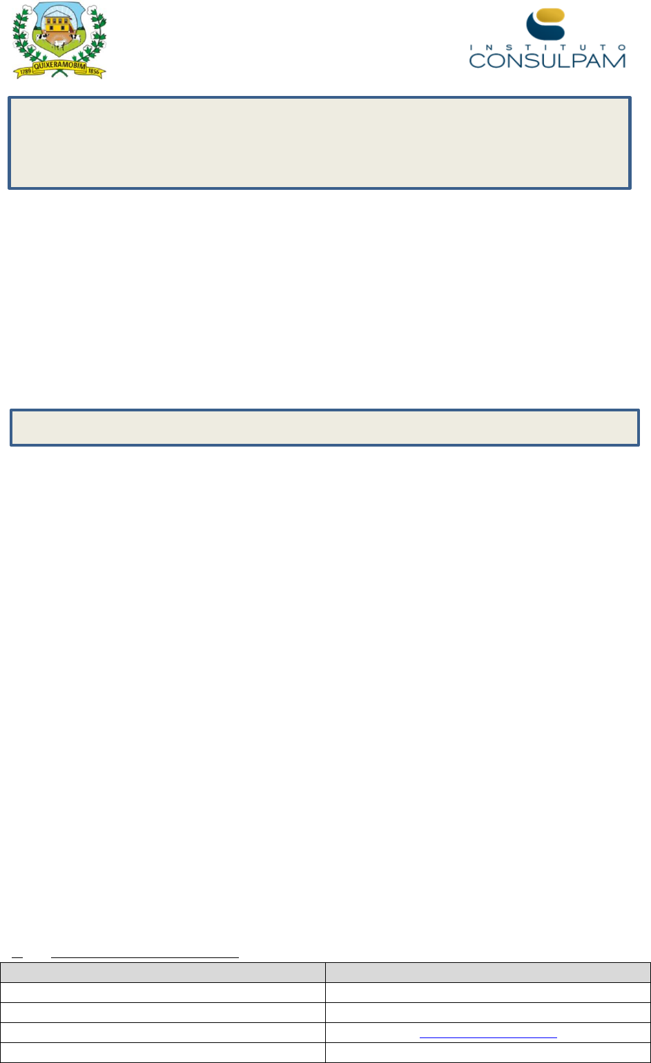 1 ESTADO DO CEARÁ MUNICÍPIO DE QUIXERAMOBIM EDITAL DO CONCURSO PÚBLICO Nº 002/2025 O Município de QUIXERAMOBIM-CE, com sede situada na Rua Doutor Álvaro Fernandes, 36/42 - Centro, Quixeramobim - CE, neste ato representada pelo Presidente da Comissão deste Concurso Público, Ilmo. Sr. FRANCISCO ANTÔNIO CAETANO DE CASTRO, no uso de suas atribuições legais, torna público que estarão abertas as inscrições para o Concurso Público de Prova Objetiva destinado às vagas declaradas para o seu quadro de pessoal permanente, conforme vagas indicadas no Anexo I, que é parte integrante deste edital. A prova seletiva teórico-objetiva, objeto do presente edital, é eliminatória e classificatória e terá a coordenação técnico-administrativa do Instituto Consulpam – Consultoria Público-Privada. O Concurso Público reger-se-á nos termos da legislação vigente, em obediência ao inciso II do artigo 37 da Constituição da República de 1988, e pelas normas contidas neste edital. CAPÍTULO I - DAS DISPOSIÇÕES PRELIMINARES 1. O Concurso Público será regulado pelas normas do presente edital e seus anexos que, juntos, compõem o Manual do Candidato, cujo teor terá peso de regulamento para a Prefeitura Municipal de QUIXERAMOBIM e para os candidatos, além de serem respeitados os princípios gerais do Direito Administrativo. Acompanham o presente edital, sendo dele partes componentes, os seguintes anexos: a) ANEXO I – Relação dos cargos do Concurso Público, número de vagas, vencimento-base, carga horária e escolaridade; b) ANEXO II – Quadro de Provas; c) ANEXO III – Programa das provas do Concurso Público 002/2025; d) ANEXO IV – Atribuições do Cargo; e) ANEXO V – Fórmulas - Pontuação Final; f) ANEXO VI – Declaração de Solicitação de Condição Especial; g) ANEXO VII – Formulário para Recursos; h) ANEXO VIII – Requerimento para isenção de pagamento das inscrições. 2. O concurso destina-se ao preenchimento das vagas existentes no quadro funcional permanente da Prefeitura Municipal de QUIXERAMOBIM, cujo número de vagas, código do cargo, carga horária, vencimentos e requisitos para investidura constam no Anexo I. 3. O prazo de validade do concurso será de 2 (dois) anos contados da data de sua homologação, podendo, por ato expresso do Poder Executivo, ser prorrogado uma única vez por igual período, desde que não vencido o primeiro prazo, conforme o artigo 37, inciso III da Constituição Federal. 4. O cronograma das atividades desenvolver-se-á com a estimativa de datas previstas no quadro a seguir. Este cronograma poderá ser alterado em face de motivação de caso fortuito ou de força maior. 5. CRONOGRAMA DAS ATIVIDADES ATIVIDADE DATAS E PRAZOS Divulgação do Edital 05 de fevereiro de 2025 Período de inscrição 06 de fevereiro a 02 de março de 2025 Local de inscrição www.consulpam.com.br Solicitação de isenção 06 a 08 de fevereiro de 2025 http://www.consulpam.com.br/ 2 Resultado preliminar da solicitação de isenção da taxa de inscrição 14 de fevereiro de 2025 Recursos contra o resultado da solicitação de isenção da taxa de inscrição 17 e 18 de fevereiro de 2025 Resultado pós-recurso da solicitação de isenção da taxa de inscrição 25 de fevereiro de 2025 Solicitação de atendimento diferenciado e entrega de laudo médico para comprovação de candidato com deficiência e/ou do atendimento diferenciado 06 de fevereiro a 02 de março de 2025 Resultado preliminar da solicitação de inscrição regular, da condição de candidato com deficiência e/ou do atendimento diferenciado 10 de março de 2025 Recurso contra o resultado preliminar da solicitação de inscrição regular, da condição de candidato com deficiência e/ou do atendimento diferenciado 11 e 12 de março de 2025 Homologação dos candidatos pagos e relação dos candidatos inscritos como pessoa com deficiência, correções de dados e informações do candidato 19 de março de 2025 Divulgação do horário da prova e local 31 de março de 2025 Data da Prova Objetiva 06 DE ABRIL DE 2025 (Com possibilidade de prova nos Turnos Manhã e Tarde) Gabarito preliminar da prova objetiva 07 de abril de 2025 Recurso contra o gabarito preliminar 08 e 09 de abril de 2025 Gabarito pós-recursos 16 de abril de 2025 Resultado preliminar da prova objetiva 22 de abril de 2025 Recurso contra o resultado preliminar da prova objetiva 23 e 24 de abril de 2025 Resultado pós-recursos da prova objetiva 02 de maio de 2025 Resultado preliminar da prova discursiva 16 de maio de 2025 Recurso contra o resultado preliminar da prova discursiva 19 e 20 de maio de 2025 Resultado pós recurso da prova discursiva 27 de maio de 2025 Período reservado para envio de títulos (on-line) 28 a 30 de maio de 2025 Resultado preliminar da Prova de Títulos 06 de junho de 2025 Recurso contra o resultado preliminar da prova de títulos 09 e 10 de junho de 2025 Resultado Pós – recurso e Resultado Final da Prova de Títulos 17 de junho de 2025 Resultado Final 18 de junho de 2025 Homologação Final 20 de junho de 2025 *As datas acima podem ser alteradas de acordo com a necessidade e conveniência, com a publicação de edital para amplo conhecimento. 3 CAPÍTULO II - DAS INSCRIÇÕES 1. As inscrições estarão abertas no período de acordo com o cronograma das atividades, disponível neste edital e atualizado no site www.consulpam.com.br. 1.1. O pagamento da taxa de inscrição somente poderá ser feito por meio de pagamento de boleto bancário gerado no período de inscrições no site www.consulpam.com.br. Não serão consideradas inscrições cujos boletos forem gerados e/ou pagos fora do período estipulado em edital. 1.2. O candidato poderá efetuar inscrição em mais de um cargo, desde que haja compatibilidade de horário para a realização das provas entre eles, havendo incompatibilidade, deverá optar por apenas um dos que coincidirem. Inscrições Valor Nível Superior R$ 45,00 2. O