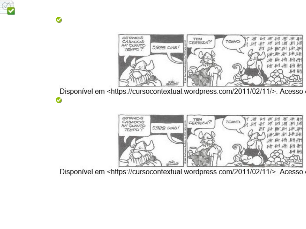 Estudos disciplinares IX Questionário UI Pergunta 1 •0,5 em 0,5 pontos A linguagem é constituída de palavras faladas e escritas e também de imagens, sons, gestos, entre outros. A linguagem verbal refere-se, então, às línguas naturais. Indique a alternativa em que há linguagem sincrética. Resposta Selecionada: a. Respostas: a. b. O uso da escrita marcou a civilização moderna, principalmente a partir da invenção da imprensa, por volta de 1450, por Gutemberg, que pelo uso das letras móveis tornou possível a reprodução rápida de textos escritos, anteriormente copiados à mão. c. Quando você vê um capítulo de novela na televisão, você ouve a fala das personagens e uma música de fundo. Simultaneamente, vê um cenário e o vestuário das personagens. As cores do cenário, a iluminação do espaço, os gestos e as expressões dos atores contribuem para a construção do significado. d. Nos dias atuais surgem novos gêneros textuais, como o e-mail, os chats (salas de bate-papo) e os fóruns online (espaços de opinião e debate) que apresentam linguagem escrita e linguagem oral. e. “Amor é fogo que arde sem se ver, É ferida que dói e não se sente, É um contentamento desconte, É dor que desatina sem doer.” Comentário da resposta: Resposta: A Comentário: A linguagem verbal consiste em produção de texto verbal, ou seja, o texto é constituído de palavras de uma língua natural, seja ela portuguesa, inglesa ou chinesa. No caso do texto da alternativa A o texto é sincrético porque é formado por mais de uma linguagem: a imagem e as palavras. • Pergunta 2 •0,5 em 0,5 pontos A linguagem não verbal consiste em sistema único, sem relação com a língua nem com junção de sistemas. Assim, qual texto a seguir é formado por sistema não verbal? Resposta Selecionada: c. . Respostas: a. b. . c. . d. . e. Nos dias atuais surgem novos gêneros textuais, como o e-mail, os chats (salas de bate-papo) e os fóruns online (espaços de opinião e debate) que apresentam linguagem escrita e linguagem oral. Comentário da resposta: Resposta: C Comentário: O único texto não verbal é a placa, constituída por apenas um único sistema de linguagem; no caso, a imagem. Os textos A, B e D são sincréticos, pois têm mais de um sistema de linguagem (imagem, palavra). O texto E tem apenas um sistema de linguagem, o verbal. • Pergunta 3 •0,5 em 0,5 pontos Observe as imagens e analise as afirmativas a seguir. I- As imagens são textos não verbais por se constituírem de apenas um único sistema de linguagem: a imagem visual. II- As imagens configuram-se pela oposição natureza x cultura, uma vez que o corpo nu representa elemento natural e as vestimentas, os arranjos dos cabelos, entre outros aspectos, representam a cultura. III- A nudez passa a ser o nu articulado com valores culturais nas imagens. Está correto o que se afirma em Resposta Selecionada: a. I, II e III. Respostas: a. I, II e III. b. I apenas. c. II apenas. d. III apenas. e. I e III apenas. Comentário da resposta: Resposta: A Comentário: A nudez não tem o caráter de corpos simplesmente despidos. Nos textos não verbais o leitor depara-se com a intervenção e o ponto de vista de uma cultura. Portanto, todas as afirmativas estão corretas. • Pergunta 4 •0 em 0,5 pontos Observe a imagem a seguir. Sobre o conteúdo da imagem, podemos classificar o texto como: I- Valorização prática, ou seja, o conteúdo relaciona-se com os valores utilitários. II- Valorização lúdica, uma vez que é a representação do corpo humano para o público infantil. III- Valorização utópica, isto é, o conteúdo da imagem aborda valores existenciais, representados pela foto de uma pessoa de destaque na mídia. Está correto o que se afirma em Resposta Selecionada: d. I apenas. Respostas: a. I e II apenas. b. I e III apenas. c. II e III apenas. d. I apenas. e. II apenas. • Pergunta 5 •0,5 em 0,5 pontos Analise as afirmativas a seguir. I- O contorno é o principal aspecto da arte linear. II- O sentido e a beleza dos objetos na pintura linear são vistos – em primeiro plano – no contorno. III- Os olhos do observador são levados às linhas que definem o objeto, deixando evidente os limites da imagem. Dizem respeito às características da pintura linear apenas Resposta Selecionada: e. I, II e III Respostas: a. I b. II c. III d. I e II e. I, II e III Comentário da resposta: Resposta: E Comentário: A pintura linear tem a disposição de imagens representadas em planos, as formas fechadas pelas linhas, a pluralidade de elementos descontínuos e a clareza na disposição. • Pergunta 6 •0,5 em 0,5 pontos Em texto não verbal Resposta Selecionada: c. existe relação entre conteúdo e expressão. Respostas: a. é mais relevante o entendimento do conteúdo. b. é mais relevante o entendimento da expressão. c. existe relação entre conteúdo e expressão. d. não se considera a expressão no texto não verbal. e. o conteúdo corresponde exclusivamente à forma como o texto é interpretado, com base na parte verbal. Comentário da resposta: Resposta: C Comentário: Em texto não verbal, constituído por apenas um sistema de linguagem, ocorre a relação entre o plano de conteúdo e plano de expressão. • Pergunta 7 •0,5 em 0,5 pontos Leia a tirinha: Sobre a tirinha, indique a afirmação falsa. Resposta Selecionada: c. A imagem supera em entendimento. Respostas: a. A palavra e a imagem complementam-se. b. O humor no último quadro é entendido pela interação verbal e pela imagem. c. A imagem supera em entendimento. d. A forma animal – urubu – não pode ser substituída por outro bicho para não corromper o sentido do texto. e. A tirinha é um texto sincrético. Comentário da resposta: Resposta: C Comentário: A tirinha é um texto sincrético, ou seja, constituído por mais de um sistema de linguagem: imagem e palavra. Nesse sentido, a imagem, então, é complementar ao texto verbal, não havendo re