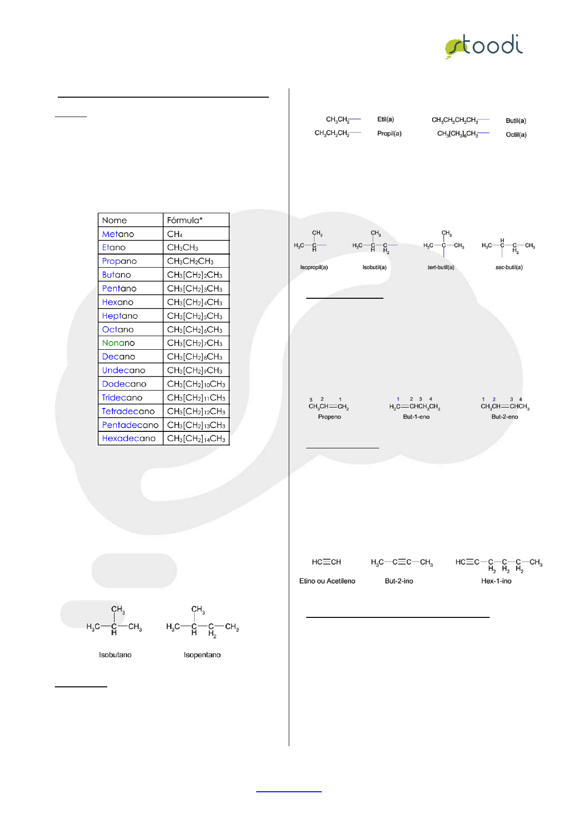 NOMENCLATURA ORGÂNICA Copyright © 2015 Stoodi Ensino e Treinamento à Distância www.stoodi.com.br 1 AULA 1 – NOMENCLATURA DE HIDROCARBONETOS Alcanos Alcanos não ramificados Alcanos não ramificados também são conhecidos como alcanos normais. Com exceção dos quatro primeiros alcanos (metano, etano, propano e butano) os alcanos com maior número de carbonos são formados por um prefixo grego seguido da terminação ano. * O uso de colchetes [ ] serve para inserir unidades que se repetem e ( ) são usados para ramificações. Nona: prefixo latino. Alcanos ramificados São aqueles que apresentam grupos (substituintes) ligados a uma cadeia maior, também chamado erroneamente de radicais por alguns autores do ensino médio. A IUPAC ainda aceita nomes não-sistemáticos de alguns compostos, tais como: Substituintes O nome dos substituintes derivados de alcanos não ramificados é caracterizado pelo nome do alcano original substituindo a terminação –ano pela terminação – il ou - ila. Exemplos: O substituinte de três carbonos ligado à cadeia principal pelo átomo central, recebe o nome de isopropil(a). Para o substituinte de quatro carbonos, além do grupo butil(a), existem mais três possibilidades (todos aceitos pela IUPAC). Alcenos (Alquenos) Em geral os alcenos são nomeados a partir dos nomes dos alcanos correspondentes, trocando a terminação – ano por – eno (uma ligação dupla), - adieno (duas ligações duplas), - atrieno (três ligações duplas). A posição da dupla é indicada por um número colocado imediatamente antes das terminações. A numeração da cadeia se dá pela extremidade que fornecer o menor número da posição. Alcinos (Alquinos) Similarmente aos alcenos, o nome do alcino não ramificado é dado pela substituição do sufixo ano (do alcano correspondente) por - ino, - adiino (duas triplas), - atriino(três triplas), etc. Os sufixos são antecedidos por números que indicam as posições das triplas ligações. Novamente, a numeração se dá pela extremidade que forneça o menor número da posição. Hidrocarbonetos com duplas e triplas ligações São nomeados a partir do alcano correspondente, substituindo-se a terminação –ano por –enino, -adienino, - atrienino, etc.. Os números atribuídos aos carbonos insaturados devem ser os menores possíveis. Escreve-se o sufixo –en antes do –ino. E quando a dupla e a tripla estiverem em posições equivalentes, o menor número será atribuído à dupla. A cadeia principal é sempre aquele que conter o maior número de duplas e triplas ligações. NOMENCLATURA ORGÂNICA Copyright © 2015 Stoodi Ensino e Treinamento à Distância www.stoodi.com.br 2 AULA 2 – HIDROCARBONETOS AROMÁTICOS Hidrocarbonetos aromáticos formam uma classe grande e importante de hidrocarbonetos. O membro mais simples que encontramos é o benzeno (C6H6). C6H6 benzeno Solvente utilizado em laboratório, derivado do petróleo C10H8 naftaleno Constituinte das "bolinhas" Naf tal ina C14H10 antraceno C14H10 fenantreno ou Antraceno e Fenantreno: Compostos produzidos a par tir da queima incopleta de carvão, madeira e combust íveis fósseis. Compõem os HPAs (Hid rocarbonetos Policíclios Aromáticos) polentes atmosf ér icos possivelmente carciongênicos A nomenclatura do benzeno com apenas um substituinte é dada pela simples adição do nome do grupo substituinte à palavra benzeno. Para compostos aromáticos mais substituídos, deve-se numerar o anel benzênico de modo que os grupos assumam os menores conjuntos de números possíveis, respeitando a ordem alfabética. É importante notar que as posições 1,2 – 1,3 – 1,4 dos compostos aromáticos contendo dois grupos substituintes são chamadas respectivamente de posições orto(o), meta(m) e para (p). Alguns destes compostos aromáticos possuem nomes usuais que são muito utilizados no dia-a-dia dos químicos e que valem a pena conhecer. AULA 3 – AROMATICIDADE Critérios para aromaticidade Para que um composto orgânico seja chamado de aromático é preciso que ele obedeça a dois critérios básicos: Possuir um ciclo (anel) plano que contenha elétrons π; Conter número par de elétrons. Podemos utilizar a regra de Hückel para generalizar o critério de aromaticidade: Compostos orgânicos cíclicos ditos aromáticos, possuem anéis planos, contendo 4n + 2 π elétrons, sendo n um número inteiro. Observe abaixo exemplos de hidrocarbonetos aromáticos que seguem a regra de Hückel: NOMENCLATURA ORGÂNICA Copyright © 2015 Stoodi Ensino e Treinamento à Distância www.stoodi.com.br 3 AULA 4 – CONFORMAÇÕES ESPACIAIS DE CICLOEXANOS Nota-se que na natureza os compostos cíclicos geralmente possuem de 5 a 6 átomos de carbono ou de um modo geral, formam anéis de 5 ou 6 seis membros. Por outro lado, compostos de 3 ou 4 membros são bem menos encontrados. Essa observação deriva uma explicação onde se considera que os compostos de 5 e 6 membros são mais estáveis em relação aos de 3 ou 4 membros. Em 1885, o químico alemão Adolf von Bayer propôs que essa instabilidade dos compostos cíclicos de 3 ou 5 membros era devido a uma tensão angular. Para Bayer, quanto mais afastado (maior desvio) do ângulo tetraédrico (109,5°) mais tensão havia entre os átomos ligados para a formação do composto cíclico. O único detalhe e erro cometido por Bayer, fora assumir que todos os compostos cíclicos eram planares que resultaria em inversões daquilo previsto pela tensão angular e o que era realmente encontrado na natureza. Os químicos então entenderam que nem todos os cicloalcanos eram planares, pelo contrário, os compostos se dobram e torcem para adquirir maior estabilidade. Observando de perto o cicloexano podemos verificar que ele existe em duas conformações tridimensionais na natureza: cadeira e barco. A conformação cadeira é mais estável em relação à conformação barco. AULA 5 – GRUPOS SUBSTITUINTES Os grupos substituintes são utilizados p