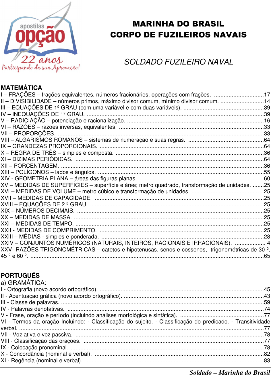 <p>Soldado – Marinha do Brasil</p><p>MARINHA DO BRASIL</p><p>CORPO DE FUZILEIROS NAVAIS</p><p>SOLDADO FUZILEIRO NAVAL</p><p>MATEMÁTICA</p><p>I – FRAÇÕES – frações equivalentes, números fracionários, operações com frações. ...............................17</p><p>II – DIVISIBILIDADE – números primos, máximo divisor comum, mínimo divisor comum. ...........................14</p><p>III – EQUAÇÕES DE 1º GRAU (com uma variável e com duas variáveis). ..................................................39</p><p>IV – INEQUAÇÕES DE 1º GRAU. ..............................................................................................................39</p><p>V – RADICIAÇÃO – potenciação e racionalização. .....................................................................................16</p><p>VI – RAZÕES – razões inversas, equivalentes. ..........................................................................................33</p><p>VII – PROPORÇÕES. ................................................................................................................................33</p><p>VIII – ALGARISMOS ROMANOS – sistemas de numeração e suas regras. ...............................................64</p><p>IX – GRANDEZAS PROPORCIONAIS. ......................................................................................................64</p><p>X – REGRA DE TRÊS – simples e composta. ............................................................................................36</p><p>XI – DÍZIMAS PERIÓDICAS. .....................................................................................................................64</p><p>XII – PORCENTAGEM. ..............................................................................................................................36</p><p>XIII – POLÍGONOS – lados e ângulos. .......................................................................................................55</p><p>XIV - GEOMETRIA PLANA – áreas das figuras planas. .............................................................................60</p><p>XV – MEDIDAS DE SUPERFÍCIES – superfície e área; metro quadrado, transformação de unidades. .......25</p><p>XVI – MEDIDAS DE VOLUME – metro cúbico e transformação de unidades. .............................................25</p><p>XVII – MEDIDAS DE CAPACIDADE. .........................................................................................................25</p><p>XVIII – EQUAÇÕES DE 2 º GRAU. ............................................................................................................25</p><p>XIX – NÚMEROS DECIMAIS. ....................................................................................................................25</p><p>XX – MEDIDAS DE MASSA. ......................................................................................................................25</p><p>XXI – MEDIDAS DE TEMPO. .....................................................................................................................25</p><p>XXII - MEDIDAS DE COMPRIMENTO. ......................................................................................................25</p><p>XXIII – MÉDIAS - simples e ponderada. .....................................................................................................28</p><p>XXIV – CONJUNTOS NUMÉRICOS (NATURAIS, INTEIROS, RACIONAIS E IRRACIONAIS). ................... 4</p><p>XXV- RAZÕES TRIGONOMÉTRICAS – catetos e hipotenusas, senos e cossenos, trigonométricas de 30 º,</p><p>45 º e 60 º. .................................................................................................................................................65</p><p>PORTUGUÊS</p><p>a) GRAMÁTICA:</p><p>I - Ortografia (novo acordo ortográfico). ......................................................................................................45</p><p>II - Acentuação gráfica (novo acordo ortográfico). .......................................................................................43</p><p>III - Classe de palavras. ..............................................................................................................................59</p><p>IV - Palavras denotativas. ..........................................................................................................................74</p><p>V - Frase, oração e período (incluindo análises morfológica e sintática). ....................................................77</p><p>VI - Termos da oração Incluindo: - Classificação do sujeito. - Classificação do predicado. - Transitividade</p><p>verbal. ........................................................................................................................................................77</p><p>VII - Voz ativa e voz passiva. .....................................................................................................................78</p><p>VIII - Classificação das orações. ................................................................................................................77</p><p>IX - Colocação pronominal. ........................................................................................................................78</p><p>X - Concordância (nominal e verbal). .........................................................................................................82</p><p>XI - Regência (nominal e verbal). ...............................................................................................................83</p><p>Apostila Digital Licenciada para Cleiton Pereira Sousa de Oliveira - cleitonpereira007@hotmail.com (Proibida a Revenda)</p><p>Soldado – Marinha do Brasil</p><p>XII - Crase. ............................................................................................................