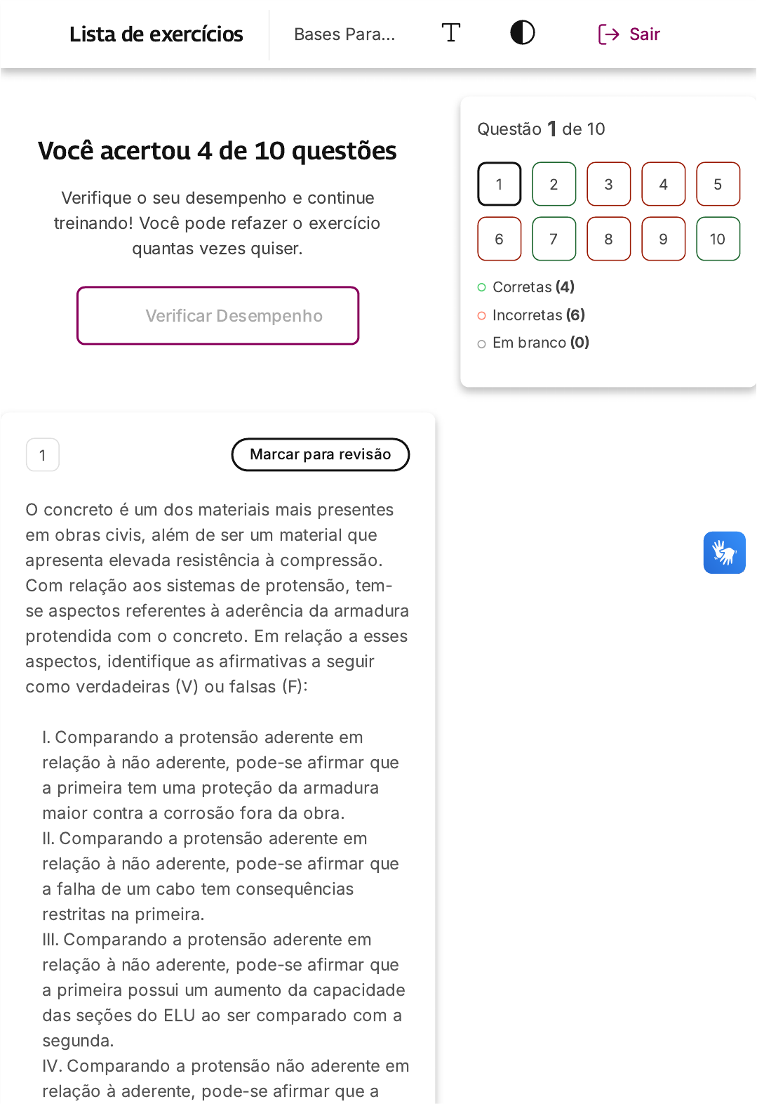 Você acertou 4 de 10 questões Verifique o seu desempenho e continue treinando! Você pode refazer o exercício quantas vezes quiser. Verificar Desempenho 1 Marcar para revisão O concreto é um dos materiais mais presentes em obras civis, além de ser um material que apresenta elevada resistência à compressão. Com relação aos sistemas de protensão, tem- se aspectos referentes à aderência da armadura protendida com o concreto. Em relação a esses aspectos, identifique as afirmativas a seguir como verdadeiras (V) ou falsas (F): I. Comparando a protensão aderente em relação à não aderente, pode-se afirmar que a primeira tem uma proteção da armadura maior contra a corrosão fora da obra. II. Comparando a protensão aderente em relação à não aderente, pode-se afirmar que a falha de um cabo tem consequências restritas na primeira. III. Comparando a protensão aderente em relação à não aderente, pode-se afirmar que a primeira possui um aumento da capacidade das seções do ELU ao ser comparado com a segunda. IV. Comparando a protensão não aderente em relação à aderente, pode-se afirmar que a Questão 1 de 10 Corretas (4) Incorretas (6) Em branco (0) 1 2 3 4 5 6 7 8 9 10 Lista de exercícios Bases Para… Sair A B C D E primeira apresenta perdas por atrito bem baixas. V. Comparando a protensão não aderente em relação à aderente, pode-se afirmar que a primeira elimina a operação de injeção da nata de cimento. Assinale a alternativa que apresenta a sequência correta, de cima para baixo. F - V - V - V - V. V - F - V - F - V. V - V - F - V - V. V - V - V - F - V. F - F - F - V - V. Resposta correta Parabéns, você selecionou a alternativa correta. Confira o gabarito comentado! Gabarito Comentado A primeira afirmativa é falsa, pois a protensão não aderente oferece uma maior proteção da armadura fora da obra, uma vez que os cabos são envolvidos por uma capa plástica. As demais afirmativas são verdadeiras, pois a falha de um cabo tem consequências restritas na protensão aderente, a protensão aderente possui um aumento da capacidade das seções do ELU em comparação com a não aderente, a protensão não aderente apresenta perdas por atrito bem baixas e a protensão não aderente elimina a operação de injeção da nata de cimento. Portanto, a sequência correta é F - V - V - V - V, correspondente à alternativa A. 2 Marcar para revisão A teoria simples de viga determina as tensões normais atuantes em uma viga protendida, considerando um comportamento elástico linear para o material. As tensões atuantes em uma viga protendida podem ser devidas a força de protensão, peso próprio e carregamentos externos. Sobre essas tensões, identifique as afirmativas a seguir como verdadeiras (V) ou falsas (F): I. Uma viga não fissurada e simplesmente apoiada, quando submetida a uma força de protensão axial P, pode-se afirmar que as tensões normais uniformes de compressão são calculadas por meio da força de protensão dividida pela área da seção transversal. II. Para determinar as tensões elástica o cálculo das armaduras ativas e passivas podem influenciar nas propriedades da seção, tais como área e do momento de inércia, se a quantidade de armadura for bastante elevada. III. Quando a densidade de armadura é baixa, para efeito de cálculo das propriedades da seção de uma viga de concreto protendido, ela pode ser desprezada. IV. Os carregamentos externos são apenas as cargas variáveis que atuam em uma estrutura. V. A excentricidade influencia diretamente os valores das tensões elásticas. A B C D E Assinale a alternativa que apresenta a sequência correta, de cima para baixo. V - V- V - F - V. V - F - V - V - V. F - V - F - V - V. F - V - V - F - V. V - V - F - F - V. Resposta correta Parabéns, você selecionou a alternativa correta. Confira o gabarito comentado! Gabarito Comentado 1. Uma viga não fissurada e simplesmente apoiada, quando submetida a uma força de protensão axial P, tem tensões normais uniformes de compressão que são calculadas pela força de protensão dividida pela área da seção transversal. Isto é um procedimento padrão em mecânica dos materiais, então a afirmativa é verdadeira (V). 2. As propriedades da seção de uma viga, como área e momento de inércia, são de fato influenciadas pelas armaduras ativas e passivas. No entanto, a relevância da armadura depende do seu tamanho em relação à seção transversal da viga. Se as armaduras forem suficientemente grandes, elas terão um efeito significativo e não devem ser ignoradas. Portanto, esta afirmativa é verdadeira (V), mas com a ressalva de que a influência depende da quantidade de armadura. 3. Quando a densidade de armadura é baixa, é comum, para efeitos de cálculo, desprezar a sua influência nas propriedades da seção de uma viga de concreto protendido. Isso simplifica os cálculos sem comprometer significativamente a precisão para a maioria das aplicações práticas. Então, essa afirmativa é verdadeira (V). 4. Os carregamentos externos em uma estrutura incluem cargas permanentes (como peso próprio) e cargas variáveis (como tráfego de veículos, neve, vento, etc.). Portanto, afirmar que são apenas as cargas variáveis é falso (F). 5. A excentricidade da força de protensão (distância entre a linha de ação da força de protensão e o centroide da seção transversal) influencia diretamente os valores das tensões elásticas na seção transversal da viga, pois cria um momento fletor que afeta a distribuição de tensões. Esta afirmativa é verdadeira (V). 3 Marcar para revisão A B C O concreto é um dos materiais mais presentes em obras civis, além de ser um material que apresenta elevada resistência à compressão. O concreto armado e o concreto protendido são excelentes soluções estruturais, cada um com suas vantagens e desvantagens. Em relação a esses dois tipos de estrutura, identifique as afirmativas a seguir c