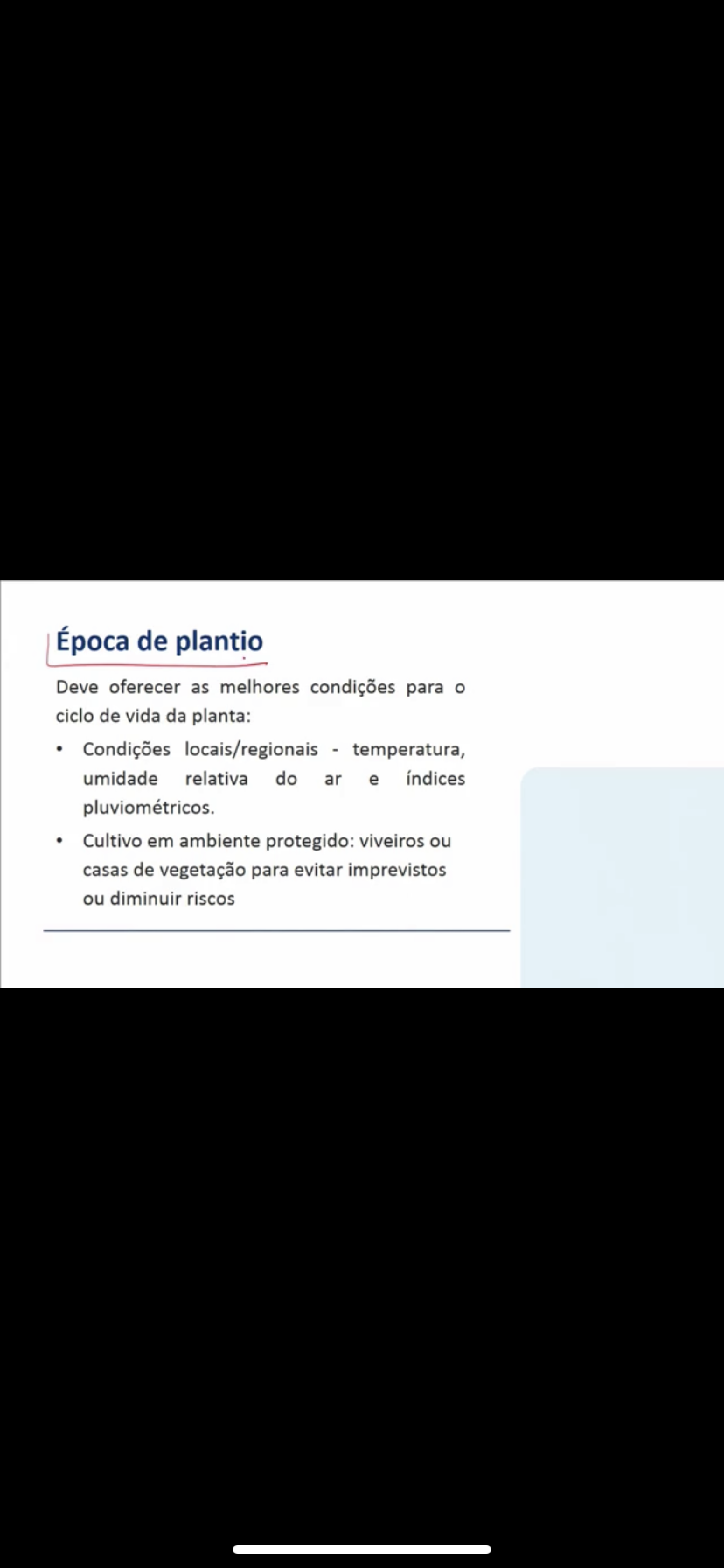 Época de plantio Deve oferecer as melhores condições para ciclo de vida da planta: Condições locais/regionais - temperatura, umidade relativa do ar e índices pluviométricos. Cultivo em ambiente protegido: viveiros ou casas de vegetação para evitar imprevistos ou diminuir riscos