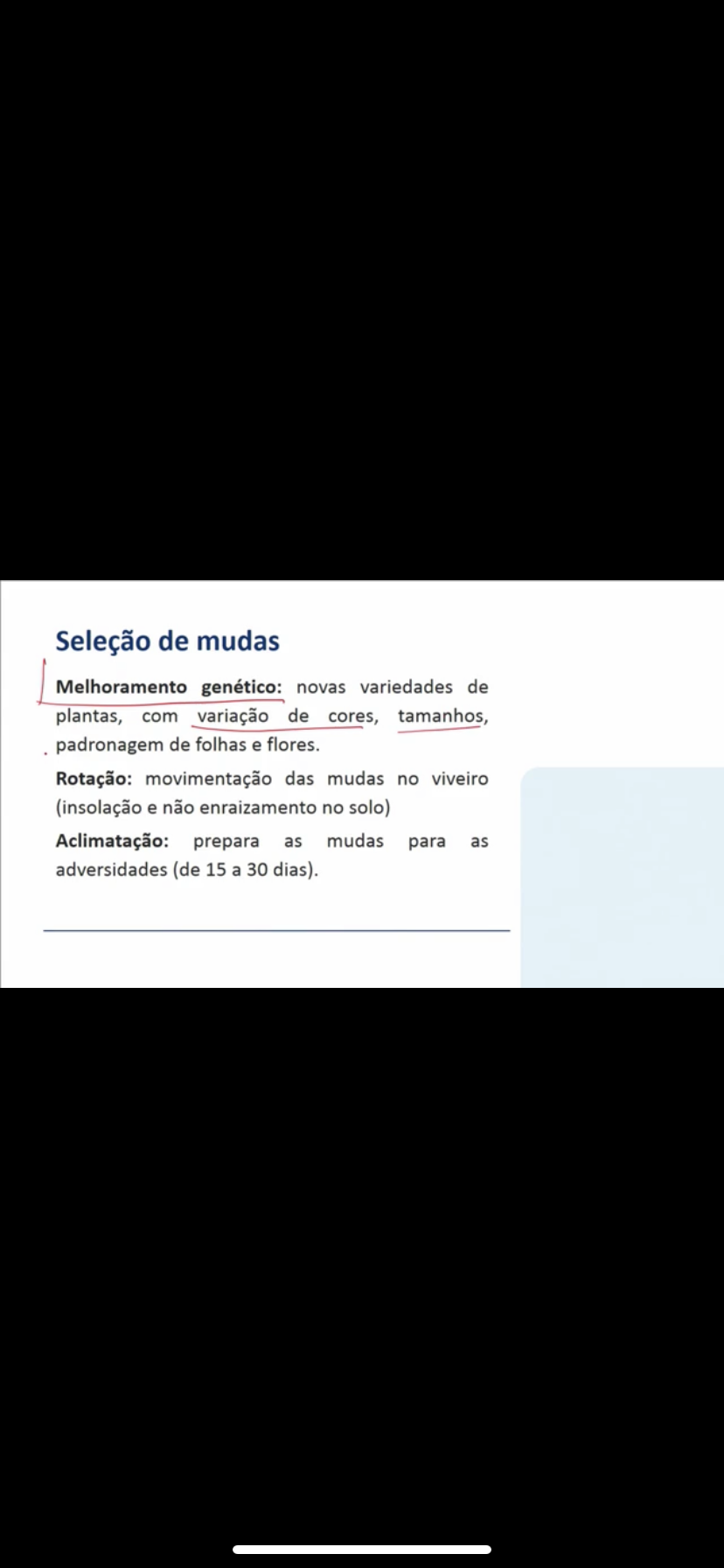 Seleção de mudas Melhoramento genético: novas variedades de plantas, com variação de cores, tamanhos, padronagem de folhas e flores. Rotação: movimentação das mudas no viveiro (insolação e não enraizamento no solo) Aclimatação: prepara as mudas para as adversidades (de 15 a 30 dias).