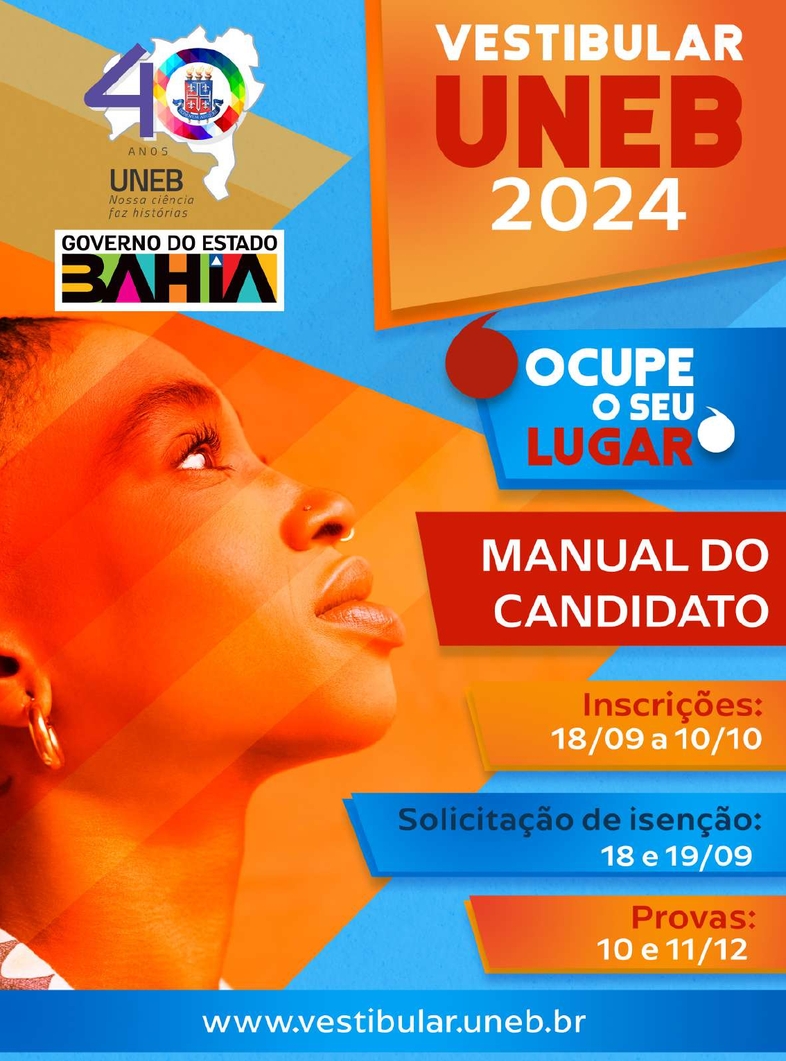 Manual do Candidato Reitora Adriana dos Santos Marmori Lima Vice-Reitora Dayse Lago de Miranda Chefia de Gabinete Pedro Daniel dos Santos Souza Assessoria Especial (ASSESP) Rita de Cássia Chagas Carvalho Procuradoria Jurídica (PROJUR) Décio Luiz Souza De Oliveira Pró-Reitoria de Ensino de Graduação Gabriela Sousa Rêgo Pimentel Pró-Reitoria de Pesquisa e Ensino de Pós-Graduação Tânia Maria Hetkowski Pró-Reitoria de Extensão Rosane Meire Vieira de Jesus Pró-Reitora de Assistência Estudantil Jean da Silva Santos Pró-Reitoria de Ações Afirmativas Dina Maria Rosário dos Santos Pró-Reitoria de Administração Rosângela de Carvalho Matos Pró-Reitoria de Gestão e Desenvolvimento de Pessoas Elias Nunes Dourado Pró-Reitoria de Planejamento Lídia Boaventura Pimenta Pró-Reitoria de Infraestrutura João Silva Rocha Filho Unidade Acadêmica de Educação a Distância Francine Mendes dos Santos Unidade de Desenvolvimento Organizacional Benjamin Ramos Filho Secretaria Especial de Avaliação Institucional (SEAVI) Ivan Luiz Novaes Secretaria Especial de Relações Internacionais (SERINT) Elizeu Clementino de Souza Secretaria Especial de Licitações e Contratos e Convênios (SELCC) Maristela Maria Alves da Silva Secretaria Especial de Articulação Interinstitucional (SEAI) José Ricardo Moreno Pinho Secretaria Especial de Contabilidade e Finanças (SECONF) André Raimundo Cerqueira de Souza Auditoria de Controle Interno (AUCONTI) Kátia Silene Lopes de Souza Albuquerque Editora da Uneb (EDUNEB) Sandra Regina Soares Serviço Médico Odontológico e Social (SMOS) Monique Magnavita Borba da Fonseca Cerqueira Thais Deiró Urpia Lasse Oliveira Ouvidoria Assessoria de Comunicação Wânia Dias Cruz Manual do Candidato MENSAGEM AO CANDIDATO Caríssimo(a) candidato(a), Agradecemos por você ter escolhido a Universidade do Estado da Bahia (UNEB) para o processo seletivo Vestibular 2024 e, com grande alegria, desejamos êxito nessa avaliação. A UNEB desponta como a maior universidade pública do Norte/Nordeste do país, com sua capilaridade multicampi, e a possibilidade de ofertar mais de 150 opções de cursos de graduação em todas as áreas do conhecimento, desenvolver pesquisas de ponta nos cursos de pós-graduação e, ainda, manter uma extensão expressiva e de qualidade em todo o estado da Bahia. Somos uma comunidade acadêmica de aproximadamente 40 mil pessoas, que, cotidianamente, orgulha- se de fazer parte de uma instituição pioneira no sistema de cotas para negros/as, indígenas e para outros marcadores sociais, que constituem a diversidade do povo brasileiro, fato que evidencia e legitima nosso compromisso com a inclusão das pessoas pela participação na educação superior. Venha fazer parte da universidade pública de toda a Bahia, produzir Ciência e contribuir para a construção de um mundo melhor, mais fraterno e humanizado! Adriana dos Santos Marmori Lima Reitora Dayse Lago de Miranda Vice-reitora da UNEB APRESENTAÇÃO Este Manual tem por finalidade oferecer a você, candidato/candidata ao Processo Seletivo Vestibular 2024 da Universidade do Estado da Bahia (UNEB), todas as informações necessárias para a sua participação no certame. Aqui você conhecerá os cursos presenciais oferecidos nos diversos Departamentos e terá acesso aos procedimentos de inscrição, aplicação das provas, critérios de avaliação, apuração dos resultados, eliminação, desempate dos candidatos e matrícula através do Edital 104/2023. Os anexos também são importantes, pois possuem os instrumentos que subsidiam sua inscrição. Universidade do Estado da Bahia – UNEB Centro de Processos Seletivos – CPS Pró-Reitoria de Ensino de Graduação – PROGRAD Manual do Candidato SUMÁRIO I. A Universidade do Estado da Bahia (UNEB) ..........................................................................................7 II. Anexos do Manual...............................................................................................................................08 ANEXO I - Fórmulas utilizadas para apuração dos resultados.................................................................08 ANEXO II - Perfil dos Cursos Oferecidos...............................................................................................09 ANEXO III - Conteúdo Programático.....................................................................................................33 ANEXO IV - Campus / Cidade / Endereço.............................................................................................59 ANEXO V - Quadro de vagas................................................................................................................60 ANEXO VI - Resolução do CONSU nº1.339/2018..................................................................................81 ANEXO VII - Resolução do CONSU nº 2.222/2023...............................................................................82 I. A Universidade do Estado da Bahia (UNEB) Como Universidade Multicampi, para 2024, a UNEB oferece 4.114 vagas para os Cursos Presenciais, assim distribuídas: - 2.466 para candidatos não optantes; - 1.648 para candidatos optantes negros; - 230 sobrevagas para indígenas; - 230 sobrevagas para quilombolas; - 230 sobrevagas para ciganos; - 230 sobrevagas para deficiencia, autistas, altas habilidades; - 230 sobrevagas para transexuais, travestis e trangêneros. 3.000 vagas para os EAD, assim distribuídas: - 1.800 para candidatos não optantes; - 1.200 para candidatos optantes negros; - 176 sobrevagas para indígenas; - 176 sobrevagas para quilombolas; - 176 sobrevagas para ciganos; - 176 sobrevagas para deficiencia, autistas, altas habilidades; - 176 sobrevagas para transexuais, travestis e trangêneros. Os cursos disponíveis neste processo seletivo serão oferecidos em 25 campi, localizados em importantes micro regiões ou polos econômicos do Estado da Bahia, bem como nos polos de apoio p