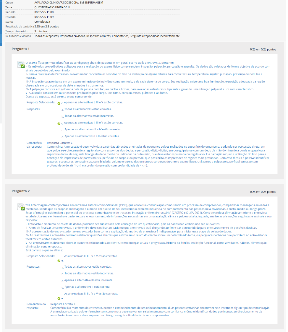 Curso AVALIAÇÃO CLINICA/PSICOSSOCIAL EM ENFERMAGEM Teste QUESTIONÁRIO UNIDADE III Iniciado 08/05/25 11:00 Enviado 08/05/25 11:09 Status Completada Resultado da tentativa 2,25 em 2,5 pontos Tempo decorrido 9 minutos Resultados exibidos Todas as respostas, Respostas enviadas, Respostas corretas, Comentários, Perguntas respondidas incorretamente Pergunta 1 0,25 em pontos o exame físico permite identificar as condições globais do paciente e, em geral, ocorre após a entrevista, portanto: Os métodos propedêuticos utilizados para a realização do exame físico percussão e ausculta. Os dados são coletados de forma objetiva de acordo com sinais percebidos pelo examinador. Para a realização da Percussão, o examinador concentra os sentidos do tato na avaliação de alguns fatores, tais como textura, temperatura, pulsação, presença de nódulos e III A Inspeção caracteriza-se em um exame minucioso do indivíduo como um todo, e de cada sistema do corpo. Sua realização exige uma boa iluminação, exposição adequada da região observada e o uso ocasional de determinados instrumentos. IV- A palpação consiste em golpear a pele da pessoa com toques curtos e firmes, para avaliar as estruturas subjacentes, gerando uma vibração palpável e um som A ausculta consiste em ouvir os sons produzidos pelo corpo, tais como, vasos, pulmões e abdome Diante do exposto, está correto o que Resposta Selecionada: Apenas as alternativas III V estão Respostas: a. Todas as alternativas estão b. Todas as alternativas estão Apenas as alternativas I, III estão d. Apenas as alternativas e IV estão Apenas as alternativas e estão Comentário Resposta Correta: da resposta: Comentário: A percussão é desenvolvida a partir das vibrações originadas de pequenos golpes realizados na superfície do organismo, podendo ser percussão em que golpeia-se diretamente a região alvo com as pontas dos dedos, e percussão dígito-digital, em que golpeia-se com um dedo da mão dominante a borda ungueal ou a superfície dorsal da segunda falange do dedo médio ou indicador da outra mão, que deve estar espalmada na região E a palpação requer a utilização do tato para a obtenção de impressões de partes mais superficiais do corpo e da que possibilita as impressões de regiões mais profundas. Com essa técnica é possível identificar texturas. espessuras, volume e dureza das estruturas corporais durante o exame Utilizamos a palpação superficial (pressão com profundidade de até 1 cm) e a profunda (pressão com profundidade de 4 cm). Pergunta 2 0,25 em pontos "Na Enfermagem contemporânea encontramos autores como Stefanelli (1993), que conceitua comunicação como sendo um processo de compreender, compartilhar mensagens enviadas e recebidas, sendo que as próprias mensagens e modo em que se dá seu intercâmbio exercem influência no comportamento das pessoas nela envolvidas a curto, médio ou longo prazo. Estas afirmações evidenciam o potencial do processo comunicativo e de trocas na interação (CASTRO e 2001). Considerando a afirmação anterior e a entrevista estabelecida entre enfermeiro e paciente para o levantamento de informações necessárias em uma avaliação clínica e psicossocial adequada, analise as afirmações seguintes e assinale a sua resposta: Entrevista é sinônimo de coleta de dados, podendo ser substituída pela aplicação de um questionário, pois os dados não verbais não são Antes de finalizar uma enfermeiro deve sinalizar ao paciente que a entrevista está chegando ao fim e dar oportunidade para esclarecimento de possíveis A apresentação do entrevistador ao entrevistado, bem como a explicação do motivo da entrevista é indispensável para iniciar essa etapa de coleta de Ao realizarmos a entrevista podemos elaborar questões abertas que estimulam relato do cliente sobre um determinado tema, ou perguntas fechadas que permitem ao entrevistador focalizar em certos Ao entrevistarmos devemos abordar assuntos relacionados ao cliente, como doenças atuais e pregressas, história da família, avaliação funcional, como atividades, hábitos, eliminação, sono e repouso. Está correto que se afirma: Resposta Selecionada: As alternativas IV e estão a. Todas as alternativas estão b. Todas as alternativas estão Apenas a alternativa III está incorreta. d. Apenas a alternativa está correta. As alternativas IV e estão corretas. Comentário da Resposta Correta: E resposta: Comentário: No momento da entrevista. ocorre estabelecimento de um relacionamento, duas pessoas estranhas encontram-se e instituem algum tipo de A entrevista realizada pelo enfermeiro tem como meta desenvolver um relacionamento com confiança mútua e identificar dados pertinentes ao direcionamento da A entrevista deve superar um diálogo e seguir a finalidade de ser compreensiva.Pergunta 3 0,25 em 0,25 pontos Na verificação dos sinais o cliente adulto jovem apresenta, em repouso, temperatura axilar de 36,4 °C, respiração de 16 respirações/minuto pulso radial de 78 batimentos/minuto pressão sistólica de 120 mmHg e pressão diastólica de 80 Ao analisar esses é correto afirmar que o cliente apresenta-se: Resposta Selecionada: Afebril, eupneico, normocárdico e Respostas: dispneico, normotenso e normocárdico b. eupneico, normotenso e normocárdico Febril, eupneico, hipertenso e normocárdico. Afebril, eupneico, normocárdico e Afebril, eupneico, normotenso e taquicárdico Comentário da Resposta Correta: D resposta: Comentário: Os valores de referência dos sinais vitais para considerarmos dentro da anormalidade são: PA menor ou igual a P 60 90 bpm, R 12 a 20 ipm, Temperatura de 35.8 °C Pergunta 4 em 0,25 pontos A Frequência Respiratória (FR é caracterizada pela quantidade de ventilações que ocorrem em um minuto. Analise as afirmações abaixo referentes à temática: A FR refere-se ao ciclo respiratório completo que é formado pela inspiração e Sua avaliação deve ser composta pela