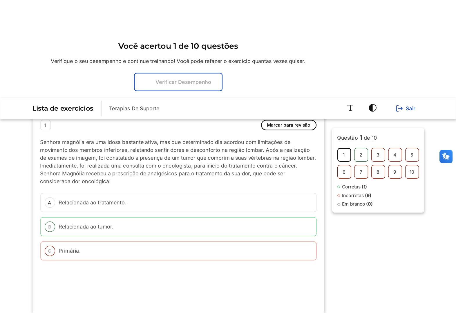 Você acertou 1 de 10 questões Verifique o seu desempenho e continue treinando! Você pode refazer o exercício quantas vezes quiser. Verificar Desempenho A B C 1 Marcar para revisão Senhora magnólia era uma idosa bastante ativa, mas que determinado dia acordou com limitações de movimento dos membros inferiores, relatando sentir dores e desconforto na região lombar. Após a realização de exames de imagem, foi constatado a presença de um tumor que comprimia suas vértebras na região lombar. Imediatamente, foi realizada uma consulta com o oncologista, para início do tratamento contra o câncer. Senhora Magnólia recebeu a prescrição de analgésicos para o tratamento da sua dor, que pode ser considerada dor oncológica: Relacionada ao tratamento. Relacionada ao tumor. Primária. Questão 1 de 10 Corretas (1) Incorretas (9) Em branco (0) 1 2 3 4 5 6 7 8 9 10 Lista de exercícios Terapias De Suporte Sair D E A B C Secundária. Terciária. Resposta incorreta Opa! A alternativa correta é a letra B. Confira o gabarito comentado! Gabarito Comentado As compressões medulares proveniente do crescimento de tumores próximos a medula espinhal representa um enorme risco de paralisias e complicações maiores. Sua abordagem terapêutica deve ser realizada o quanto antes, para minimizar as dores, que neste caso são relacionadas ao tumor. 2 Marcar para revisão Senhor Jonas foi diagnosticado com câncer de próstata, em estágio avançado, já apresentando metástases ósseas e dor oncológica associada. Senhor Jonas iniciou tratamento com fármacos quimioterápicos, opioides fortes para o tratamento da dor e ácido zoledrônico para tratamento da desmineralização óssea associada à metástase. Além desses tratamentos, o paciente iniciou também acupuntura para minimização das dores que sentia, obtendo êxito com a prática. No contexto dos tratamentos oncológicos, a acupuntura é considerada: Uma terapia para reposição de elementos sanguíneos. Uma substituta do tratamento oncológico. Uma prática integrativa e complementar. D E A B C Uma prática sem benefícios clínicos comprovados. Uma estratégia farmacológica contra a dor. Resposta correta Parabéns, você selecionou a alternativa correta. Confira o gabarito comentado! Gabarito Comentado Ao longo dos anos, muitos estudos apresentam acupuntura como uma prática integrativa e complementar associada a redução de quadros dolorosos em pacientes oncológicas. Entretanto, a sua utilização não exime o paciente da realização de terapias convencionais. 3 Marcar para revisão O tratamento contra o câncer de mama evoluiu muito nos últimos anos, sobretudo com a descoberta das ações estrogênicas sobre a proliferação tumoral. Fármacos como o tamoxifeno promovem o bloqueio das ações do hormônio, levando a redução da recorrência dos tumores, mas com o inconveniente de promover dores articulares e ósseas. Esse tipo de dor pode ser considerado: Relacionada ao tratamento. Relacionada ao tumor. Primária. D E A B C Secundária. Terciária. Resposta incorreta Opa! A alternativa correta é a letra A. Confira o gabarito comentado! Gabarito Comentado Muitos tratamentos contra o câncer podem levar ao desenvolvimento de dor aos pacientes. No caso da supressão hormonal, ocorre um estímulo à desmineralização óssea, que está relacionada ao desenvolvimento de quadros dolorosos. 4 Marcar para revisão O bloqueio do plexo celíaco é um procedimento invasivo que promove danos aos nervos celíacos para que eles não sejam capazes de transmitir mensagens de dor ao Sistema nervoso central. Sua utilização é restrita ao tratamento da dor abdominal em pacientes com câncer pancreático. Esta modalidade de tratamento da dor é considerada Leve. Moderada. Intensa. D E A B Farmacológica. Invasiva. Resposta incorreta Opa! A alternativa correta é a letra E. Confira o gabarito comentado! Gabarito Comentado No insucesso de terapias convencionais contra a dor, é possível a realização de tratamentos invasivos, como por exemplo o bloqueio de plexos nervosos. 5 Marcar para revisão Por mais que estejamos diante de grandes evoluções no contexto dos tratamentos oncológicas, a quimioterapia clássica ainda está relacionada a uma série de efeitos adversos que são desconfortáveis e limitando seus pacientes. Sobre os efeitos adversos gastrointestinais, leia as assertivas abaixo: I - Corrobora com a ação antiespasmódica a utilização de fármacos antidiarreicos e fármacos laxativos, com a intenção de reduzir os desconfortos gastrointestinais que os quadros de diarreia e constipação podem induzir em um paciente oncológico. Porque, II - O tratamento dos espasmos gastrointestinais relacionados à quimioterapia com fármacos antagonistas muscarínicos como a atropina são a principal estratégia terapêutica para tratamento antiespasmódico. Marque a alternativa que apresenta a relação correta entre as asserções I e II. Ambas as asserções são verdadeiras, e a asserção II é uma justificativa para a asserção I. Ambas as asserções são verdadeiras, mas a asserção II não é uma justificativa para a asserção I. C D E A B A asserção I é verdadeira e a asserção II é falsa. A asserção I é falsa e a asserção II é verdadeira. Ambas as asserções são falsas. Resposta incorreta Opa! A alternativa correta é a letra B. Confira o gabarito comentado! Gabarito Comentado O interessante da terapia contra o câncer e contra os efeitos adversos do tratamento é a possibilidade de combinar fármacos de diferentes classes para resolução de quadros limitantes à qualidade de vida dos indivíduos. Configura estratégia farmacológica antiespasmódica a utilização de diferentes fármacos diante das condições apresentadas pelos pacientes. Sendo assim, as duas assertivas são verdadeiras e se complementam. 6 Marcar para revisão A utilização de fármacos antieméticos confere conforto aos pacientes em tratamento 