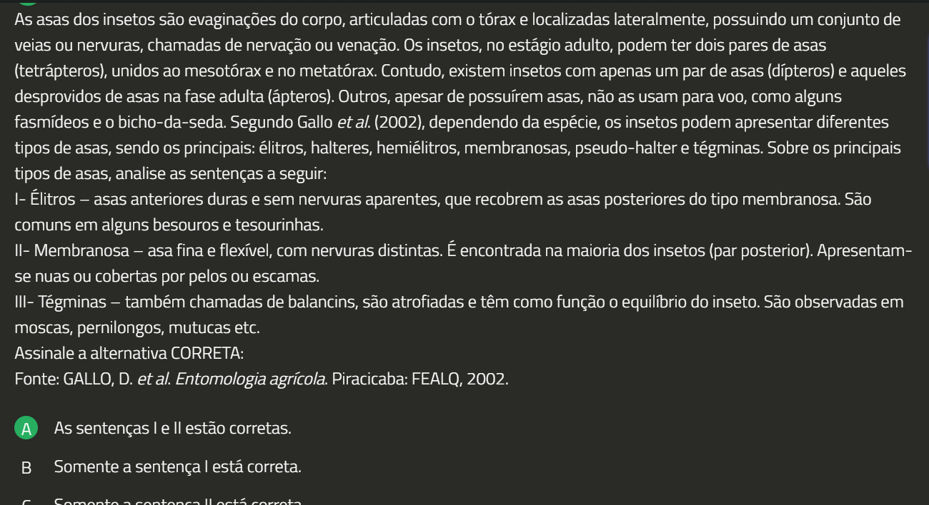 As asas dos insetos são evaginações do corpo, articuladas com tórax e localizadas lateralmente, possuindo um conjunto de veias ou nervuras, chamadas de nervação ou venação. Os insetos, no estágio adulto, podem ter dois pares de asas (tetrápteros), unidos ao mesotórax e no metatórax. Contudo, existem insetos com apenas um par de asas (dípteros) e aqueles desprovidos de asas na fase adulta (ápteros). Outros, apesar de possuírem asas, não as usam para como alguns fasmídeos e bicho-da-seda. Segundo Gallo et al. (2002), dependendo da espécie, os insetos podem apresentar diferentes tipos de asas, sendo os principais: élitros, halteres, hemiélitros, membranosas, pseudo-halter e tégminas. Sobre os principais tipos de asas, analise as sentenças a seguir: I- Élitros - asas anteriores duras e sem nervuras aparentes, que recobrem as asas posteriores do tipo membranosa. São comuns em alguns besouros e tesourinhas. II- Membranosa - asa fina e flexível, com nervuras distintas. É encontrada na maioria dos insetos (par posterior). Apresentam- se nuas ou cobertas por pelos ou escamas. III- Tégminas - também chamadas de balancins, são atrofiadas e têm como função do inseto. São observadas em moscas, pernilongos, mutucas etc. Assinale a alternativa CORRETA: Fonte: GALLO, D. et al. Entomologia agrícola. Piracicaba: FEALQ, 2002. A As sentenças I e II estão corretas. B Somente a sentença I está correta. II