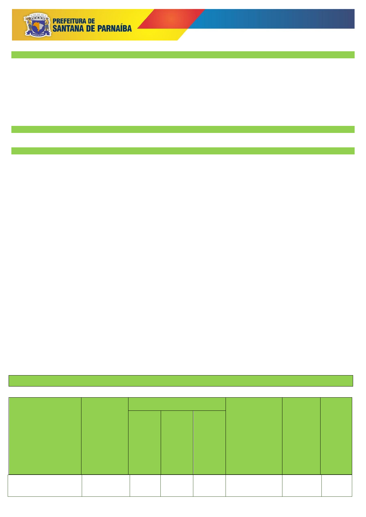1 CONCURSO PÚBLICO – EDITAL N.º 01/2025 A Prefeitura do Município de Santana de Parnaíba, Estado de São Paulo, torna público nas formas previstas no art. 37, da Constituição Federal, na Lei Complementar n.º 34, de 25 de maio de 2011 e suas respectivas alterações (dispõe sobre o Estatuto dos Servidores Públicos do Município de Santana de Parnaíba), na Lei Municipal n.º 3117, de 25 de maio de 2011 e suas respectivas alterações (dispõe sobre o Plano de Cargos, Carreiras e Vencimentos dos Servidores Municipais de Santana de Parnaíba), que realizar-se-á Concurso Público para provimento de vagas, aos Cargos mencionados neste Edital, bem como para Cadastro Reserva, que integrarão o quadro de Servidores Municipais, a serem nomeados sob o Regime Estatutário, observadas as INSTRUÇÕES ESPECIAIS, deste Edital. INSTRUÇÕES ESPECIAIS CAPÍTULO I – DO CONCURSO PÚBLICO 1.1. O Concurso Público será regido por este Edital, por Avisos, Atos Complementares e eventuais Retificações, sendo sua execução de responsabilidade da Empresa MSCONCURSOS. 1.1.1. As datas e períodos mencionados no Cronograma são prováveis, sujeitos a alterações, sendo de inteira responsabilidade do candidato acompanhar os eventos, nos meios informados no presente Edital. 1.2. O Concurso Público destina-se ao provimento de vagas dos Cargos mencionados neste Edital, pelo Regime Estatutário, atualmente vagos e dos que vagarem durante o prazo de validade do Concurso Público, bem como para Cadastro Reserva. 1.2.1. O Cadastro Reserva somente será aproveitado mediante a abertura de novas vagas, observado o prazo de validade do presente Concurso Público. 1.2.2. Caso haja candidatos aprovados em Concurso anterior e vigente, nos mesmos Cargos com Cadastro em Reserva para este Concurso, estes serão convocados com prioridade sobre os demais aprovados neste Concurso Público. 1.3. O prazo de validade do Concurso Público será de 02 (dois) anos, contados a partir da data da Homologação do Resultado Final, podendo, a critério da PREFEITURA DO MUNICÍPIO DE SANTANA DE PARNAÍBA/SP, ser prorrogado, uma vez, por igual período. 1.4. Os vencimentos dos Cargos são referentes ao mês de abril 2025. 1.5. A descrição detalhada dos Cargos será obtida no Anexo I, deste Edital. 1.6. Os Cargos serão ocupados pelo Servidor Municipal de acordo com a qualificação profissional, nos Anexos da Lei Municipal n.º 3117, de 25 de maio de 2011 e suas respectivas alterações, que dispõe sobre o Plano de Cargos, Carreiras e Vencimentos dos Servidores Municipais de Santana de Parnaíba, bem como no Decreto n.º 4024, de 28 de agosto de 2017, que regulamenta as atividades exercidas pelos ocupantes de cargo de provimento efetivo, no âmbito da Administração Municipal. 1.7. De acordo com a Lei Municipal n.°3261, de 02 de maio de 2013, reajustada pela Lei Municipal n.º 4264, de 03de abril de 2024, o piso salarial remuneratório dos Servidores Municipais é de R$ 1572,20. 1.8. Os Cargos, Especialização/Área de Atuação (quando houver), as vagas existentes (total, reserva para Pessoas com Deficiência e reserva para mulheres em situação de violência doméstica), os requisitos mínimos exigidos, o vencimento mensal, a carga horária semanal e a taxa da inscrição, estão estabelecidos na Tabela I especificada a seguir: TABELA I – CARGOS DIVERSOS Cargos Especialização Área de Atuação Vaga(s) Existente(s) Requisitos Mínimos Exigidos (a serem comprovados por ocasião da convocação, que antecede a nomeação) Vencimento Mensal e Carga Horária Semanal Taxa de Inscrição Total (*1) Reserva para Pessoa com Deficiência (*2) Reserva para Mulheres em Situação de Violência Doméstica (*3) Agente de Serviços de Alimentação -- Cadastro Reserva -- -- Alfabetizado. R$ 1.572,20 40h R$ 32,52 2 Agente de Serviços Públicos (cargo com serviços manuais e inespecíficos, exigindo esforço físico – braçal) -- 10 01 -- Alfabetizado. R$ 1.830,41 40h R$ 32,52 Coveiro -- Cadastro Reserva -- -- Alfabetizado. R$ 3.226,86 (*5) 40h R$ 32,52 Oficial de Manutenção Pedreiro 01 -- -- Alfabetizado. R$ 2.427,70 40h R$ 32,52 Pintor 01 -- -- Alfabetizado. R$ 2.427,70 40h R$ 32,52 Serralheiro Cadastro Reserva -- -- Alfabetizado. R$ 2.742,14 (*5) 40h R$ 32,52 Oficial de Marcenaria -- 01 -- -- Alfabetizado. R$ 2.890,11 40h R$ 32,52 Operador de Máquinas Tratorista 01 -- -- Alfabetizado e CNH "C" R$ 2.104,97 (*4) 40h R$ 32,52 Agente de Defesa Civil -- 01 -- -- Ensino Médio Completo, CNH categoria "B" ou superior, Aptidão Física R$ 1.830,41 40h R$ 32,52 Auxiliar de Desenvolvimento Infantil -- Cadastro Reserva -- -- Ensino Médio Completo R$ 2.230,41 (*6) 40h R$ 32,52 Auxiliar de Farmácia -- 05 01 -- Ensino Médio Completo e Curso de Auxiliar de Farmácia, com carga horária mínima de 100h. R$ 2.742,14 (*5) 40h R$ 32,52 Auxiliar em Saúde Bucal -- Cadastro Reserva -- -- Ensino Médio Completo, Curso Profissionalizante e Registro Profissional no Órgão competente. R$ 3.092,14 (*5) (*7) 40h R$ 32,52 Oficial Administrativo -- Cadastro Reserva -- -- Ensino Médio Completo e Noções de Informática Básica em digitação de textos e planilhas. R$ 1.830,41 40h R$ 32,52 Operador de Tráfego -- 01 -- -- Ensino Médio Completo, CNH categoria "A e B"e Aptidão Física. R$ 2.427,70 40h R$ 32,52 3 Técnico Sociocultural -- 01 -- -- Ensino Médio Completo e curso profissionalizante em Arte Dramática, Artes Visuais, Comunicação Visual, Produção de Áudio, Vídeo e áreas afins. R$ 2.890,11 40h Arquiteto -- 01 -- -- Graduação Superior Completa em Arquitetura e Registro Profissional no Órgão competente. R$ 8.991,47 40h R$ 32,52 Assistente Social -- 01 -- -- Graduação Superior Completa em Serviço Social e Registro Profissional no Órgão competente. R$ 4.816,86 30h R$ 32,52 Biólogo -- 01 -- -- Graduação Superior Completa em Biologia e Registro Profissional no Órgão competente. R$ 4.816,86 30h R$ 32,52 Contador -- 01 -- 