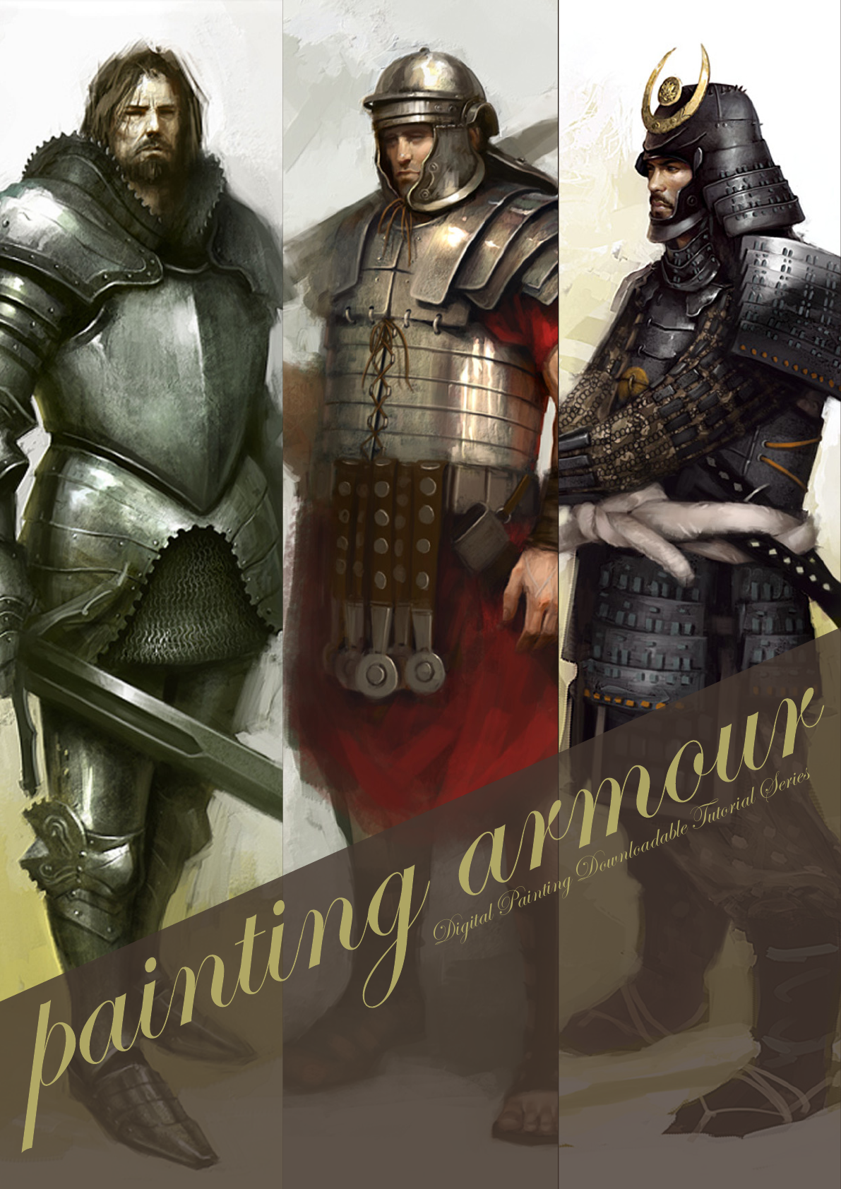 Digital Painting Downloadable Tutorial Series Contents Chapter 01 003 Chapter 02 013 Chapter 3 024 Medieval Armour Greek - Roman Oriental Japanese Samurai Chapter 01 page 4www.2dartistmag.com Chapter 1 Chapter01 Medieval Armour Gather Information The first thing I usually do when I get a project is to collect all of the reference material that I am going to need. Most of the time you can find everything you need by just ‘Googling’ it. Fig01 shows images taken from different museum websites. It is a good idea to start building up a large reference folder on your computer so that the next time you need some armour reference you will already have it. Now that we have our reference material, we can start the illustration. Getting Ready This painting is going to be done primarily in Photoshop CS2, with a little bit of Painter IX at the end. I have included the Photoshop CS2 brushes that I have used so that you can try them out too. To load them, just click on the brush tool and then right-click on the canvas. Your brush menu should now open. In the top right corner is a small triangle button - click on it and go to “Load Brushes”, then select the file that is included in this tutorial. As for what size of a file you should work in, I always paint at 300dpi and usually around 3000 pixels wide. This artwork is 2404x2905. The Block In Start by blocking in the main shapes of the figure (Fig02). At this point you are just trying to get the basic shapes of the figure, so don’t worry about the details just yet. Next, lay in the basic colour and shapes for the face (Fig03). I felt the need for some more colours in the background, so I added some yellows to the ground and brought them up behind the character, and also onto his legs (Fig04). page 5www.2dartistmag.com Chapter 1 Medieval Armour Chapter01 Adding the Detail Usually I block in more of the armour shapes before I work more on the head, but this time I am going to finish up the head first so that I can focus more on the armour (Fig05a). I wanted this guy to be a rough and tough knight, not just another big brute, but one that is proud and charismatic. Another way to make someone look more heroic is to elongate their proportions. Usually I make them around 8-9 heads tall. Now that I have the head down, I can start blocking in the armour. I wasn’t really sure what the armour was going to look like, so I just started throwing down paint (Fig05b). The shape I put down for the pauldron didn’t really make any sense, so I start cutting away pieces and trying to give it some more form and function (Fig05c). One thing you always need to be aware of when designing a character is whether or not they could actually function. It’s nice to make them look cool, but a lot of the time, especially in the gaming industry, the character will need to be able to animate. This is where your references come in handy. Study how real armour is put together and try to figure out why it was designed a certain way and how it works. I felt like the character was leaning too much, so I rotated him a little counter-clockwise, and gave him hair and a beard (Fig05d). page 6www.2dartistmag.com Chapter 1 Chapter01 Medieval Armour There are many ways to paint in the highlights, one of which is to use the colour dodge tool (Fig06a & b). I know people always say to never use colour dodge, but when used correctly it is a great tool. First you need to pick a dark colour. If you pick a light colour you will overexpose the illustration very quickly. Next, click on the brush tool and go up to the “mode” pull down and select “colour dodge”. You can use any brush you like, but I find it easier to use a soft brush. Sometimes the area you paint will become very saturated, so just go back in with the desaturate brush. For the plates on the arm, I first paint in the curved shadows that they create (Fig07a & b). Then I put in some specular highlights, the core shadow, reflected light, and a highlight to the rim of the plates (Fig07c). page 7www.2dartistmag.com Chapter 1 Medieval Armour Chapter01 A lot of people ask me how to get textures in their paintings (Fig.08). Most of the time I just paint my textures in manually with my brushes, but sometimes I will overlay a texture from a photo. I found this texture from Barontieri (www. barontieri.com). The easy way to add texture to a painting is to take the texture, copy and paste it into your illustration, and set the layer property to overlay. Then you can knock down the opacity to whatever looks good. In this case I lowered the opacity to 45%. I wasn’t really feeling that his pose was fitting with what I had in mind, so I changed around his stance to a more confident pose (Fig09 & 10). page 8www.2dartistmag.com Chapter 1 Chapter01 Medieval Armour Again, whenever you are painting something, be sure to remember that there are several parts to describing form, such as the core shadow, reflected light, and the highlight (Fig11). Another really cool part to paint of armour is the chain mail (Fig12 & 13a). Painting chain mail is really easy and looks cool when you are zoomed out. This time I decided to make a “chain mail brush” for the purpose of this tutorial. Open a new document and draw a few “c” shapes. Make that into a brush and go to the brush controls. Click the box next to “Shape Dynamics” and under “Angle Jitter” set the control to “Direction.” Doing this will cause the “c” shapes to follow the direction of your brush. Also click the box next to “Other Dynamics” so that you can have opacity control with your stylus. First lay down one row of chain mail by painting from left to right, then you can paint the next row simply by painting from right to left. The reason we can do this is because we set the angle jitter to direction, allowing us to paint the “c” shapes in both directions without having to rotate the brush. This will let you get the basic idea down. Now go back in and pop in s