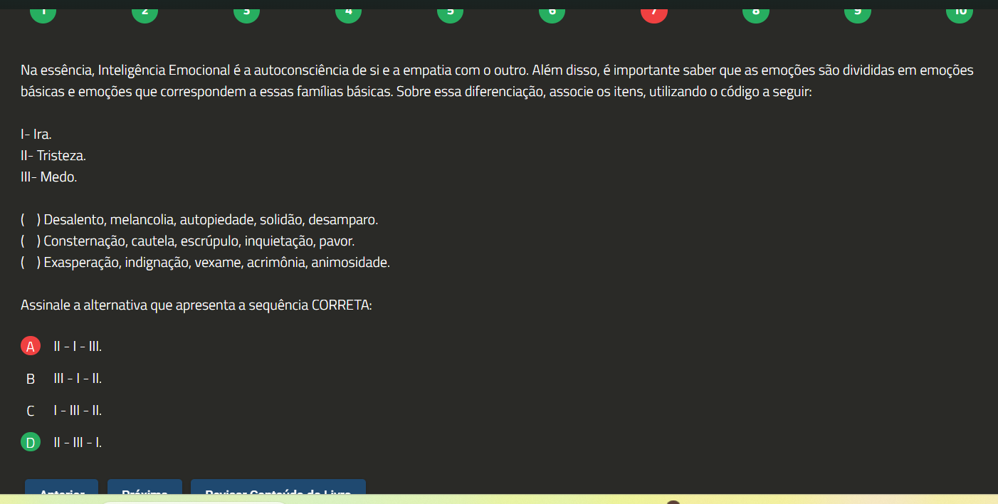 Na essência, Inteligência Emocional é a autoconsciência de si e a empatia com outro. Além disso, é importante saber que as emoções são divididas em emoções básicas e emoções que correspondem a essas famílias básicas. Sobre essa diferenciação, associe os itens, utilizando código a seguir: Ira. II- Tristeza. III- Medo. ( ) Desalento, melancolia, autopiedade, solidão, desamparo. ( ) Consternação, cautela, inquietação, pavor. ( ) Exasperação, indignação, vexame, acrimônia, animosidade. Assinale a alternativa que apresenta a CORRETA: A II - I - III. B III - I - II. I - III - II. D II - III - I.