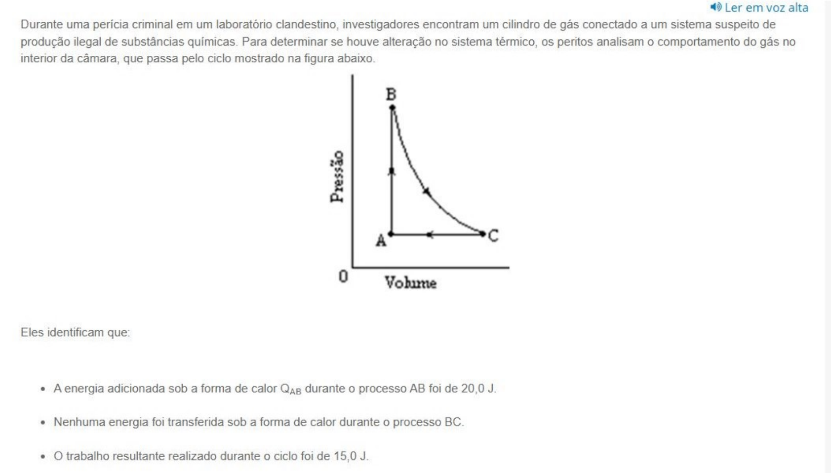 Ler em Durante uma perícia criminal em um laboratório clandestino, investigadores encontram um cilindro de gás conectado a um sistema suspeito de produção ilegal de substâncias Para determinar se houve alteração no sistema térmico, os peritos analisam o comportamento do gás no interior da câmara, que passa pelo ciclo mostrado na figura abaixo. B A C 0 Volume Eles identificam que: A energia adicionada sob a forma de calor QAB durante o processo AB foi de 20,0 J. Nenhuma energia foi transferida sob a forma de calor durante o processo BC. O trabalho resultante realizado durante o ciclo foi de 15,0 J.Com relação à situação descrita, avalie as seguintes afirmativas: - energia transferida por calor no processo CA pode ser determinada aplicando a Primeira Lei da Termodinâmica ao ciclo. II - - O calor total trocado pelo gás ao longo de um ciclo fechado é igual ao trabalho realizado pelo sistema. III - A energia transferida por calor no processo CA é de - 5,0J, indicando que o gás perdeu energia nesse processo. IV - Se o cilindro estivesse isolado termicamente, o trabalho realizado no ciclo seria necessariamente zero. Está correto o que se afirma em: A Apenas I e III. B Apenas e IV. C Apenas I, e III. D Apenas I, III e IV. E Apenas II, III e IV.