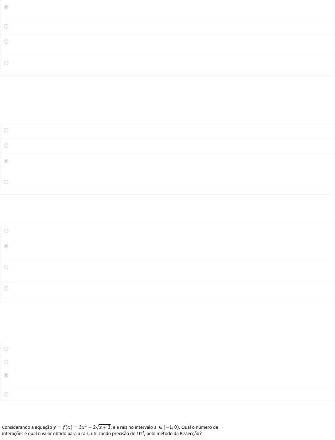 Ler em voz alta Ler em voz alta Ler em voz alta Ler em voz alta Ler em voz alta Questão 1/10 - Cálculo Numérico A solução do sistema de equações abaixo pode ser realizada por quais procedimentos numéricos? 3x +5x =13 2x +x =6 A Método de Newton Você assinalou essa alternativa (A) B Método de Gauss-Jordan C Método de Eliminação de Gauss D Método de Gauss-Jacobi ou Gauss-Seidel Questão 2/10 - Cálculo Numérico Colunas de adsorção são utilizadas em muitas indústrias quando o objetivo é separar componentes de uma mistura ou purificar substâncias gasosas. Em um estudo realizado acerca do tempo necessário para que uma coluna atinja o ponto máximo de saturação, chegou-se, numericamente, ao valor de 7,12 horas. No entanto, o valor exato corresponde a 7,36 horas. Sendo assim, qual foi o erro absoluto? A EA =0,12 B EA =0,14 C EA =0,24 Você assinalou essa alternativa (C) D EA =0,28 Questão 3/10 - Cálculo Numérico Para os processos de integração numérica, é possível afirmar: A Um aumento no número de divisões do intervalo de integração, ocasiona um erro maior no resultado da integral. B Um aumento no número de divisões do intervalo de integração, ocasiona um erro menor no resultado da integral. Você assinalou essa alternativa (B) C O erro relativo ocorrido em uma avaliação de integração numérica, não depende da quantidade de divisões do intervalo de integração. D Um aumento ou diminuição na quantidade de divisões do intervalo de integração não tem influência na precisão da resposta. Questão 4/10 - Cálculo Numérico Obtenha uma aproximação para a raiz quadrada de 7 por meio do método da posição falsa considerando uma tolerância de 10 e informe quantas iterações foram realizadas. Obs.: Note que a raiz quadrada de 7 é uma raiz da função f(x)=x -7. Considere I=[2, 3]. A x=2,64285 em 3 iterações B x=2,64285 em 5 iterações C x=2,64557 em 3 iterações Você assinalou essa alternativa (C) D x=2,64557 em 5 iterações Questão 5/10 - Cálculo Numérico . 1 2 2 1 2 3 x x x x -3 2 12/05/2025, 12:32 AVA UNIVIRTUS https://univirtus.uninter.com/ava/web/#/ava/AvaliacaoUsuarioHistorico/ByaRX0s7%2BlnxUg%2BFtnUVpw%3D%3D/novo/1/p1ZvXOCtXnnQAtg4… 1/3 javascript:void(0) javascript:void(0) javascript:void(0) javascript:void(0) javascript:void(0) Ler em voz alta Ler em voz alta Ler em voz alta Ler em voz alta Adote como critério de parada erro absoluto entre os valores de x com precisão de 10 . A B C D Você assinalou essa alternativa (D) Questão 6/10 - Cálculo Numérico Calcule o erro absoluto referente à medição de uma peça cujo valor exato é 1,998 cm, mas na medição o valor aproximado obtido foi de 2 cm. A Erro absoluto: 0,001 cm B Erro absoluto: 0,002 cm Você assinalou essa alternativa (B) C Erro absoluto: 0,01 cm D Erro absoluto: 0,02 cm Questão 7/10 - Cálculo Numérico Qual a solução obtida para o sistema de equações abaixo com x =[0 0] considerando uma precisão de 10 e utilizando seis casas decimais nos cálculos? 3x +5x =13 2x +x =6 A [1,465335 1,494794] B [1,380991 1,488622] C [1,363355 1,484794] Você assinalou essa alternativa (C) D [1,705273 1,861018] Questão 8/10 - Cálculo Numérico Dada a função f(x)=5x -3x +12x-1 com raiz no intervalo I=[-3, -1], qual o valor da raiz utilizando o método da bissecção com precisão de 10 ? Você não pontuou essa questão A x=-1,531250 B x=-1,562500 C x=-1,511719 Você assinalou essa alternativa (C) D x=-1,509277 Questão 9/10 - Cálculo Numérico Em relação aos métodos numéricos para integração, quais deles podem ser utilizados com passo variável. A Regra 1/3 de Simpson B Regra 3/8 de Simpson C Somente o Método dos Trapézios D Método dos Trapézios e dos Retângulos. Você assinalou essa alternativa (D) -3 (0) T -2 1 2 2 1 2 3 T T T T 4 2 -2 12/05/2025, 12:32 AVA UNIVIRTUS https://univirtus.uninter.com/ava/web/#/ava/AvaliacaoUsuarioHistorico/ByaRX0s7%2BlnxUg%2BFtnUVpw%3D%3D/novo/1/p1ZvXOCtXnnQAtg4… 2/3 javascript:void(0) javascript:void(0) javascript:void(0) javascript:void(0) Ler em voz alta Questão 10/10 - Cálculo Numérico Qual dos sistemas de equações pode ser resolvido pelo método de Gauss-Jacobi e de Gauss-Seidel? Sistema I: x +8x +2x =10 15x +x +2x =13 x +2x +3x =-4 Sistema II: 7x +8x +2x =10 x +x +4x =13 6x +x +3x =-4 A Somente I) Você assinalou essa alternativa (A) B Somente II) C Os dois sistemas de equações. D Nenhum dos sistemas de equações 1 2 3 1 2 3 1 2 3 1 2 3 1 2 3 1 2 3 12/05/2025, 12:32 AVA UNIVIRTUS https://univirtus.uninter.com/ava/web/#/ava/AvaliacaoUsuarioHistorico/ByaRX0s7%2BlnxUg%2BFtnUVpw%3D%3D/novo/1/p1ZvXOCtXnnQAtg4… 3/3 javascript:void(0)