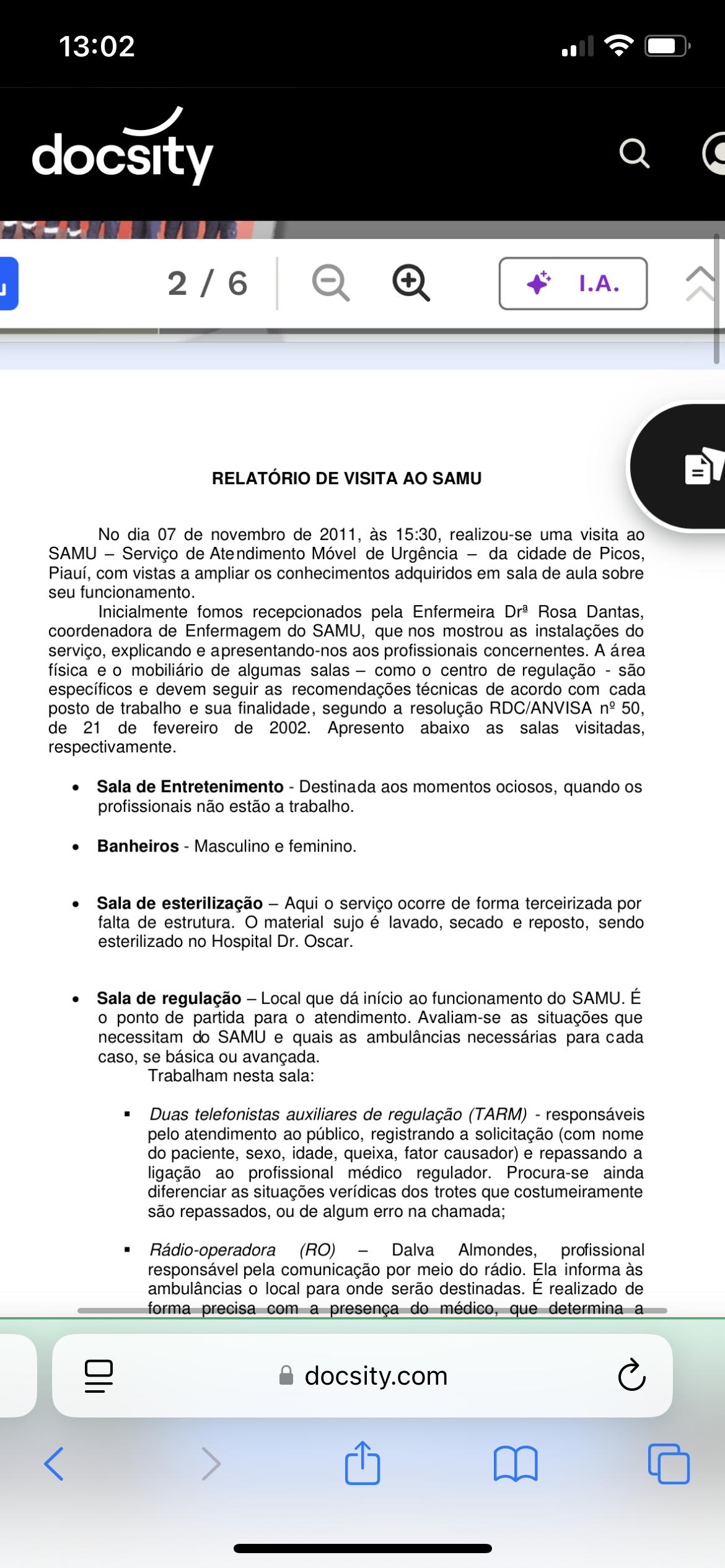 13:02 docsity 2/6 I.A. RELATÓRIO DE VISITA AO SAMU = No dia 07 de novembro de 2011, às 15:30, realizou-se uma visita ao SAMU - Serviço de Atendimento Móvel de Urgência - da cidade de Picos, Piauí, com vistas a ampliar os conhecimentos adquiridos em sala de aula sobre seu funcionamento. Inicialmente fomos recepcionados pela Enfermeira Rosa Dantas, coordenadora de Enfermagem do SAMU, que nos mostrou as instalações do serviço, explicando e apresentando-nos aos profissionais concernentes. A área física e o mobiliário de algumas salas - como o centro de regulação - são específicos e devem seguir as recomendações técnicas de acordo com cada posto de trabalho e sua finalidade, segundo a resolução RDC/ANVISA n° 50, de 21 de fevereiro de 2002. Apresento abaixo as salas visitadas, respectivamente. Sala de Entretenimento Destinada aos momentos ociosos, quando os profissionais não estão a trabalho. Banheiros - Masculino e feminino. Sala de esterilização - Aqui o serviço ocorre de forma terceirizada por falta de estrutura. material sujo é lavado, secado e reposto, sendo esterilizado no Hospital Dr. Oscar. Sala de regulação - Local que dá início ao funcionamento do SAMU. É o ponto de partida para o atendimento. Avaliam-se as situações que necessitam do SAMU e quais as ambulâncias necessárias para cada caso, se básica ou avançada. Trabalham nesta sala: Duas telefonistas auxiliares de regulação (TARM) responsáveis pelo atendimento ao público, registrando a solicitação (com nome do paciente, sexo, idade, queixa, fator causador) e repassando a ligação ao profissional médico regulador. Procura-se ainda diferenciar as situações verídicas dos trotes que costumeiramente são repassados, ou de algum erro na chamada; Rádio-operadora (RO) - Dalva Almondes, profissional responsável pela comunicação por meio do rádio. Ela informa às ambulâncias o local para onde serão destinadas. É realizado de forma precisa com a presença do médico, que determina a docsity.com