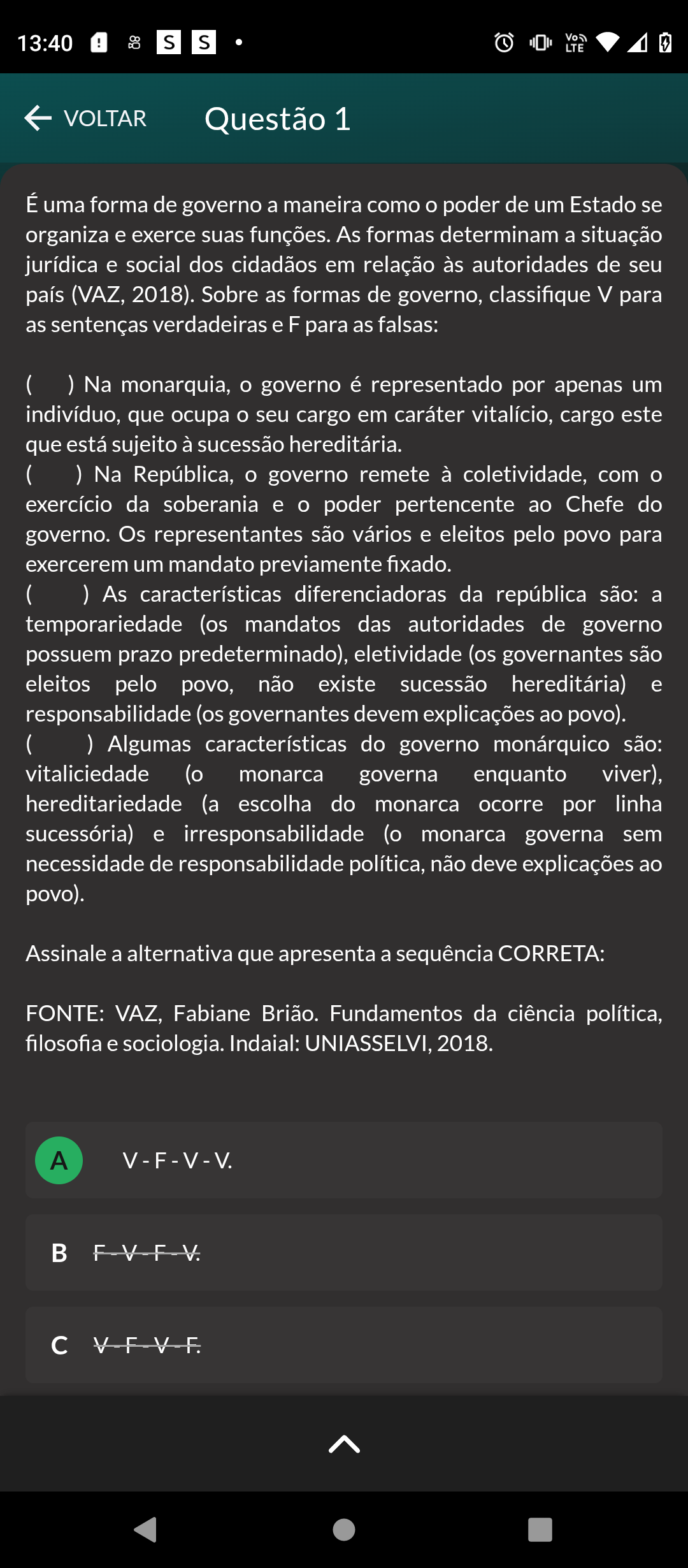 13:40 S S LTE VOLTAR Questão 1 É uma forma de governo a maneira como O poder de um Estado se organiza e exerce suas funções. As formas determinam a situação jurídica e social dos cidadãos em relação às autoridades de seu país (VAZ, 2018). Sobre as formas de governo, classifique V para as sentenças verdadeiras e F para as falsas: ( ) Na monarquia, O governo é representado por apenas um indivíduo, que ocupa O seu cargo em caráter vitalício, cargo este que está sujeito à sucessão hereditária. ( ) Na República, O governo remete à coletividade, com O exercício da soberania e O poder pertencente ao Chefe do governo. Os representantes são vários e eleitos pelo povo para exercerem um mandato previamente fixado. ( ) As características diferenciadoras da república são: a temporariedade (os mandatos das autoridades de governo possuem prazo predeterminado), eletividade (os governantes são eleitos pelo povo, não existe sucessão hereditária) e responsabilidade (os governantes devem explicações ao povo). ( ) Algumas características do governo monárquico são: vitaliciedade (o monarca governa enquanto viver), hereditariedade (a escolha do monarca ocorre por linha sucessória) e irresponsabilidade (o monarca governa sem necessidade de responsabilidade política, não deve explicações ao povo). Assinale a alternativa que apresenta a sequência CORRETA: FONTE: VAZ, Fabiane Brião. Fundamentos da ciência política, filosofia e sociologia. Indaial: UNIASSELVI, 2018. A