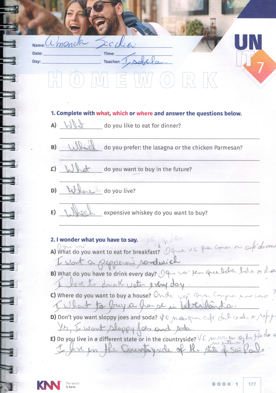 Name: Amanda UN Date: Time: Day: Teacher: 7 K 1. Complete with what, which or where and answer the questions below. A) What do you like to eat for dinner? B) do you prefer: the lasagna or the chicken Parmesan? c) What do you want to buy in the future? D) do you live? E) which expensive whiskey do you want to buy? A) One What do for breakfast? cafe 2. I wonder what you have to say. you want to eat I want a sandwich B) What do you have to drink every day? One tem I have to drink water day Where do you want to buy a house? care ? I, What to buy a house in D) Don't you want sloppy joes and soda? e E) Do you live in a different state or in the countryside? V.C a I want sloppy for and no I in the Countryside of the state of KNN The world BOOK 1 177 is here.Name: UN Date: Time: Day: Teacher: 8 S 1. Show me what you can do. A) need / now I need to Study now B) prefer / buy Do you prefer to or Juice have on weekends They have to go the weekends D) ugly / house That house is ugly E) like / countryside I like living in the hyside One td A) Where would you prefer to live in a 2. How about you play the reporter now? I prefer to live in a big city. In uma cidade B) Do we have you an old have and a a cat cat ? ? Yes, dog Sim, Do they eat fizza? ? No, they don't eat pepperoni pizza. de pepperoni D) What need to buy? ? I need to buy a new bike. E) for ? We have coffee and bread for breakfast every day. e cofe da KNN The world is here. BOOK 1 179Name: UN Date: Time: Day: Teacher: 9 pergents we a 1. I wonder what you have to say. A) Do you want to live at the beach with me? I want to live on the beach precison in a B) Do your friends have to go to that crowded mall in the evening? you don't need to go to the at Where do your parents go every month? pain They go to the D) Don't you eat lasagna every day? I l very E) I like to go Where do you like to go on weekends? de in de me from) 2. Show me what you can do. A) they / meat pie B) love / sports car Do they like meat apple ? I love red sports go / fancy restaurant I want to go to that D) we / the mall opping E) buy / a fake necklace That's the we going to Did you buy a KNN The world is here. BOOK 1 : 181Name: UN Date: Time: Day: Teacher: 10 1. Fill in the blanks, then answer the questions below. A) Don't you love to with me? B) Do they on weekends? c) When do you ? D) Do you and your parents at night? E) Where do you go ? 2. Show me what you can do. A) to that store -D B) home I'm gring to do marketing for that store like to always be home in the morning 1 like in the morning D) in the evening Moite I will at night E) every month tods I re port month KNN The world BOOK 1 is here. 183Name: UN Date: Time: Day: Teacher: 11 K 1. I wonder what you have to say. A) When do you need to organize your rooms? I need to ganize our clothes B) Do they want to make banana pancakes for breakfast? can de they will make Do they really need to make tomato sauce? Eles Yes, t need to make fresh Onde we de D) Where do you buy second-hand clothes? buy it at a Store E) Do you prefer laptops to computers? Vc pre the loptops on I prefer 2. How about you play the reporter now? adyidi A) When need to go travel with your friends I really want to travel abroad with my friends. red mente can B) you chicken for today? ? Yes, I want to make chicken Parmesan for lunch today. Sim, al Do you li traveling with your ? No, I don't like to travel with parents. not deligion D) when will you to your files on your We have to organize our computer files tonight. E) do you need to break ? you de ? We need bread and meat to make sloppy joes. de e de The world is here. BOOK 1 185