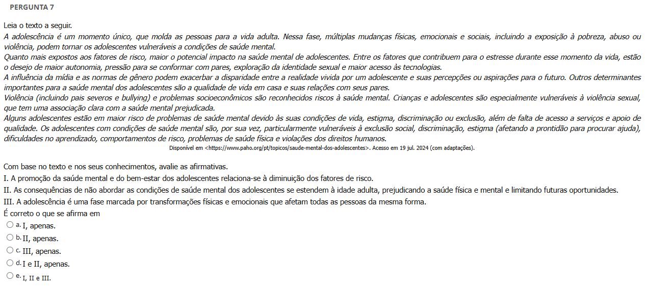 PERGUNTA 7 Leia texto a seguir. A adolescência é um momento único, que molda as pessoas para a vida adulta. Nessa fase, múltiplas mudanças físicas, emocionais e sociais, incluindo a exposição à pobreza, abuso ou violência, podem os adolescentes vulneráveis a condições de saúde mental. Quanto mais expostos aos fatores de risco, maior o potencial impacto na saúde mental de adolescentes. Entre os fatores que contribuem para estresse durante esse momento da vida, estão o desejo de maior autonomia, pressão para se conformar com pares, exploração da identidade sexual e maior acesso às tecnologias. A influência da mídia e as normas de gênero podem a disparidade entre a realidade vivida por um adolescente e suas percepções ou aspirações para o futuro. Outros determinantes importantes para a saúde mental dos adolescentes são a qualidade de vida em casa e suas relações com seus pares. Violência (incluindo pais severos e bullying) e problemas socioeconômicos são reconhecidos riscos à saúde mental. Crianças e adolescentes são especialmente vulneráveis à violência sexual, que tem uma associação clara com a saúde mental prejudicada. Alguns adolescentes estão em maior risco de problemas de saúde mental devido às suas condições de vida, estigma, discriminação ou exclusão, além de falta de acesso a serviços e apoio de qualidade. Os adolescentes com condições de saúde mental são, por sua vez, particularmente vulneráveis à exclusão social, discriminação, estigma (afetando a prontidão para procurar ajuda), dificuldades no aprendizado, comportamentos de risco, problemas de saúde física e violações dos direitos humanos. Disponível em Acesso em 19 jul. 2024 (com adaptações). Com base no texto e nos seus conhecimentos, avalie as afirmativas. I. A promoção da saúde mental e do bem-estar dos adolescentes relaciona-se à diminuição dos fatores de risco. II. As consequências de não abordar as condições de saúde mental dos adolescentes se estendem à idade adulta, prejudicando a saúde física e mental e limitando futuras oportunidades. III. A adolescência é uma fase marcada por transformações físicas e emocionais que afetam todas as pessoas da mesma forma. É correto que se afirma em a. I, apenas. b. II, apenas. III, apenas. d. I e II, apenas. e. I, II e III.
