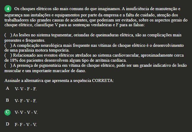4 Os choques elétricos são mais comuns do que imaginamos. A insuficiência de manutenção e segurança nas instalações e equipamentos por parte da empresa e a falta de cuidado, atenção dos trabalhadores são grandes causas de acidentes, que poderiam ser evitados, sobre os aspectos gerais do choque classifique V para as sentenças verdadeiras e F para as falsas: ( ) As lesões no sistema tegumentar, oriundas de queimaduras elétrica, são as complicações mais presentes e frequentes. ( ) A complicação neurológica mais frequente nas vítimas de choque elétrico é desenvolvimento de uma paralisia motora temporária. ( ) Relacionado aos eventos elétricos atrelados ao sistema cardiovascular, aproximadamente cerca de 18% dos pacientes desenvolvem algum tipo de arritmia ( ) A presença de pigmentúria em vítima de choque elétrico, pode ser um grande indicativo de lesão muscular e um importante marcador de dano. Assinale a alternativa que apresenta a sequência CORRETA: A V-V-F- F. B C D