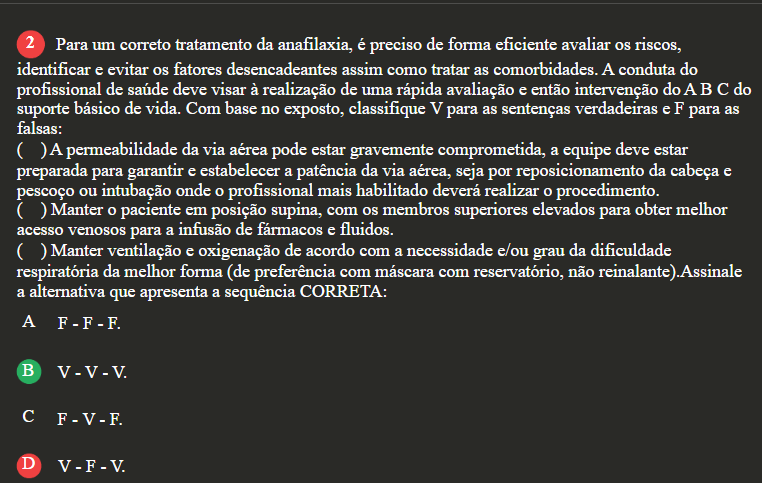 2 Para um correto tratamento da anafilaxia, é preciso de forma eficiente avaliar os riscos, identificar e evitar os fatores desencadeantes assim como tratar as comorbidades. A conduta do profissional de saúde deve visar à realização de uma rápida avaliação e então intervenção do AB C do suporte básico de vida. Com base no exposto, classifique V para as sentenças verdadeiras e F para as falsas: ( ) A permeabilidade da via aérea pode estar gravemente comprometida, a equipe deve estar preparada para garantir e estabelecer a patência da via aérea, seja por reposicionamento da cabeça e pescoço ou intubação onde profissional mais habilitado deverá realizar procedimento. ( ) Manter o paciente em posição supina, com os membros superiores elevados para obter melhor acesso venosos para a infusão de fármacos e fluidos. ( ) Manter ventilação e oxigenação de acordo com a necessidade e/ou grau da dificuldade respiratória da melhor forma (de preferência com máscara com reservatório, não reinalante) Assinale a alternativa que apresenta a sequência CORRETA: A F F - F. B C F - V - F. D V F V.