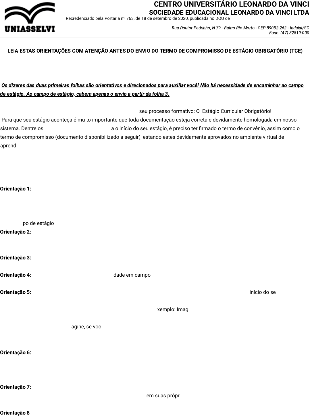 Data de Emissão: 11/03/2025 - 05:48PM CENTRO UNIVERSITÁRIO LEONARDO DA VINCI SOCIEDADE EDUCACIONAL LEONARDO DA VINCI LTDA Recredenciado pela Portaria nº 763, de 18 de setembro de 2020, publicada no DOU de 21 de setembro de 2020, seção 1, página 119. Rua Doutor Pedrinho, N 79 - Bairro Rio Morto - CEP 89082-262 - Indaial/SC Fone: (47) 32819-000 LEIA ESTAS ORIENTAÇÕES COM ATENÇÃO ANTES DO ENVIO DO TERMO DE COMPROMISSO DE ESTÁGIO OBRIGATÓRIO (TCE) Prezado(a) acadêmico(a), Os dizeres das duas primeiras folhas são orientativos e direcionados para auxiliar você! Não há necessidade de encaminhar ao campo de estágio. Ao campo de estágio, cabem apenas o envio a partir da folha 3. Sabemos que você chegou em um momento importante do seu processo formativo: O Estágio Curricular Obrigatório! Para que seu estágio aconteça é muito importante que toda documentação esteja correta e devidamente homologada em nosso sistema. Dentre os documentos necessários para o início do seu estágio, é preciso ter firmado o termo de convênio, assim como o termo de compromisso (documento disponibilizado a seguir), estando estes devidamente aprovados no ambiente virtual de aprendizagem. Antes de demonstrar a você um resumo de como você deve obter as assinaturas e encaminhar para aprovação via sistema, observe as orientações a seguir: Orientação 1: Este documento (TCE) está previamente assinado por nós para sua maior comodidade e celeridade no processo, no entanto, o documento somente será válido quando cumprir todo o processo de aprovação através do Ambiente Virtual de Aprendizagem portanto, após recolher a assinatura do local e carimbo do local, encaminhar para aprovação conforme fluxo estabelecido. É de extrema importância que você obtenha informações junto ao seu polo antes de qualquer tratativa documental, pois cada campo de estágio tem suas especificidades de condução do processo! Orientação 2: Este é um documento de natureza formal. Portanto, ao digitalizá-lo faça com zelo para que não haja rasuras, páginas tortas, cortadas, faltantes, etc. Tais situações podem acarretar na invalidação do seu documento e impedimento de iniciar com seu estágio. Orientação 3: O TCE somente poderá ser vinculado a termos de convênios deferidos no sistema. Certifique-se de que o local estágio esteja deferido no seu sistema antes do preenchimento e envio do seu termo de compromisso. Orientação 4: Em hipótese alguma inicie sua atividade em campo de estágio antes da homologação do seu termo de compromisso de estágio, sob risco de não aproveito das horas de estágio e consequente reprovação na disciplina. Orientação 5: Não será possível o lançamento do seu TCE de forma retroativa, portanto, atente para o dia de início do seu estágio e faça o lançamento com, pelo menos, 5 (cinco) dias antecedentes do primeiro dia de estágio. Desta forma, haverá tempo hábil para análise e aprovação/devolutiva por seus professores orientadores. Exemplo: Imagine que você tenha 100h de estágio em campo para cumprir. Você deve utilizar a carga horária total e dividir pela carga horária diária que você poderá fazer (mediante combinado com polo e o campo de estágio). Imagine, se você tem que cumprir 100h e pode fazer 4 horas por dia, você precisará de 25 dias de atuação no campo de estágio (100h totais dividas por 4h diárias). Sendo assim, você deve fazer um registro que viabilize esse cumprimento: Iniciar no dia 10/08/2024 e terminar no dia 05/09/2024 (atenção, é apenas um exemplo e pode não retratar sua realidade). Orientação 6: É responsabilidade do acadêmico realizar o registro de frequência em cada dia de estágio. Este registro dever ser realizado através do LeoApp sempre que você estiver no campo de estágio. Tal procedimento é de carater obrigatório e imprescindível para conclusão das atividades do estágio supervisionado obrigatório. Observe sua trilha de aprendizagem para melhor compreensão do processo. Orientação 7: É muito importante que você tenha conhecimento das regras de conduta do local – vestimentas, horários, comportamentos, etc. O campo de estágio é um ambiente que tem suas próprias regras as quais devem ser seguidas com zelo e respeito por todos. Orientação 8: Em caso de acidentes você deve realizar contato direto com a seguradora para abertura do sinistroE- mail:br.sinistrovida@aon.com – Operadora Prudential: 0800 730 0011. Orientação 9: Acadêmicos da área da saúde! Antes de fazer qualquer tipo de contato direto com o campo de estágio, fale com seu polo de apoio presencial, pois alguns locais exigem uma organização prévia por parte da Instituição de Ensino. Orientação 10: Acadêmicos do curso de Fisioterapia, Terapia Ocupacional e Enfermagem! Sua atividade de estágio requer a presença de preceptor. Importante que você observe com seu polo se o processo de contratação foi finalizado e não inicie a atividade antes de ter o profissional vinculado a sua atividade de campo. Estas dicas são básicas e podem não contemplar toda informação necessária para início da sua atividade. Observe sua trilha de aprendizagem, o regulamento de estágio do seu curso e o link a seguir para maiores informações: Venha saber mais sobre os estágios dos cursos da UNIASSELVI: Geolocalização. (youtube.com) Agora, um passo a passo para auxiliá-lo(a) a incluir o seu termo de compromisso no sistema: Certifique-se de ter obtido o termo de compromisso diretamente da sua trilha de aprendizagem – confira os dados pessoais, do seu curso, orientador e turma. Preencha (fisicamente) todos os dados do local (Unidade Concedente) no campo a ele destinado – todos os espaços referentes ao local de estágio devem estar preenchidos ; Recolha a assinatura do responsável pelo local com carimbo; Digitalize o seu termo e salve-o em formato PDF (caso você precise, o polo de apoio presencial poderá auxiliá-lo(a)