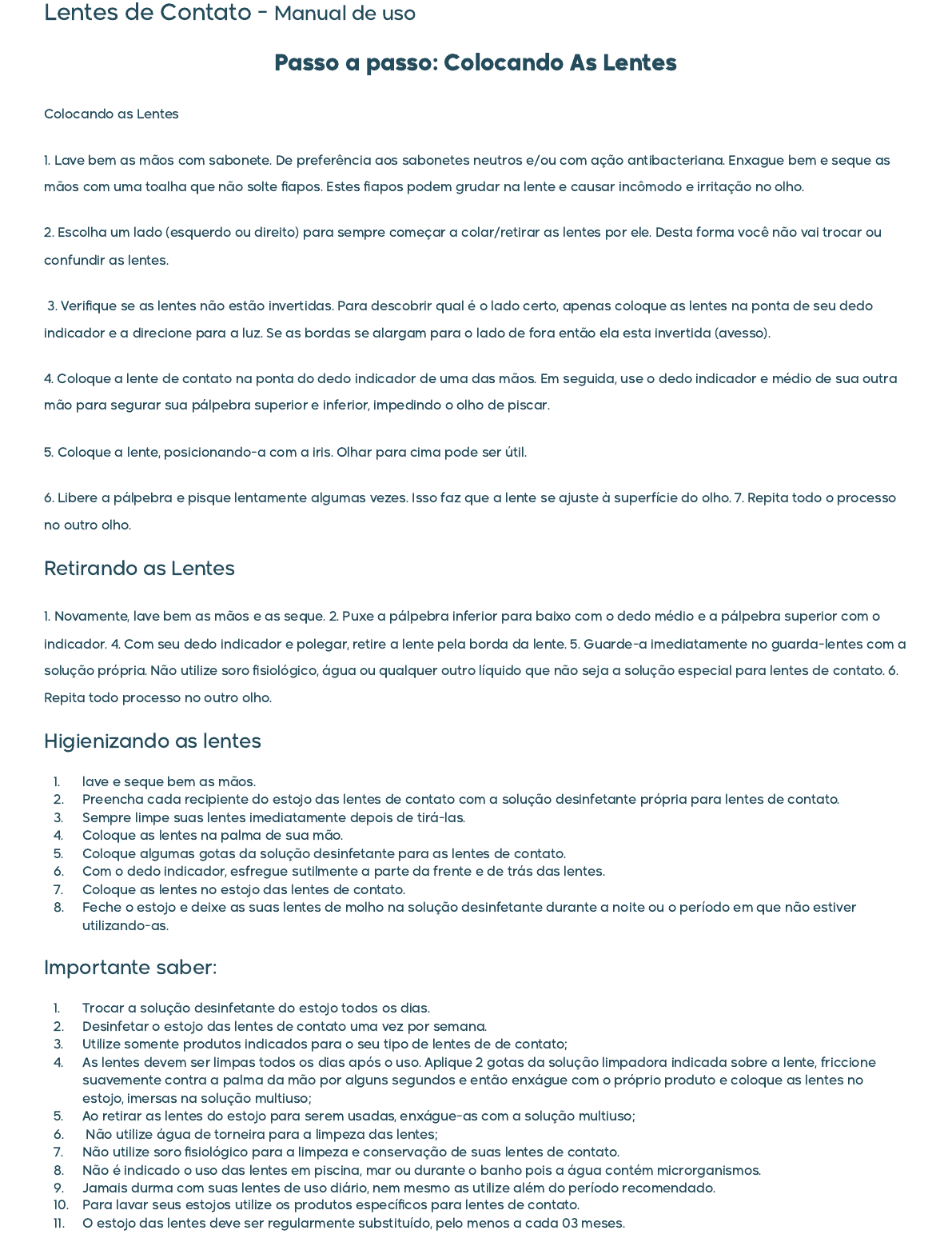 1. 2. 3. 4. 5. 6. 7. 8. 1. 2. 3. 4. 5. 6. 7. 8. 9. 10. 11. Lentes de Contato - Manual de uso Passo a passo: Colocando As Lentes Colocando as Lentes 1. Lave bem as mãos com sabonete. De preferência aos sabonetes neutros e/ou com ação antibacteriana. Enxague bem e seque as mãos com uma toalha que não solte fiapos. Estes fiapos podem grudar na lente e causar incômodo e irritação no olho. 2. Escolha um lado (esquerdo ou direito) para sempre começar a colar/retirar as lentes por ele. Desta forma você não vai trocar ou confundir as lentes. 3. Verifique se as lentes não estão invertidas. Para descobrir qual é o lado certo, apenas coloque as lentes na ponta de seu dedo indicador e a direcione para a luz. Se as bordas se alargam para o lado de fora então ela esta invertida (avesso). 4. Coloque a lente de contato na ponta do dedo indicador de uma das mãos. Em seguida, use o dedo indicador e médio de sua outra mão para segurar sua pálpebra superior e inferior, impedindo o olho de piscar. 5. Coloque a lente, posicionando-a com a iris. Olhar para cima pode ser útil. 6. Libere a pálpebra e pisque lentamente algumas vezes. Isso faz que a lente se ajuste à superfície do olho. 7. Repita todo o processo no outro olho. Retirando as Lentes 1. Novamente, lave bem as mãos e as seque. 2. Puxe a pálpebra inferior para baixo com o dedo médio e a pálpebra superior com o indicador. 4. Com seu dedo indicador e polegar, retire a lente pela borda da lente. 5. Guarde-a imediatamente no guarda-lentes com a solução própria. Não utilize soro fisiológico, água ou qualquer outro líquido que não seja a solução especial para lentes de contato. 6. Repita todo processo no outro olho. Higienizando as lentes lave e seque bem as mãos. Preencha cada recipiente do estojo das lentes de contato com a solução desinfetante própria para lentes de contato. Sempre limpe suas lentes imediatamente depois de tirá-las. Coloque as lentes na palma de sua mão. Coloque algumas gotas da solução desinfetante para as lentes de contato. Com o dedo indicador, esfregue sutilmente a parte da frente e de trás das lentes. Coloque as lentes no estojo das lentes de contato. Feche o estojo e deixe as suas lentes de molho na solução desinfetante durante a noite ou o período em que não estiver utilizando-as. Importante saber: Trocar a solução desinfetante do estojo todos os dias. Desinfetar o estojo das lentes de contato uma vez por semana. Utilize somente produtos indicados para o seu tipo de lentes de de contato; As lentes devem ser limpas todos os dias após o uso. Aplique 2 gotas da solução limpadora indicada sobre a lente, friccione suavemente contra a palma da mão por alguns segundos e então enxágue com o próprio produto e coloque as lentes no estojo, imersas na solução multiuso; Ao retirar as lentes do estojo para serem usadas, enxágue-as com a solução multiuso; Não utilize água de torneira para a limpeza das lentes; Não utilize soro fisiológico para a limpeza e conservação de suas lentes de contato. Não é indicado o uso das lentes em piscina, mar ou durante o banho pois a água contém microrganismos. Jamais durma com suas lentes de uso diário, nem mesmo as utilize além do período recomendado. Para lavar seus estojos utilize os produtos específicos para lentes de contato. � O estojo das lentes deve ser regularmente substituído, pelo menos a cada 03 meses.
