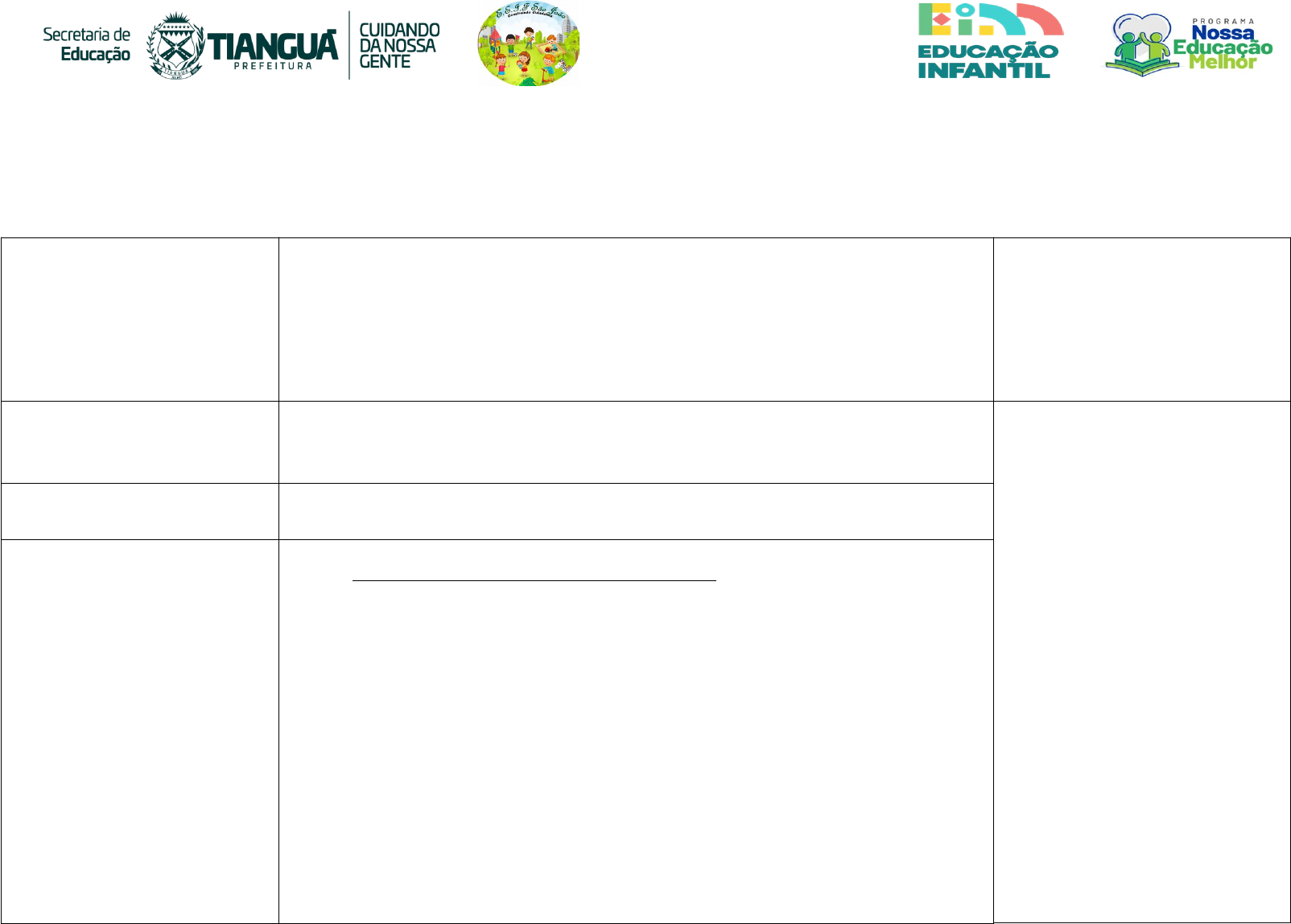 E.E.I.F. SÃO JOÃO “Construindo Cidadania” PLANO DE AULA: ( ) BERÇÁRIO ( ) CRECHE ( x ) PRÉ-ESCOLA ( ) Bebês (Zero a 1 ano e 6 meses) ( ) Crianças Bem Pequenas (1 ano e 7 meses a 3 anos e 11 meses) ( x ) Crianças Pequenas (4 anos a 5 anos e 11 meses) Professora: Antonia Filha DIREITOS DE APRENDIZAGEM: ( x ) BRINCAR ( x ) CONVIVER ( x ) EXPLORAR ( x ) PARTICIPAR ( x ) EXPRESSAR ( x ) CONHECER-SE ORGANIZAÇÃO E INTEGRAÇÃO DAS EXPERIÊNCIAS: (SEGUNDA-FEIRA 12/05/2025) Campos de experiência Objetivos de aprendizagem Acolhida: diversificados ambientes de aprendizagem. · Acolher as crianças com os cantinhos organizados de forma convidativa, utilizando blocos de madeira, pecinhas de montar, jogo do arquiteto, massinha e brinquedos de casinha ( X ) O Eu, O Outro e O Nós (EI03EO01) (EI03EO04) (EI03EO02) ( X ) Corpo, Gestos e Movimentos (EI03CG01) (EI03CG02) ( X ) Traços, Sons, Cores e Formas (EI03TS02) ( X ) Escuta, Fala, Pensamento e Imaginação (EI03EF01) (EI03EF02) ( X ) Espaços, Tempos, Quantidades, Relações e Transformações (EI03ET01) (EI03ET02) Roda de conversa: · Realizar o rodinha de acolhida envolvendo as crianças com músicas infantil, apresentar a turma chamando cada criança pelo nome, mostrar o tempo etc. INTEGRAÇÃO DAS EXPERIÊNCIAS DOS PROJETOS: ( ) contação de história ( ) leitura de história ou texto ( ) teatro ( ) conhecer lugares e/ou explorar objetos e brinquedos ( ) musicalização ( ) brincadeiras dirigidas ( ) oficinas de artes e produções ( ) explorar elementos da natureza ( ) outras · Trilha 3: Cores, Sabores, Aromas e Muitas Delícias · História - O casamento da Dona Baratinha. · Contação da história. · Após a contação, levantar questões sobre a história. · Em seguida questione as crianças sobre as cores dos alimentos. · Que alimentos elas conhecem com as cores (verde – amarelo – vermelho – laranja). · Montar uma lista com nomes dos animais presente na história. · Apresentar o conceito de alimentação saudável. · Alimentação saudável é aquela que fornece todos os nutrientes necessários para o bom funcionamento do organismo, promovendo saúde e bem-estar, e que se baseia em alimentos naturais, pouco processados, e que limita o consumo de açúcares, gorduras saturadas, e sal. · Explorar alguns alimentos como laranjas – bananas – maçãs ou outros alimentos para que as crianças sintam sua textura e aroma. · Trilha 03 · Atividade classe: Caderno ( ) Folha ( ) Livro ( ) Página_____________ · Atividade de casa: Caderno ( ) Folha ( ) Livro ( ) Página_____________ EXPERÊNCIA COM A LEITURA E ESCRITA NOS DIVERSOS CAMPOS DE EXPERIÊNCIAS: ( ) conceitos dos diversos campos de experiencias ( ) leitura de diversos livros e gêneros textuais ( ) escrita espontânea ( ) atividade elaborada pelo professor ( ) livro didático ( ) outras · Oficina sensorial com frutas: cheirar, provar e identificar cores e sabores. Experiências diversificadas: psicomotoras, brincar livre, natureza, outras. · Lista de frutas preferidas das crianças. Avaliação do dia: · Roda de conversa para avaliar as experiências do dia DIREITOS DE APRENDIZAGEM: ( x ) BRINCAR ( x ) CONVIVER ( x ) EXPLORAR ( x ) PARTICIPAR ( x ) EXPRESSAR ( x ) CONHECER-SE ORGANIZAÇÃO E INTEGRAÇÃO DAS EXPERIÊNCIAS: (TERÇA-FEIRA 13/05/2025) Campos de experiência Objetivos de aprendizagem Acolhida: diversificados ambientes de aprendizagem. · Acolher as crianças com os cantinhos organizados de forma convidativa, utilizando blocos de madeira, pecinhas de montar, jogo do arquiteto, massinha e brinquedos de casinha ( X ) O Eu, O Outro e O Nós (EI03EO01) (EI03EO04) ( X ) Corpo, Gestos e Movimentos (EI03CG01) ( X ) Traços, Sons, Cores e Formas (EI03TS02) ( X ) Escuta, Fala, Pensamento e Imaginação (EI03EF01) ( X ) Espaços, Tempos, Quantidades, Relações e Transformações (EI03ET06) Roda de conversa: · Realizar o rodinha de acolhida envolvendo as crianças com músicas infantil, apresentar a turma chamando cada criança pelo nome, mostrar o tempo etc. INTEGRAÇÃO DAS EXPERIÊNCIAS DOS PROJETOS: ( ) contação de história ( ) leitura de história ou texto ( ) teatro ( ) conhecer lugares e/ou explorar objetos e brinquedos ( ) musicalização ( ) brincadeiras dirigidas ( ) oficinas de artes e produções ( ) explorar elementos da natureza ( ) outras · Musicalização – Meu Limão meu limoeiro. · Cantar junto com as crianças a canção. · Apresentar a fruta Limão e Laranja. · Questione quem é a fruta azeda e a fruta doce. · Será que o limão pode nascer e ficar doce? E a laranja, podemos encontrar a fruta com gosto azedo? · Quais outros aliementos elas conhecem que são doces e azedas? · Hoje vamos conhecer a família silabica da letra L. · Quais palavras escrevemos com a letra L? · Na sala de aula tem alguem cujo nome cujo a letra inicial seja L? · Apresentar uma lista de palavras com a letra L. · Familia silabica letra L. · Realizar desenhos de laranjas e limões em seu caderno. · Trilha 03 · Atividade classe: Caderno ( ) Folha ( ) Livro ( ) Página_____________ · Atividade de casa: Caderno ( ) Folha ( ) Livro ( ) Página_____________ EXPERÊNCIA COM A LEITURA E ESCRITA NOS DIVERSOS CAMPOS DE EXPERIÊNCIAS: ( ) conceitos dos diversos campos de experiencias ( ) leitura de diversos livros e gêneros textuais ( ) escrita espontânea ( ) atividade elaborada pelo professor ( ) livro didático ( ) outras · Realizar a escrita de uma lista de palavras com a letra L. Palavras com M no fim Farol; Futebol; Legal; Fiel; Carretel; Natal; Anel; Pincel. Palavras com M no meio Milho; Trilha; Coelho; Joelho; Colher; Orelha; Mulher; Bilhete. Palavras com a letra M no começo; Lata; Livro; Lixo; Leão; Lua; Luneta; Loja; · Realizar uma atividade com carimbo de frutas limão. Experiências diversificadas: psicomotoras, brincar livre, natureza, outras. · Lista de palavras com a letra L. Avaliação do dia: · Roda de conversa para avaliar as 