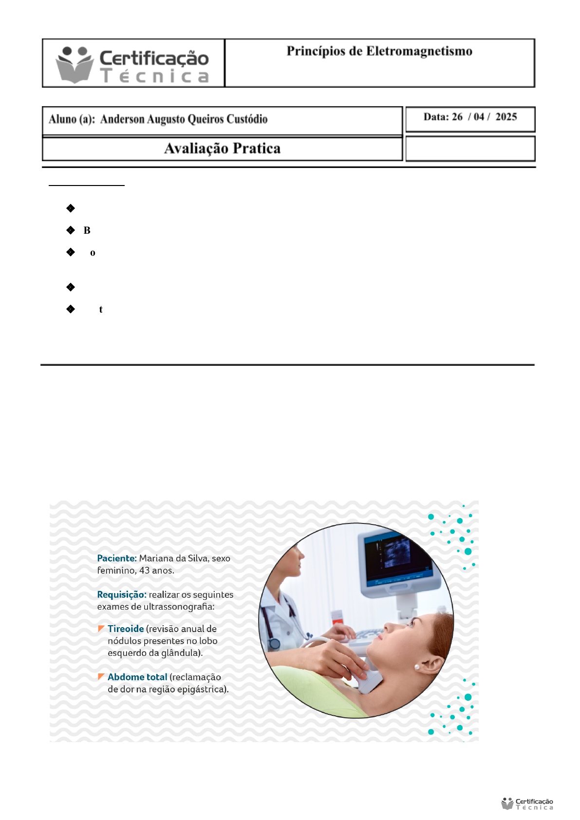 INSTRUÇÕES: ❖ Esta Avaliação contém 1 (uma) questão, totalizando 10 (dez) pontos; ❖ Baixe o arquivo disponível com a Atividade Pratica; ❖ Você deve preencher dos dados no Cabeçalho para sua identificação: o Nome / Data de entrega. ❖ As respostas devem ser digitadas abaixo de cada pergunta; ❖ Ao terminar grave o arquivo com o nome Atividade Prática; o Quando solicitado Na ultrassonografia, o equipamento que adquire as imagens apresenta uma variedade de transdutores para o estudo de diferentes partes do corpo. Esses transdutores são calibrados para gerarem ondas sonoras de frequências específicas de ultrassom. Nesse contexto, imagine que você faz parte da equipe de diagnóstico por imagem de uma clínica e recebeu a seguinte solicitação: Agora, suponha que o equipamento que você vai utilizar tem apenas dois transdutores: um de formato retangular, com frequência de 10MHz, e outro convexo, com frequência de 3,5MHz. Baseando sua resposta nos aspectos físicos das ondas sonoras, qual seria o transdutor indicado para cada exame? Justifique a sua resposta. Para o exame de tireóide, o transdutor retangular de 10 Mhz, ja que é uma estrutura superficial e precisa de alta resolução para visualizar pequenos nódulos. Para o exame de abdomen total, o transdutor convexo de 3,5 Mhz, pois o abdomen possui órgãos profundos e precisa de maior penetração para alcançar essas estruturas.