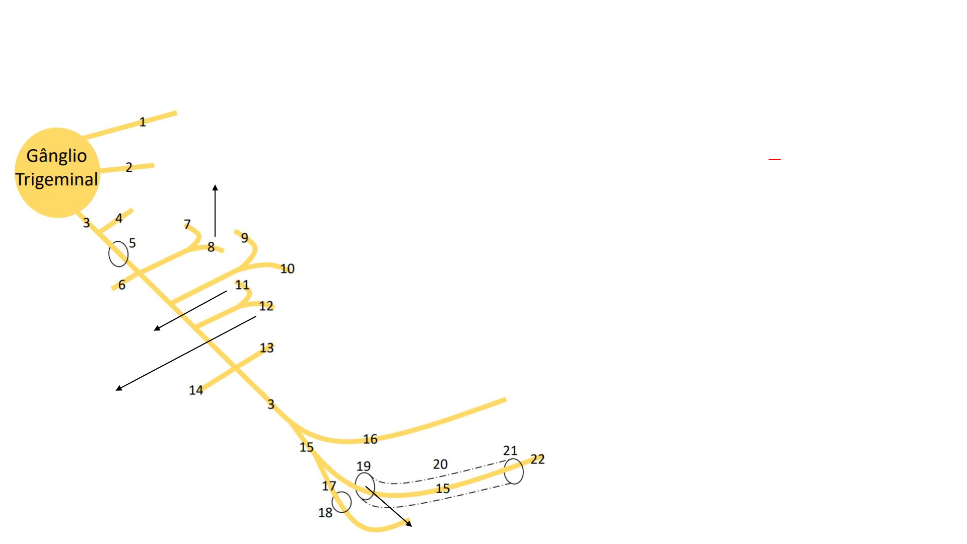 1- n. oftálmico 2- n. maxilar 3- n. mandibular 4- r. meníngeo (AI: dura-mater encefálica) 5- forame oval 6- n. auriculotemporal (AI: região temporal e cápsula da ATM) 7- n. temporal profundo posterior (AI: fibras profundas da porção posterior do m. temporal) 8- n. massetérico (AI: cápsula da ATM e m. masseter) 9- n. temporal profundo anterior (AI: fibras profundas da porção anterior do m. temporal) 10- n. bucal (AI: mucosa e pele da bochecha, gengiva vestibular dos molares inferiores e eventualmente dos molares superiores) 11- n. pterigoideo medial (AI: m. pterigoideo medial) 12- n. pterigoideo lateral (AI: m. pterigoideo lateral) 13- n. tensor do véu palatino (AI: m. tensor do véu palatino) 14- n. tensor do tímpano (AI: m. tensor do tímpano) 15- n. alveolar inferior (AI: dentes inferiores, papilas interdentais, periodonto e tecido ósseo vizinho aos dentes, 17 e 22) 16- n. lingual (AI: 2/3 anteriores da língua e mucosa da região sublingual, e gengiva lingual de todos os dentes inferiores) 17- n. milo-hioideo (AI: m. milo-hioideo, ventre anterior do m. digastrico e pele da porção inferior do mento) 18- sulco milo-hioideo 19- forame mandibular 20- canal mandibular 21- forame mentual 22- n. mentoniano (AI: pele do mento, mucosa e pele do lábio inferior, mucosa e gengiva vestibular dos dentes anteriores n. oftalmico n. maxilar n. mandibular r. meningeo Forame oval n. auriculotemporal n. TPP n. TPA n. masseterico n. bucal n. Pterigoideo medial n. Pterigoideo lateral n. Tensor do véu palatino n. Tensor do tímpano n. Alveolar inferior n. lingual n. milo-hioideo Sulco milo-hioideo Forame mandibular Canal mandibular Forame mentual n. mentoniano Nervo Mandibular
