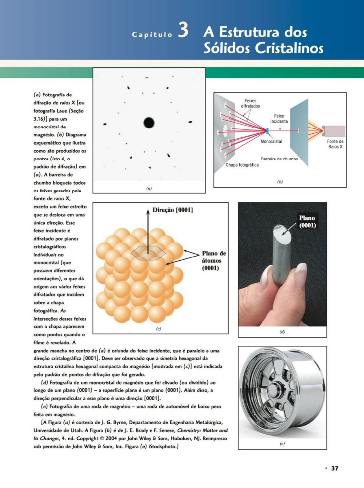 Capítulo 3 A Estrutura dos Sólidos Cristalinos (a) Fotografia de difração de raios [ou Feixes difratados fotografia Laue (Seção Feixe 3.16)] para um incidente monocristal de magnésio. (b) Diagrama esquemático que ilustra Monocristal Fonte de Raios X como são produzidos os pontos (isto é, o Barreira de chumbo padrão de difração) em Chapa fotográfica (a). A barreira de chumbo bloqueia todos (b) os feixes gerados pela (a) fonte de raios X, exceto um feixe estreito Direção [0001] que se desloca em uma Plano única direção. Esse (0001) feixe incidente é difratado por planos individuais no Plano de monocristal (que átomos possuem diferentes (0001) orientações), o que dá origem aos vários feixes difratados que incidem sobre a chapa fotográfica. As interseções desses feixes com a chapa aparecem (c) (d) como pontos quando o filme é revelado. A grande mancha no centro de (a) é oriunda do feixe incidente, que é paralelo a uma direção [0001]. Deve ser observado que a simetria hexagonal da estrutura cristalina hexagonal compacta do magnésio [mostrada em (c)] está indicada pelo padrão de pontos de difração que foi (d) Fotografia de um monocristal de magnésio que foi clivado (ou dividido) ao longo de um plano (0001) - a superfície plana é um plano (0001). Além disso, a direção perpendicular a esse plano é uma direção [0001]. (e) Fotografia de uma roda de magnésio uma roda de automóvel de baixo peso feita em magnésio. [A Figura (a) é cortesia de J. G. Byrne, Departamento de Engenharia Metalúrgica, Universidade de Utah. A Figura (b) é de J. E. Brady e F. Senese, Chemistry: Matter and Its Changes, 4. ed. Copyright 2004 por John Wiley & Sons, Hoboken, NJ. Reimpresso sob permissão de John Wiley & Sons, Inc. Figura (e) iStockphoto.] (e) 37POR QUE ESTUDAR A Estrutura dos Sólidos Cristalinos? As propriedades de alguns materiais estão diretamente Na sequência de relacionadas às suas estruturas cristalinas. Por exemplo, desempenho, as razões para estudo da estrutura dos sólidos magnésio e berílio puros e não deformados que possuem uma cristalinos são as seguintes: determinada estrutura cristalina são muito mais (isto é, Um conhecimento da estrutura cristalina do ferro nos auxilia fraturam sob menores níveis de deformação) que metais puros e a entender as transformações que ocorrem quando os aços não deformados, tais como ouro e a prata, que possuem outra são tratados termicamente para aprimorar suas propriedades estrutura cristalina (ver a Seção 7.4). mecânicas (Capítulo 10). (O ferro é principal constituinte Além disso, existem diferenças significativas de propriedades dos aços.) entre materiais cristalinos e não cristalinos que possuem a mesma A produção de uma vidrocerâmica (Capítulos 12 e 13) composição. Por exemplo, as cerâmicas e os polímeros não envolve a formação de um vidro que é subsequentemente cristalinos são, em geral, opticamente transparentes; os mesmos transformado em um sólido cristalino. Esse capítulo também materiais na forma cristalina (ou semicristalina) tendem a ser discute sucintamente a estrutura (em um nível atômico) de opacos ou, na melhor das hipóteses, translúcidos. materiais não cristalinos (isto é, que formam vidros). Objetivos do Aprendizado Após estudar este capítulo você deverá ser capaz de fazer o seguinte: 1. Descrever a diferença entre a estrutura atômica/ 5. Dados três índices de direção, esboçar a direção molecular dos materiais cristalinos e não cristalinos. correspondente a esses índices em uma célula unitária. 2. Desenhar células unitárias para as estruturas cristalinas 6. Especificar os índices de Miller para um plano traçado no cúbica de faces centradas, cúbica de corpo centrado e interior de uma célula unitária. hexagonal compacta. 7. Descrever como as estruturas cristalinas cúbica de faces 3. Desenvolver as relações entre o comprimento da aresta centradas e hexagonal compacta podem ser geradas por da célula unitária e o raio atômico para as estruturas meio do empilhamento de planos compactos de átomos. cristalinas cúbica de faces centradas e cúbica de corpo 8. Distinguir entre materiais monocristalinos e centrado. policristalinos. 4. Calcular as massas específicas para metais com as 9. Definir isotropia e anisotropia em relação às estruturas cristalinas cúbica de faces centradas e cúbica propriedades dos materiais. de corpo centrado, dadas as dimensões das suas células unitárias. 3.1 INTRODUÇÃO o Capítulo 2 tratou principalmente dos vários tipos de ligações atômicas, as quais são determinadas pelas estruturas eletrônicas dos átomos individuais. A presente discussão se dedica ao próximo nível da estrutura dos materiais, especificamente, a alguns dos arranjos que podem ser assumidos pelos átomos no estado sólido. Dentro desse contexto, são introduzidos os conceitos de cristalinidade e de não cristalinidade. Para os sólidos cristalinos, a noção de estrutura cristalina é apresentada, especi- ficada em termos de uma célula unitária. As três estruturas cristalinas comumente encontradas nos metais são então detalhadas, juntamente com o esquema através do qual são expressos os pontos, as direções e os planos cristalográficos. São tratados os materiais monocristalinos, policristalinos e não cristalinos. Outra seção desse capítulo descreve sucintamente como as estruturas cristalinas são determinadas experimentalmente através de técnicas de difração de raios X. Estruturas Cristalinas 3.2 CONCEITOS FUNDAMENTAIS Os materiais sólidos podem ser classificados de acordo com a regularidade pela qual seus átomos cristalino ou íons estão arranjados uns em relação aos outros. Um material cristalino é um material no qual os átomos estão posicionados em um arranjo periódico ou repetitivo ao longo de grandes distân- cias atômicas; isto é, existe uma ordem de longo alcance, tal que quando ocorre