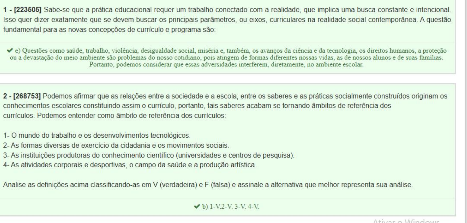 1 - [223505] Sabe-se que a prática educacional requer um trabalho conectado com a realidade, que implica uma busca constante e intencional. Isso quer dizer exatamente que se devem buscar os principais parâmetros, ou eixos, curriculares na realidade social A questão fundamental para as novas concepções de currículo e programa são: e) Questões como saúde, trabalho, violência, desigualdade social, miséria e, também, os avanços da ciência e da tecnologia, os direitos humanos, a proteção ou a devastação do meio ambiente são problemas do nosso cotidiano, pois atingem de formas diferentes nossas vidas, as de nossos alunos e de suas famílias. Portanto, podemos considerar que essas adversidades interferem, diretamente, no ambiente escolar. 2 - [268753] Podemos afirmar que as relações entre a sociedade e a escola, entre os saberes e as práticas socialmente construídos originam os conhecimentos escolares constituindo assim o currículo, portanto, tais saberes acabam se tornando âmbitos de referência dos currículos. Podemos entender como âmbito de referência dos currículos: 1- O mundo do trabalho e os desenvolvimentos tecnológicos. 2- As formas diversas de exercício da cidadania e os movimentos sociais. 3- As instituições produtoras do conhecimento científico (universidades e centros de pesquisa). 4- As atividades corporais e desportivas, o campo da saúde e a produção artística. Analise as definições acima classificando-as em V (verdadeira) e F (falsa) e assinale a alternativa que melhor representa sua análise. b)3 - [283776] De acordo com diversos autores, um currículo deve contemplar a educação não se restringindo aos conteúdos pré-determinados rígidos, mas valorizando muito mais o que o professor ensina do que aquilo que o aluno aprende. Com isso, o autor diz-nos que: b) deve ser criado um plano curricular capaz de articular todos os níveis de funcionamento de uma escola. 4 - [262616] currículo, na área educacional, conceitua-se como um processo educativo de diálogo humano em torno dos conteúdos culturais e existenciais de interesse mútuo dos alunos e professores, mediante uma ação relativamente sistemática e em busca de uma transformação pessoal e social. Assim, podemos dizer que o currículo: É um processo educativo, e não um uma etapa. II. Propicia uma transformação que, na esfera pessoal, chamamos de objetivo é levar as pessoas a aprenderem os saberes, os valores, as competências, as habilidades que orientam as suas atitudes e suas relações na sociedade. III. Direta ou indiretamente, busca uma mudança na sociedade, partindo do nível mais imediato: a escola e a comunidade. IV. É um plano de estudo, uma proposta que orienta e normatiza o processo de administração curricular, proporcionando o acompanhamento e o monitoramento dessas ações registrado em forma de documento e guardado na secretaria da escola. Assinale a alternativa que não expressa o conceito de currículo na área educacional, conforme o estudado: d) Somente IV. Ativar o Windows1 - [435517] O currículo, há muito tempo, deixou de ser apenas uma área meramente técnica, voltada para questões relativas a procedimentos, técnicas e métodos. Já se pode falar agora em uma tradição crítica do currículo, guiada por questões sociológicas, políticas e MOREIRA, A. SILVA, T. T. (Org). Currículo, cultura e sociedade. 6. ed. Cortez, 2002, p. 7-8 (com adaptações). Na perspectiva do texto acima, avalie as seguintes asserções. O currículo é considerado um artefato social e cultural. PORQUE O currículo não é um elemento inocente e neutro de transmissão desinteressada do conhecimento social, pois implica relações de poder, transmite visões sociais particulares e interessadas, não é um elemento transcendente e atemporal. A respeito dessas asserções, assinale a opção correta. a) As duas asserções são proposições verdadeiras, e a segunda é uma justificativa correta da primeira. 2 - [301222] É preciso cuidado para não ter uma visão mercantilizada dos educandos, que nesta perspectiva não passam de capital humano a ser capacitado para as demandas hierarquizadas do mercado. Neste sentido, o currículo passa a se organizar na lógica segmentada, os profissionais que trabalham esses conteúdos serão segmentados, hierarquizados e valorizados ou desvalorizados na mesma lógica segmentada e hierarquizada do mercado. Arroyo (2007) destaca que o docente deve estar atento a este processo. Assinale a alternativa que traz as consequências ao trabalho do professor apontadas pelo autor. Ativar Windows b) Atuação numa perspectiva pragmatista, utilitarista, cientificista e positivista de conhecimento e de Acesse Configurações para a3 [34585] A produção do conhecimento escolar crítico requer que a teoria anunciada na forma conceitual se transforme em ações no contexto de vida do aluno para alcançar uma visão crítica que move o seu agir no mundo para superar a visão fragmentada da realidade. (FAVERI, J. E. Filosofia da educação: o ensino da filosofia na perspectiva freireana. 2. ed. Petrópolis: Vozes, 2011, p. 44). Na perspectiva das ideias do fragmento de texto acima, analise as seguintes asserções. A concepção crítica de conteúdo fundamenta-se na relação entre o saber cotidiano do estudante, suas condições existenciais e o saber metódico já produzido. O produto dessa relação constitui sínteses qualitativamente melhoradas. PORQUE Pela reflexão crítica da realidade presente, o estudante busca organizar um novo saber na forma de teorias explicativas que identificam contradições e buscam sua superação com posturas concretas renovadas diante do seu contexto de vida. Marque a alternativa correta: a) As duas asserções são proposições verdadeiras, e a segunda é uma justificativa correta da primeira. 4 [110039] É importante conhecer a estrutura do currículo e suas diferentes dimensões, uma vez que apresentam várias