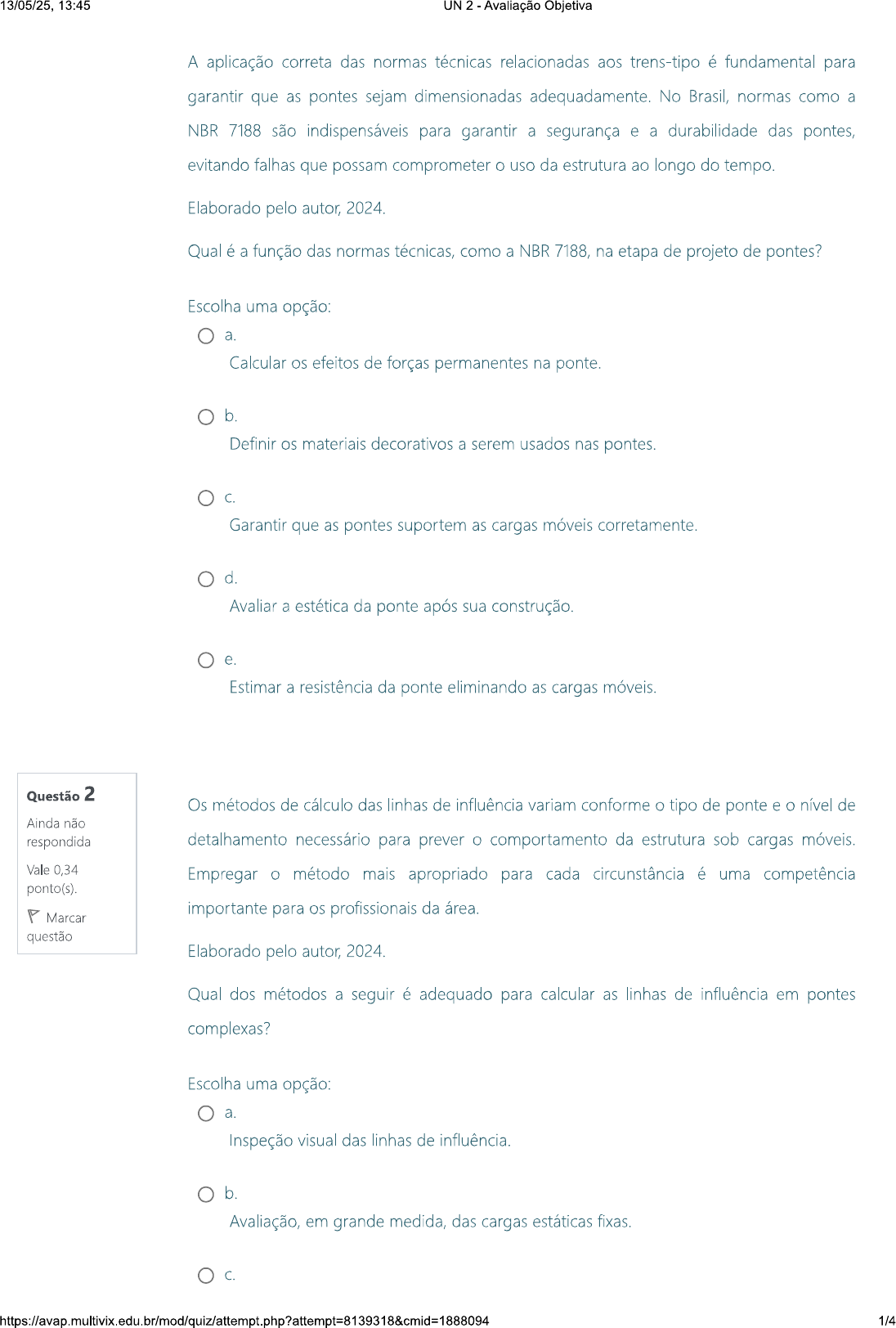 13/05/25, 13:45 UN 2 Avaliação Objetiva A aplicação correta das normas técnicas relacionadas aos trens-tipo é fundamental para garantir que as pontes sejam dimensionadas adequadamente. No Brasil, normas como a NBR 7188 são indispensáveis para garantir a segurança e a durabilidade das pontes, evitando falhas que possam comprometer uso da estrutura ao longo do tempo. Elaborado pelo autor, 2024. Qual é a função das normas técnicas, como a NBR 7188, na etapa de projeto de pontes? Escolha uma opção: a. Calcular os efeitos de forças permanentes na ponte b. Definir os materiais decorativos a serem usados nas pontes. C. Garantir que as pontes suportem as cargas móveis corretamente. d. Avaliar a estética da ponte após sua construção. e. Estimar a resistência da ponte eliminando as cargas móveis. Questão 2 Os métodos de cálculo das linhas de influência variam conforme tipo de ponte e nível de Ainda não respondida detalhamento necessário para prever O comportamento da estrutura sob cargas Vale 0,34 Empregar O método mais apropriado para cada circunstância é uma competência ponto(s). Marcar importante para os profissionais da área. questão Elaborado pelo autor, 2024. Qual dos métodos a seguir é adequado para calcular as linhas de influência em pontes complexas? Escolha uma opção: a. Inspeção visual das linhas de influência. b. Avaliação, em grande medida, das cargas estáticas fixas. C. 1/413/05/25, 13:45 UN 2 Avaliação Objetiva Uso de ferramentas decorativas e estéticas. d. O cálculo manual que dispensa a utilização de softwares. e. Aplicação do método dos elementos finitos. Questão 3 O conceito de trens-tipo é amplamente utilizado na engenharia de pontes para simular O Ainda não respondida impacto de diferentes tipos de veículos sobre a estrutura. Essas cargas móveis são Vale 0,34 padronizadas de acordo com normas técnicas, que variam conforme O país e O tipo de ponto(s). tráfego a que a ponte estará sujeita. Os trens-tipo são essenciais para O dimensionamento Marcar questão adequado das pontes, pois garantem que a estrutura suporte O tráfego de veículos como caminhões e ônibus ao longo de sua vida útil, sem comprometer a segurança estrutural. Elaborado pelo autor, 2024. Com base na aplicação de trens-tipo, é possível afirmar que: Escolha uma opção: a. são usados para testar a estética das pontes. b. simulam O impacto de pedestres e ciclistas. C. estimam a resistência da ponte sem normas técnicas. d. garantem que a ponte resista a forças estáticas. e. modelam O impacto de veículos pesados sobre a ponte. As pontes ferroviárias são projetadas para suportar cargas notoriamente diferentes frente às pontes rodoviárias, principalmente devido ao peso por eixo dos trens e à velocidade com que esses veículos se deslocam. Ademais, as vibrações geradas pelo movimento dos trens criam forças dinâmicas significativas que devem ser levadas em consideração no dimensionamento da estrutura, para garantir a durabilidade e a segurança da ponte. 2/413/05/25, 13:45 UN 2 - Avaliação Objetiva Questão 4 Elaborado pelo autor, 2024. Ainda não respondida O que torna projeto de pontes ferroviárias mais exigente do que de pontes rodoviárias? Vale 0,34 ponto(s). Escolha uma opção: Marcar a. questão Trens geram forças estáticas em baixa velocidade. b. O projeto ferroviário foca na estética da estrutura. C. As pontes ferroviárias precisam ser de madeira. d. Trens impõem maiores cargas e forças dinâmicas à estrutura. e. O tráfego de pedestres é a principal preocupação. Questão 5 As linhas de influência são uma ferramenta essencial na análise estrutural de pontes, Ainda não respondida permitindo que os engenheiros determinem modo como cargas, a exemplo de caminhões Vale 0,34 e trens, afetam diferentes pontos da estrutura. Ao analisar essas linhas, é possível prever ponto(s). quais posições das cargas geram os maiores esforços, garantindo que a ponte seja Marcar questão dimensionada para resistir às condições mais críticas de tráfego. Elaborado pelo autor, 2024. Qual é a principal função das linhas de influência no projeto de pontes? Escolha uma opção: a. Garantir que a ponte suporte ventos fortes. b. Avaliar como as cargas móveis afetam a estrutura. C. Simular impacto de cargas estáticas e permanentes. d. Verificar a estética da ponte sob diferentes ângulos. e. 3/413/05/25, 13:45 UN 2 Avaliação Objetiva Avaliar a resistência da ponte sem análise estrutural. https://avap.multivix.edu.br/mod/quiz/attempt.php?attempt=8139318&cmid=1888094 4/4