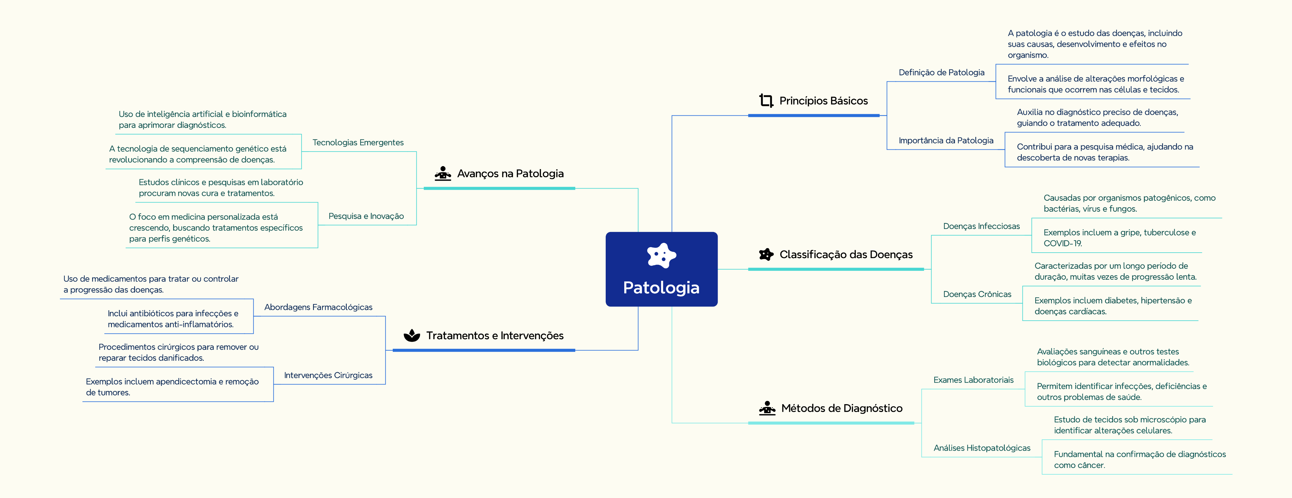 Patologia Princípios Básicos Definição de Patologia A patologia é o estudo das doenças, incluindo suas causas, desenvolvimento e efeitos no organismo. Envolve a análise de alterações morfológicas e funcionais que ocorrem nas células e tecidos. Importância da Patologia Auxilia no diagnóstico preciso de doenças, guiando o tratamento adequado. Contribui para a pesquisa médica, ajudando na descoberta de novas terapias. Classificação das Doenças Doenças Infecciosas Causadas por organismos patogênicos, como bactérias, vírus e fungos. Exemplos incluem a gripe, tuberculose e COVID-19. Doenças Crônicas Caracterizadas por um longo período de duração, muitas vezes de progressão lenta. Exemplos incluem diabetes, hipertensão e doenças cardíacas. Métodos de Diagnóstico Exames Laboratoriais Avaliações sanguíneas e outros testes biológicos para detectar anormali- dades. Permitem identificar infecções, deficiências e outros problemas de saúde. Análises Histopatológicas Estudo de tecidos sob microscópio para identificar alterações celulares. Fundamental na confirmação de diagnósti- cos como câncer. Tratamentos e Intervenções Abordagens Farmacológicas Uso de medicamentos para tratar ou controlar a progressão das doenças. Inclui antibióticos para infecções e medicamentos anti-inflamatórios. Intervenções Cirúrgicas Procedimentos cirúrgicos para remover ou reparar tecidos danificados. Exemplos incluem apendicectomia e re- moção de tumores. Avanços na Patologia Tecnologias Emergentes Uso de inteligência artificial e bioinformática para aprimorar diagnósticos. A tecnologia de sequenciamento genético está revolucionando a compreensão de doenças. Pesquisa e Inovação Estudos clínicos e pesquisas em laboratório procuram novas cura e tratamentos. O foco em medicina personalizada está crescendo, buscando tratamentos específicos para perfis genéticos.