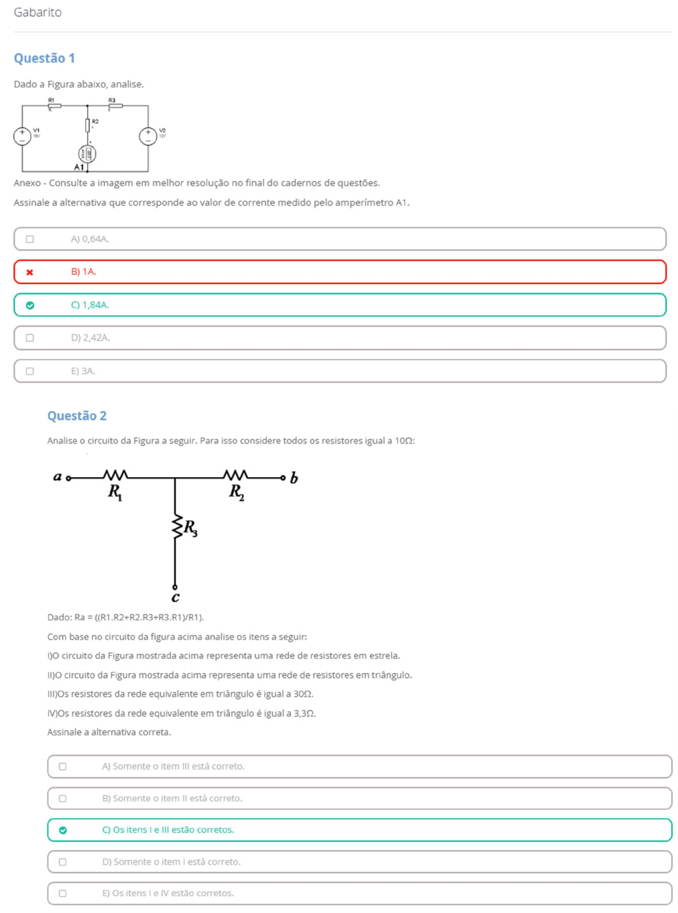 Gabarito Questão 1 Dado a Figura abaixo, analise. R1 R3 R2 VI V2 A1 Anexo - Consulte a imagem em melhor resolução no final do cadernos de questões. Assinale a alternativa que corresponde ao valor de corrente medido pelo A1. A) C) 1,84A. D) 2,42A. E) 3A. Questão 2 Analise circuito da Figura a seguir. Para isso considere todos os resistores igual a 1 R2 R3 Dado: Ra = ((R1.R2+R2.R3+R3.R1)/R1). Com base no circuito da figura acima analise os itens a seguir: I)O circuito da Figura mostrada acima representa uma rede de resistores em estrela. II)O circuito da Figura mostrada acima representa uma rede de resistores em triângulo. III)Os resistores da rede equivalente em triângulo é igual a IV)Os resistores da rede equivalente em triângulo é igual a Assinale a alternativa correta. A) Somente item III está correto. B) Somente item está correto. Os itens e III estão corretos. D) Somente item está Os itens e IV estãoQuestão 3 Os indutores são partes essenciais de circuitos elétricos, sendo utilizados em uma variedade de aplicações essenciais do dia a dia. Um indutor, elemento passivo, é uma bobina de fio, na maioria das vezes, em torno de um núcleo central que pode consistir em uma variedade de materiais. Assim, os indutores também são conhecidos como bobina ou reator. Se uma corrente elétrica flui através dessa bobina de fio, produz um campo magnético em torno dela A partir do texto apresentado, avalie as asserções a seguir e a relação proposta entre Uma propriedade importante do indutor é que ele se opõe à mudança de fluxo de corrente através dele. PORQUE, II A corrente através de um indutor não pode mudar instantaneamente. Assinale a alternativa correta: A) As asserções e são proposições falsas. B) A asserção é uma proposição falsa, e a asserção é um proposição verdadeira. C) As asserções le são proposições verdadeiras, e a asserção II é uma justificativa correta da asserção D) A asserção uma proposição verdadeira, e a asserção é um proposição falsa. E) As asserções e são proposições verdadeiras, mas a asserção não é uma justificativa correta da asserção Questão 4 Além da utilização dos capacitores em dispositivos de temporização, filtros para determinados sinais, na sintonização de rádios e TVs, os capacitores apresentam a característica de armazenamento de energia. Nos capacitores essa energia é armazenada sob a forma de: A) Potência elétrica. B) Efeito Efeito corona. D) Campo elétrico. E) Corrente elétrica. Questão 5 Utilizando as leis de circuitos elétricos, torna-se possível fazer a análise tanto de circuitos com fontes dependentes quanto circuitos elétricos com fontes independentes. Assim, analise a Figura abaixo. + Qual tipo de fonte é mostrado pela figura acima? Assinale a alternativa correta. A) Fonte de tensão controlada por tensão. x B) Fonte de corrente controlada por corrente. Fonte Independente de corrente. D) Fonte de corrente controlada por tensão. E) Fonte de tensão controlada por corrente.Questão 6 Teorema de Thévenin afirma que é possível simplificar qualquer circuito linear, independente de quão complexo, em um circuito equivalente com apenas uma única fonte de tensão em série com uma resistência, conectados em série a uma resistência denominada resistência de carga, geralmente Dado circuito da Figura 1, informe o valor da resistência de Thévenin e da tensão de Thévenin vista do resistor RL 20 12 C + 12 R 70 Anexo Consulte a imagem em melhor resolução no final do cadernos de A) 6 Ohms e 6V B) 18 Ohms e 9V C) 18 Ohms e 6V x D) 6 Ohms e 9V E) 36 Ohms e 6V Questão 7 Diversos circuitos possuem configurações que não permitem serem simplificados utilizando apenas essas associações, sendo necessário, para tanto, utilizar conceito de circuitos de três terminais. Esse tipo de rede de circuito elétrico pode ser classificado em estrela ou em circuitos do tipo delta, e podem ser transformados um em outro para simplificação da análise da avaliação desses sistemas elétricos. 100 300 100 100 300 b Anexo Consulte a imagem em melhor resolução no final do cadernos de questões. Sabe-se que em uma configuração como do circuito pode-se realizar a simplificação do circuito por meio da transformação Delta-estrela ou Estrela- delta R a b R, R. R Anexo - Consulte a imagem em melhor resolução no final do cadernos de questões. R1 A) B) 200 600 D) 450 E) 150Questão 8 Um circuito com três resistores de iguais valores estão em série, como mostrado na figura abaixo. + R1 - R2 R3 Anexo - Consulte a imagem em melhor resolução no final do cadernos de questões. Em uma aplicação de instrumentação eletrônica é necessário saber a tensão V1 sobre resistor R1, sabendo que a tensão de alimentação V = assinale a alternativa que apresenta valor de V1. Questão 9 Dado circuito abaixo, analise. R1-80 + V1=12V V2=18V + Anexo - Consulte a imagem em melhor resolução no final do cadernos de questões. Com base no circuito ilustrado na figura acima, valor (aproximado) da corrente que circula através do resistor R2 é: x C) 3A. D) 6A. E) 0,95A.Questão 10 Analise circuito a seguir. R1 R2 10 10 + V1 R3 12V 10 Assinale a alternativa que apresenta o valor da tensão sobre elemento A) 7V. x 5V. D) 3V. E) 4V. Questão 11 Os métodos de análise de circuitos são essenciais para projetos elétricos em geral. Para a realização do cálculo de dimensionamento leva-se em consideração as características da carga acionada, tais como potência, tensão de operação e corrente elétrica. No circuito da Figura, a lâmpada tem especificação de 45W e tensão de operação de 120V. deste modo, determine a tensão Vs que garanta a operação da lâmpada nas condições + Anexo - Consulte a imagem em melhor resolução no final do cadernos de questões. A) 380V B) 195V C) 80V x D) 120V E) 75V Questão 12 A análise nodal, ou método do fornece um procedimento genérico
