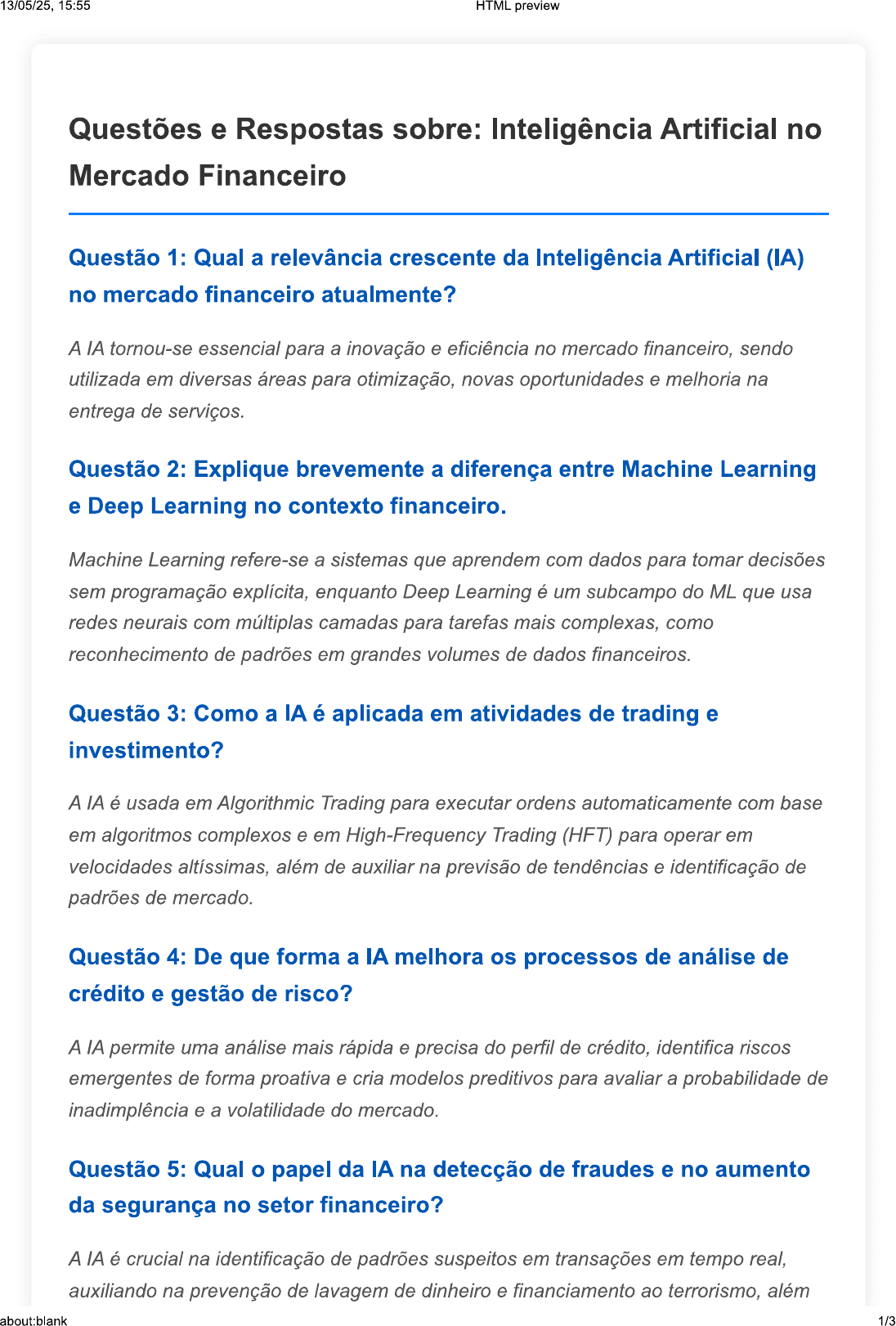 13/05/25, 15:55 HTML preview Questões e Respostas sobre: Inteligência Artificial no Mercado Financeiro Questão 1: Qual a relevância crescente da Inteligência Artificial (IA) no mercado financeiro atualmente? A IA tornou-se essencial para a inovação e eficiência no mercado financeiro, sendo utilizada em diversas áreas para otimização, novas oportunidades e melhoria na entrega de serviços. Questão 2: Explique brevemente a diferença entre Machine Learning e Deep Learning no contexto financeiro. Machine Learning refere-se a sistemas que aprendem com dados para tomar decisões sem programação explícita, enquanto Deep Learning é um subcampo do ML que usa redes neurais com múltiplas camadas para tarefas mais complexas, como reconhecimento de padrões em grandes volumes de dados financeiros. Questão 3: Como a IA é aplicada em atividades de trading e investimento? A IA é usada em Algorithmic Trading para executar ordens automaticamente com base em algoritmos complexos e em High-Frequency Trading (HFT) para operar em velocidades altíssimas, além de auxiliar na previsão de tendências e identificação de padrões de mercado. Questão 4: De que forma a IA melhora os processos de análise de crédito e gestão de risco? A IA permite uma análise mais rápida e precisa do perfil de crédito, identifica riscos emergentes de forma proativa e cria modelos preditivos para avaliar a probabilidade de inadimplência e a volatilidade do mercado. Questão 5: Qual o papel da IA na detecção de fraudes e no aumento da segurança no setor financeiro? A IA é crucial na identificação de padrões suspeitos em transações em tempo real, auxiliando na prevenção de lavagem de dinheiro e financiamento ao terrorismo, além about:blank 1/313/05/25, 15:55 HTML preview de fortalecer as defesas contra ataques cibernéticos. Questão 6: Quais os benefícios de utilizar chatbots e assistentes virtuais baseados em IA no atendimento ao cliente financeiro? Chatbots e assistentes virtuais com IA proporcionam atendimento 24/7, respostas rápidas a perguntas comuns, análise de sentimento do cliente e podem oferecer recomendações personalizadas de produtos. Questão 7: que são robo-advisors e como a IA os possibilita? Robo-advisors são plataformas que utilizam IA para oferecer consultoria e gestão de investimentos automatizada e personalizada, criando e rebalanceando portfólios com base no perfil e objetivos do investidor de forma eficiente e, geralmente, a custos menores. Questão 8: Como a IA se relaciona com o conceito de RegTech (Regulatory Technology)? A IA é um componente chave da RegTech, auxiliando as instituições financeiras a cumprir regulamentações de forma mais eficiente e precisa através da automação de processos de compliance, monitoramento e geração de relatórios regulatórios. Questão 9: Cite pelo menos dois grandes desafios na implementação da IA no setor financeiro. Dois desafios significativos são a necessidade de dados de alta qualidade para treinar os modelos de IA e a questão da "caixa preta", que se refere à dificuldade em interpretar e explicar as decisões tomadas por alguns algoritmos de IA, além de preocupações com viés e regulação. Questão 10: Quais são algumas perspectivas futuras para o uso da IA no mercado financeiro? As perspectivas futuras incluem maior integração da IA com Open Finance, o avanço no uso de IA Generativa para simulações e criação de conteúdo, e o desenvolvimento de regulações mais específicas para governar o uso da IA no setor. Gabarito about:blank 2/313/05/25, 15:55 HTML preview 1. A IA tornou-se essencial para a inovação e eficiência no mercado financeiro, sendo utilizada em diversas áreas para otimização, novas oportunidades e melhoria na entrega de serviços. 2. Machine Learning refere-se a sistemas que aprendem com dados sem programação explícita, enquanto Deep Learning usa redes neurais com múltiplas camadas para tarefas mais complexas. 3. É aplicada em Algorithmic Trading para executar ordens automaticamente e em High-Frequency Trading (HFT) para operar em velocidades altíssimas, além de previsão de tendências. 4. Permite análise mais rápida e precisa do perfil de crédito, identifica riscos emergentes e cria modelos preditivos para inadimplência e volatilidade. 5. É crucial na identificação de padrões suspeitos em transações em tempo real, auxiliando na prevenção de lavagem de dinheiro e fortalecendo a segurança cibernética. 6. Proporcionam atendimento 24/7, respostas rápidas, análise de sentimento e recomendações personalizadas. 7. Robo-advisors são plataformas que utilizam IA para oferecer consultoria e gestão de investimentos automatizada e personalizada. 8. É um componente chave da RegTech, auxiliando a cumprir regulamentações de forma mais eficiente e precisa através da automação de processos. 9. Qualidade dos Dados e a "Caixa Preta" (dificuldade de explicabilidade) são desafios significativos, além de viés e regulação. 10. Maior integração com Open Finance, avanço em IA Generativa e desenvolvimento de regulações específicas para o uso da IA no setor. about:blank 3/3