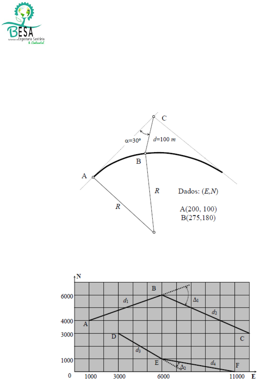 UNIVERSIDADE FEDERAL DO OESTE DO PARÁ DISCIPLINA: CARTOGRAFIA E TOPOGRAFIA PROFESSORA: JOSIANE LEITE Exercício Avaliativo (AV1) – 10,0 1. Calcular o raio R da curva circular da figura abaixo. (Dica: lei dos senos e cossenos) 2. Calcular os comprimentos e os azimutes dos alinhamentos da figura abaixo. Calcular também os ângulos de deflexão. 3. O azimute é o ângulo, no plano horizontal, de uma direção qualquer com o meridiano. O rumo de 76º 30’ SE de uma visada a vante corresponde ao azimute de: a) 103º 30’ b) 166º 30’ UNIVERSIDADE FEDERAL DO OESTE DO PARÁ DISCIPLINA: CARTOGRAFIA E TOPOGRAFIA PROFESSORA: JOSIANE LEITE c) 256º 30’ d) 283º 30’ 4. Calcular os comprimentos e os azimutes dos alinhamentos da figura a seguir. Calcular também os ângulos de deflexão. 5. Nos projetos de estradas de rodagem, os perfis longitudinais são desenhados em papel quadriculado ou milimetrado, em escalas horizontais (distâncias) e verticais (cotas), que normalmente guardam uma proporção de: a) 10:1 b) 2:3 c) 1:10 d) 3:2 6. Ao se somar 48 20'17" e 98 30'29", obtém-se: a) 50 10'12" b) 118 30'29" c) 120 59'18" d) 146 50'46 7. Determine o azimute correspondente ao rumo de 27°38'40" SW. 8. Determine o rumo e a direção correspondente ao azimute de 156°10'37". UNIVERSIDADE FEDERAL DO OESTE DO PARÁ DISCIPLINA: CARTOGRAFIA E TOPOGRAFIA PROFESSORA: JOSIANE LEITE 9. O nivelamento que realiza a medida da diferença de nível entre pontos do terreno por intermédio de leituras correspondentes a visadas horizontais, obtidas com um nível, em miras colocadas verticalmente nos referidos pontos, é o: a) nivelamento barométrico. b) nivelamento geométrico. c) levantamento planialtimétrico. d) levantamento planimétrico. 10. Projeção cartográfica é a representação de uma superfície esférica num plano (mapa), podendo ser definida como um sistema plano de paralelos e meridianos, sobre os quais desenhamos um mapa. Há vários tipos de projeções que são classificadas em três grupos básicos: cilíndricas, cônicas e azimutais, como mostram as ilustrações. Sobre os tipos de projeções. Assinale as afirmativas verdadeiras e as afirmativas falsas: ( ) na projeção cônica, todos os meridianos são linhas retas convergentes e os paralelos são círculos concêntricos; ( ) quando utilizarmos uma projeção cilíndrica, temos meridianos e paralelos representados por linhas retas que se cruzam em ângulos retos; ( ) as projeções cilíndricas são as preferidas para representar as regiões polares, porque apresentam menores distorções; ( ) nas projeções azimutais, os meridianos são representados por círculos concêntricos e os paralelos por linhas retas convergentes; ( ) a projeção cilíndrica mais conhecida é a de Mercator, preferida pelos navegantes e adotada no Brasil. UNIVERSIDADE FEDERAL DO OESTE DO PARÁ DISCIPLINA: CARTOGRAFIA E TOPOGRAFIA PROFESSORA: JOSIANE LEITE 11. Palavras cruzadas 1. Nivelamento no qual se obtém distâncias indiretamente. 2. Conjunto de operações que tem por objetivo a determinação de alturas. 3. Altura que tem como referencial uma superfície arbitrária. 4. Altura que tem como referencial uma superfície coincidente com o nível médio do mar. 5. Nivelamento no qual as alturas são determinadas através de instrumentos que definem retas no plano horizontal. 6. Distância vertical compreendida entre dois pontos considerados. 7. Nivelamento que se baseia na medida de distâncias horizontais e ângulos de inclinação para a determinação da cota ou altitude de um ponto através de relações trigonométricas . 8. É a representação no plano vertical das alturas obtidas em um nivelamento 9. Lugar geométrico em que todos os ponto possuem mesma altura. 10. A diferença de nível é determinada em função da variação de pressão em relação a variação de altitude. 1 A 2 L 3 T 4 I 5 M 6 E 7 T 8 R 9 I 10 A 12. A distância diferencial que separa o Geóide do Elipsóide é: a) altura topográfica b) altura normal UNIVERSIDADE FEDERAL DO OESTE DO PARÁ DISCIPLINA: CARTOGRAFIA E TOPOGRAFIA PROFESSORA: JOSIANE LEITE c) altura geométrica d) altura geoidal ou ortométrica 13. Numere a figura e as frases. 1. Superfície topográfica 2. Geóide 3. Elipsóide ( ) Forma verdadeira da Terra com suas montanhas, vales, oceanos e outras incontáveis saliências e reentrâncias geográficas. ( ) Superfície que mais se aproxima do nível médio dos mares. ( ) Sólido geométrico gerado por uma elipse que gira em torno do seu eixo menor. ( ) Forma definida matematicamente que mais se aproxima da forma verdadeira da Terra. ( ) É utilizada como referência padrão para as medidas de altitudes. ( ) É a superfície física (de existência real) onde são executadas as medições e observações cartográficas 14. Os tipos de ângulos horizontais utilizados em topografia podem ser goniométricos e azimutais e são classificados em: a) Azimute: É o ângulo formado entre o alinhamento e a direção norte-sul, tendo como origem a direção norte e grandeza variável entre 0º e 360º, contado no sentido horário. b) Ângulo horário (interno/externo): É o ângulo formado entre o alinhamento e a direção norte sul, tendo como origem a direção norte-sul e com grandeza variável entre 0º e 90º. UNIVERSIDADE FEDERAL DO OESTE DO PARÁ DISCIPLINA: CARTOGRAFIA E TOPOGRAFIA PROFESSORA: JOSIANE LEITE c) Deflexão: É o ângulo formado entre dois alinhamentos, contados no sentido horário e variável de 0º a 360º. d) Rumo: É o ângulo formado entre o prolongamento do alinhamento anterior ao alinhamento em estudo, contado para a direita ou para a esquerda e tendo sua grandeza limitada de 0º e 180º. 15. O ângulo formado entre o alinhamento e a direção norte-sul, tendo como origem a direção norte ou sul e com grandeza variável entre 0° e 90, é um: a) rumo b) azimute c) deflexão d) ângulo horário 16. Converter os rumos em azimutes: a) 60 05’30