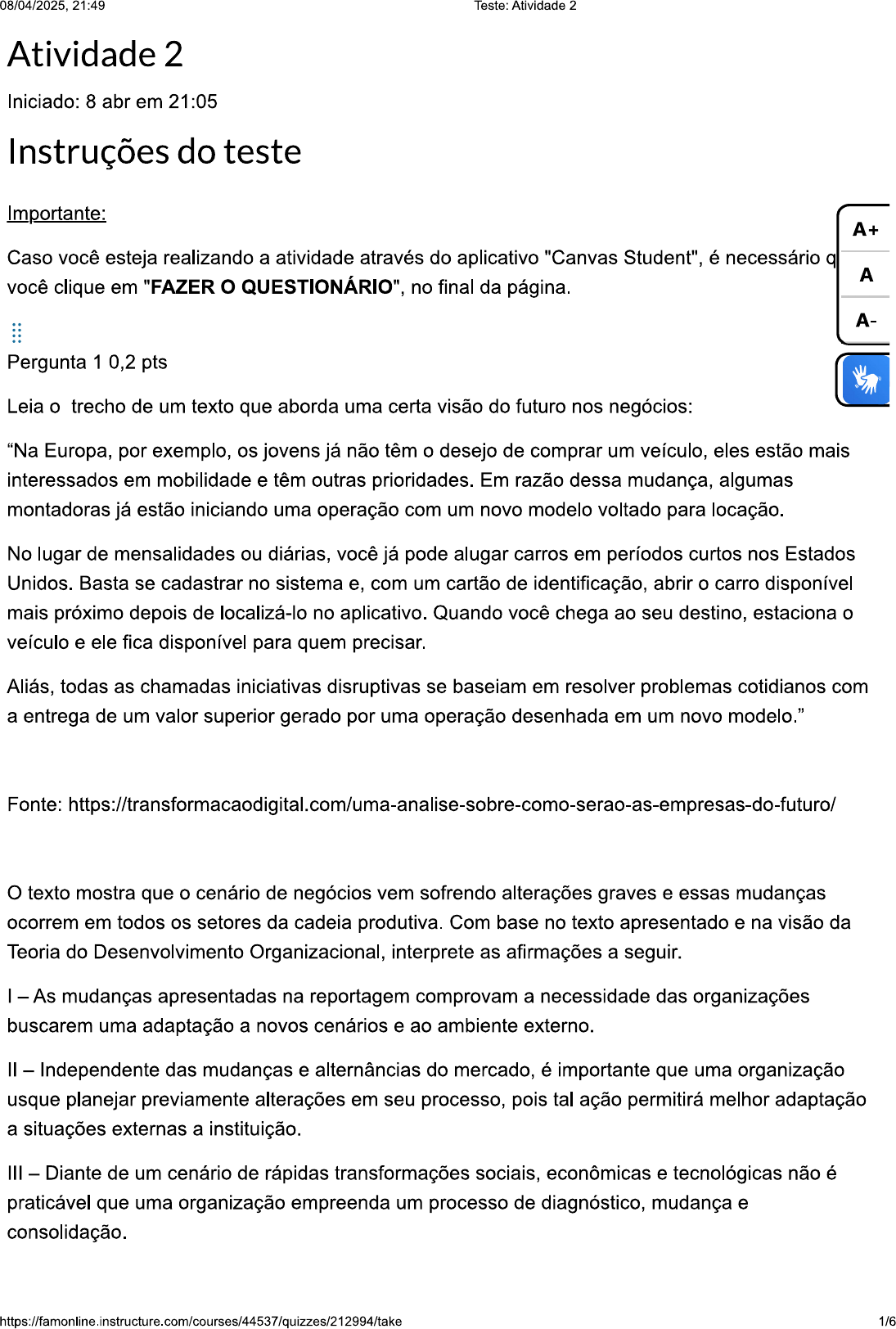 08/04/2025, 21:49 Teste: Atividade 2 Atividade 2 Iniciado: 8 abr em 21:05 Instruções do teste Importante: A+ Caso você esteja realizando a atividade através do aplicativo "Canvas Student", é necessário q A você clique em "FAZER o QUESTIONÁRIO", no final da página. A- Pergunta 1 0,2 pts Leia o trecho de um texto que aborda uma certa visão do futuro nos negócios: "Na Europa, por exemplo, os jovens já não têm o desejo de comprar um veículo, eles estão mais interessados em mobilidade e têm outras prioridades. Em razão dessa mudança, algumas montadoras já estão iniciando uma operação com um novo modelo voltado para locação. No lugar de mensalidades ou diárias, você já pode alugar carros em períodos curtos nos Estados Unidos. Basta se cadastrar no sistema e, com um cartão de identificação, abrir o carro disponível mais próximo depois de localizá-lo no aplicativo. Quando você chega ao seu destino, estaciona o veículo e ele fica disponível para quem precisar. Aliás, todas as chamadas iniciativas disruptivas se baseiam em resolver problemas cotidianos com a entrega de um valor superior gerado por uma operação desenhada em um novo modelo." Fonte: texto mostra que o cenário de negócios vem sofrendo alterações graves e essas mudanças ocorrem em todos os setores da cadeia produtiva. Com base no texto apresentado e na visão da Teoria do Desenvolvimento Organizacional, interprete as afirmações a - As mudanças apresentadas na reportagem comprovam a necessidade das organizações buscarem uma adaptação a novos cenários e ao ambiente externo. Il - Independente das mudanças e alternâncias do mercado, é importante que uma organização usque planejar previamente alterações em seu processo, pois tal ação permitirá melhor adaptação a situações externas a instituição. III - Diante de um cenário de rápidas transformações sociais, econômicas e tecnológicas não é praticável que uma organização empreenda um processo de diagnóstico, mudança e consolidação. https://famonline.instructure.com/courses/44537/quizzes/212994/take 1/608/04/2025, 21:49 Teste: Atividade 2 É correto o que se afirma em: II, apenas. II, apenas. e III, apenas. A+ A apenas. A- III, apenas. Pergunta 2 0,2 pts O texto abaixo foi extraído de um site de consultoria: "Podemos definir mudança organizacional como um conjunto de transformações que levam a empresa de um estado a outro. Com mercados cada vez mais dinâmicos e globalizados, essas alterações se tornam cada vez mais frequentes e necessárias. No contexto organizacional, as mudanças costumam ocorrer com objetivo de alcançar melhorias em diferentes aspectos, tais como: Processos internos; Estrutura; Tarefas; Metodologias e ferramentas de trabalho; Mensuração de resultados Comportamentos; Recursos humanos; Identidade organizacional; Posicionamento; Uso de novas tecnologias; Integração de setores." Fonte: https://www.setting.com.br/mudanca-organizacional/ Considerando as ideias e etapas de mudança organizacional, avalie as seguintes asserções e a relação proposta entre elas. I. As forças externas promovem a necessidade de mudança de organização, caso contrário, uma empresa terá dificuldades de permanecer no mercado. https://famonline.instructure.com/courses/44537/quizzes/212994/take 2/608/04/2025, 21:49 Teste: Atividade 2 PORQUE II. Não são todas organizações que necessitam ter uma preocupação com as forças externas com o objetivo de realizar alguma mudança na sua estrutura. A respeito dessas asserções, assina a opção correta: A+ As asserções e são proposições verdadeiras, mas a não é uma justificativa da I. A A- As asserções e são ambas proposições falsas. A asserção I é uma proposição verdadeira, e a é uma proposição falsa. As asserções e são proposições verdadeiras, e a é uma justificativa da I. A asserção é uma proposição falsa, e a é uma proposição verdadeira. Pergunta 3 0,2 pts trecho abaixo foi extraído de um artigo de um site sobre a ação do gerente/adminsitrador: "Uma das funções do administrador é tomar decisões, é ter autonomia para escolher qual caminho seguir. O que acontece muitas vezes em grandes empresas (e nas pequenas e médias também) é que o gerente assume um papel de "vigia da colheita", se limitando apenas a função de mandar e supervisionar." Fonte: Pensando nas questões que envolvem a tomada de decisão por parte de um gestor é possível considerar que o texto está incorreto, pois o gestor deve somente supervisionar. ele tem um papel de liderança junto aos outros funcionários. na maior parte das empresas o gestor deve somente mandar. ele não necessita desenvolver uma habilidade de conciliação. https://famonline.instructure.com/courses/44537/quizzes/212994/take 3/608/04/2025, 21:49 Teste: Atividade 2 não está em seu escopo fazer ligações com a equipe. Pergunta 4 0,2 pts trecho abaixo é parte das considerações finais de um artigo científico quanto a aplicação do Sistema Toyota de Produção STP: A+ A "A aplicação de princípios do STP proporcionou uma mudança considerável no processo de ref de componentes. No que diz respeito aos resultados, identificou-se o aumento da capacidade A- produtividade, redução do lead time de reforma, aumento da utilização da mão de obra e redução 00 número de reformas externas. Conclui-se que a aplicação de metodologias e técnicas, mesmo vindas de outros ramos da indústria, pode resultar em diversos ganhos em um processo de manutenção. Como trabalhos futuros, propõe-se a expansão desses princípios para a reforma dos demais componentes e também para as demais oficinas dessa mineradora." Fonte: XXXVII ENCONTRO NACIONAL DE ENGENHARIA DE PRODUCAO "A Engenharia de Produção e as novas tecnologias produtivas: indústria 4.0, manufatura aditiva e outras abordagens avançadas de produção" Joinville, SC, Brasil, 10 a 13 de outubro de 2017. 21 Qual das 