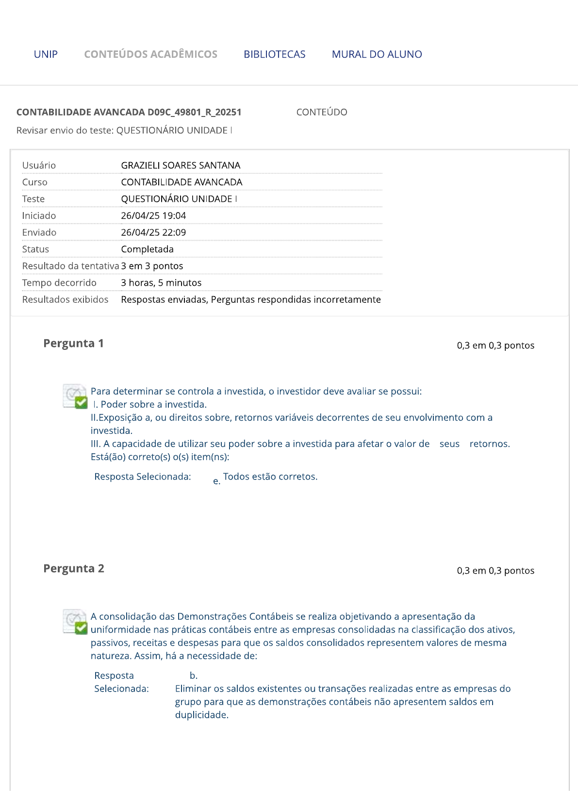 UNIP CONTEÚDOS ACADÊMICOS BIBLIOTECAS MURAL DO ALUNO CONTABILIDADE AVANCADA D09C_49801_R_20251 CONTEÚDO Revisar envio do teste: QUESTIONÁRIO UNIDADE Usuário GRAZIELI SOARES SANTANA Curso CONTABILIDADE AVANCADA Teste QUESTIONÁRIO UNIDADE Iniciado 26/04/25 19:04 Enviado 26/04/25 22:09 Status Completada Resultado da tentativa 3 em 3 pontos Tempo decorrido 3 horas, 5 minutos Resultados exibidos Respostas enviadas, Perguntas respondidas incorretamente Pergunta 1 0,3 em 0,3 pontos Para determinar se controla a investida, o investidor deve avaliar se possui: I. Poder sobre a a, ou direitos sobre, retornos variáveis decorrentes de seu envolvimento com a investida. III. A capacidade de utilizar seu poder sobre a investida para afetar o valor de seus retornos. Está(ão) correto(s) o(s) item(ns): Resposta Selecionada: Todos estão corretos. e. Pergunta 2 0,3 em 0,3 pontos A consolidação das Demonstrações Contábeis se realiza objetivando a apresentação da uniformidade nas práticas contábeis entre as empresas consolidadas na classificação dos ativos, passivos, receitas e despesas para que os saldos consolidados representem valores de mesma natureza. Assim, há a necessidade de: Resposta b. Selecionada: Eliminar os saldos existentes ou transações realizadas entre as empresas do grupo para que as demonstrações contábeis não apresentem saldos em duplicidade.Pergunta 3 0,3 em 0,3 pontos As perdas intragrupo podem indicar redução do valor recuperável dos ativos correspondentes que precisa: Resposta Selecionada: d. Ser reconhecida nas demonstrações contábeis consolidadas. Pergunta 4 0,3 em 0,3 pontos Na ausência de quaisquer acordos adicionais que alterem a tomada de decisões, a avaliação do controle se concentra em: Resposta b. Selecionada: Instrumentos patrimoniais que conferem ao seu titular direitos de voto proporcionais. Pergunta 5 0,3 em 0,3 pontos principal objetivo de se ter o controle de uma companhia é: Resposta C. Selecionada: Determinar as políticas operacional e de financiamento da investida. Pergunta 6 0,3 em 0,3 pontos A Participação dos Não Controladores é a parte do patrimônio líquido de uma controlada não atribuível, direta ou indiretamente, à controladora. É a parcela do patrimônio líquido de empresas controladas que pertence a acionistas minoritários, representados por terceiros que não pertencem ao grupo. valor dessa participação é constituído pela parte do capital desses minoritários e pelos outros itens do patrimônio líquido. Na consolidação do Balanço, a parcela do capital desses minoritários (ou não controladores) deve: Resposta Selecionada: Ser destacada no patrimônio líquido consolidado. C.Pergunta 7 0,3 em 0,3 pontos Para muitas investidas, uma série de atividades operacionais e de financiamento afetam significativamente seus retornos. Entre elas, pode-se destacar: I. Compra e venda de bens ou serviços. II. Gestão de ativos financeiros durante sua vida (incluindo em caso de inadimplência). III. Seleção, aquisição ou alienação de ativos. IV. Pesquisa e desenvolvimento de novos produtos ou processos. V. Determinação da estrutura de capital para obtenção de recursos. Está(ão) correto(s) o(s) item(ns): Resposta Selecionada: I, II, III, IV e V. C. Pergunta 8 0,3 em 0,3 pontos Considerando as disposições da Lei n. 6.404/76 e as alterações posteriores, assinale a opção INCORRETA. Resposta d. Selecionada: O valor contábil do investimento em coligada abrange o custo de aquisição mais a equivalência patrimonial e o ágio não amortizado, deduzido do deságio não amortizado e da provisão para perdas. Pergunta 9 0,3 em 0,3 pontos Deverá deixar de ser avaliado pelo método de equivalência patrimonial, o investimento em sociedades coligadas e controladas de: Resposta a. Selecionada: Empresa em efetiva e clara evidência de perda de continuidade de suas operações ou no caso em que estas estejam operando sob severas restrições em longo prazo que prejudiquem significativamente a sua capacidade de transferir recursos para a investidora. Pergunta 10 0,3 em 0,3 pontosSe uma empresa do grupo vendeu, ao preço de custo, $ 16.000 de mercadorias para outra empresa do grupo, a empresa compradora tem um passivo de $ 16.000 para com a empresa vendedora, e esta, por sua vez, tem a receber $ 16.000 da empresa compradora. Nesse caso, os lançamentos de eliminações são: Resposta a. Selecionada: Fornecedores (empresa compradora) $16.000 a Duplicatas a Receber (empresa vendedora) $16.000. Terça-feira, 13 de Maio de 2025 21h46min21s BRT OK