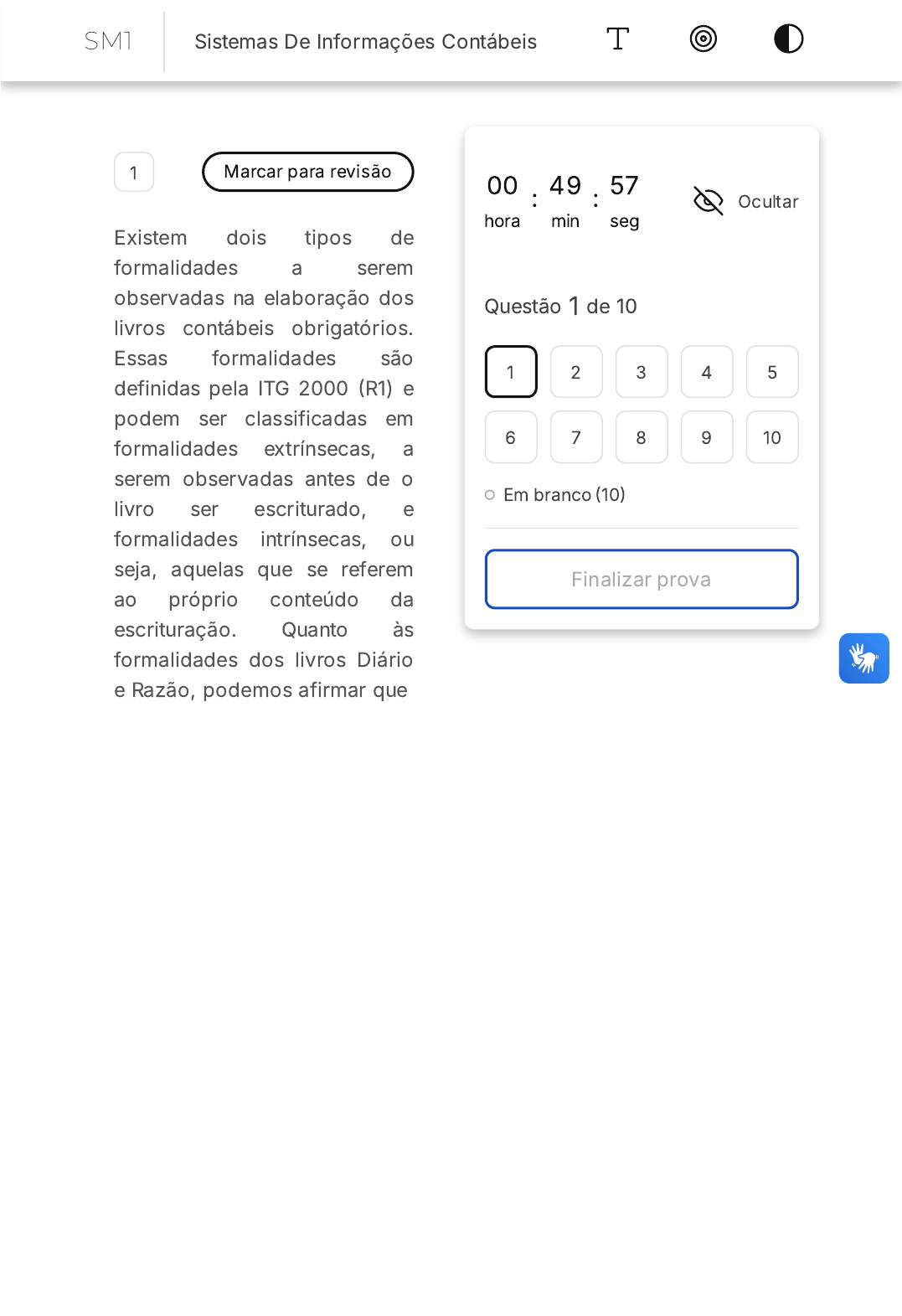 1 Marcar para revisão Existem dois tipos de formalidades a serem observadas na elaboração dos livros contábeis obrigatórios. Essas formalidades são definidas pela ITG 2000 �R1) e podem ser classificadas em formalidades extrínsecas, a serem observadas antes de o livro ser escriturado, e formalidades intrínsecas, ou seja, aquelas que se referem ao próprio conteúdo da escrituração. Quanto às formalidades dos livros Diário e Razão, podemos afirmar que 00 hora : 49 min : 57 seg Ocultar Questão 1 de 10 Em branco �10� Finalizar prova 1 2 3 4 5 6 7 8 9 10 SM1 Sistemas De Informações Contábeis A B C Em relação à autenticação dos livros, podemos considerar como obrigatória a autenticação do Livro Razão e facultativa a do Livro Diário. As pessoas jurídicas que apresentem a Escrituração Contábil Digital �ECD) por meio do Sistema Público de Escrituração Digital �SPED�, também deverão submeter os livros digitais para autenticação na junta comercial do estado. A escrituração deverá ser completa, em idioma e moeda corrente de preferência da empresa, sem linhas em branco, nem entrelinhas, borrões, rasuras, emendas ou folhas em branco. D E Os livros em forma digital devem ser assinados manualmente pela entidade e pelo profissional da contabilidade regularmente habilitado. Em caso de escrituração contábil em forma digital, não há necessidade de impressão e encadernação em forma de livro. 2 Marcar para revisão A escrituração envolve o registro de todos os acontecimentos de uma entidade, sejam eles relacionados com as modificações qualitativas ou quantitativas do patrimônio. Contudo, quando se trata especificamente da escrituração contábil, dizemos que está voltada aos registros de todos os fatos contábeis. Sendo assim, a escrituração contábil é apoiada em dois tipos de livros: principais e auxiliares. São considerados livros principais: A B C D E Livro Caixa e Livro de Contas a Receber. Livro de Registro de Duplicatas e Livro de Contas a Pagar. Livro Diário e Livro Razão. Livro Diário e Livro Caixa. Livro Razão e Livro Caixa. 3 Marcar para revisão Para que sejam colocados à disposição da administração os dados que proporcionam a tomada de decisões em tempo hábil, faz-se necessário a utilização de um sistema informatizado que proporcione ao contador se beneficiar da grande quantidade de informações centralizadas na contabilidade e elaborar relatórios nos vários aspectos gerenciais. No sistema informatizado, o nome técnico que identifica um componente patrimonial (bem, direito, obrigação e PL) ou um componente de resultado A B C D E A B (receita, custo ou despesa) a ser registrado na contabilidade é Conta. Lançamento. Débito. Crédito. Histórico. 4 Marcar para revisão O conjunto de contas usado para registrar as atividades de uma empresa, que serve de base para estruturar demonstrações contábeis como o balanço patrimonial �BP) e a Demonstração do Resultado do Exercício é denominado Plano de Contas. Balanço Patrimonial. C D E A B Demonstrações Contábeis. Demonstração de Resultados. Lançamento Contábil. 5 Marcar para revisão O Plano de Contas pode ser definido como o conjunto de contas, previamente estabelecido, que norteia os trabalhos contábeis de registro de fatos e atos inerentes à entidade, além de servir de parâmetro para a elaboração das demonstrações contábeis. As contas devem ser agrupadas de acordo com a estrutura estabelecida pela Lei 6.404/1976 e pelo Comitê de Pronunciamentos Contábeis �CPC�. De acordo com as normas contábeis, são consideradas contas patrimoniais: Ativo Circulante e Custo. Receitas e Patrimônio Líquido. C D E Ativo Não Circulante e Passivo Circulante. Patrimônio Líquido e Despesas. Ativo e Receitas. 6 Marcar para revisão O Conselho Federal de Contabilidade �CFC) editou a norma técnica intitulada: ITG 2000 �R1� - Escrituração Contábil, com a finalidade de estabelecer critérios e procedimentos a serem adotados pela entidade para a escrituração contábil de seus fatos patrimoniais. Quanto às formalidades estabelecidas pela norma técnica podemos afirmar que A B C Em se tratando de empresa subsidiária, estabelecida no país e com sede no exterior, a escrituração poderá ser realizada em moeda estrangeira, tendo como base o dólar. A escrituração contábil e a emissão de relatórios, peças, análises, demonstrativos e demonstrações contábeis são de atribuição e de responsabilidade exclusivas do profissional da contabilidade legalmente habilitado. Quanto à documentação de suporte para a realização da escrituração, o simples comprovante da transação de pagamento emitido é suficiente para suportar o gasto. D E A escrituração contábil poderá ser executada em ordem atemporal, ou seja, a ordem cronológica de apresentação dos lançamentos não precisa ser observada, desde que estejam dentro do período de elaboração das demonstrações contábeis. A escrituração em forma contábil deve conter, no mínimo: a conta devedora, a conta credora e o valor do registro contábil. 7 Marcar para revisão As Interpretações Técnicas têm por finalidade esclarecer a aplicação das Normas Brasileiras de Contabilidade, definindo regras e procedimentos a serem aplicados em situações, transações ou atividades específicas, sem alterar a substância dessas normas. A ITG 2000 �R1) está entre as interpretações técnicas, em que os profissionais de contabilidade estão obrigados A B a aplicar, tendo como objetivo principal de Estabelecer critérios e procedimentos a serem adotados pela entidade para a escrituração contábil de seus fatos patrimoniais, por meio de qualquer processo, bem como a guarda e a manutenção da documentação e de arquivos contábeis e a responsabilidade do profissional da contabilidade. Estabelecer critérios e procedimentos simplificados a serem observados pelas microempresas e e