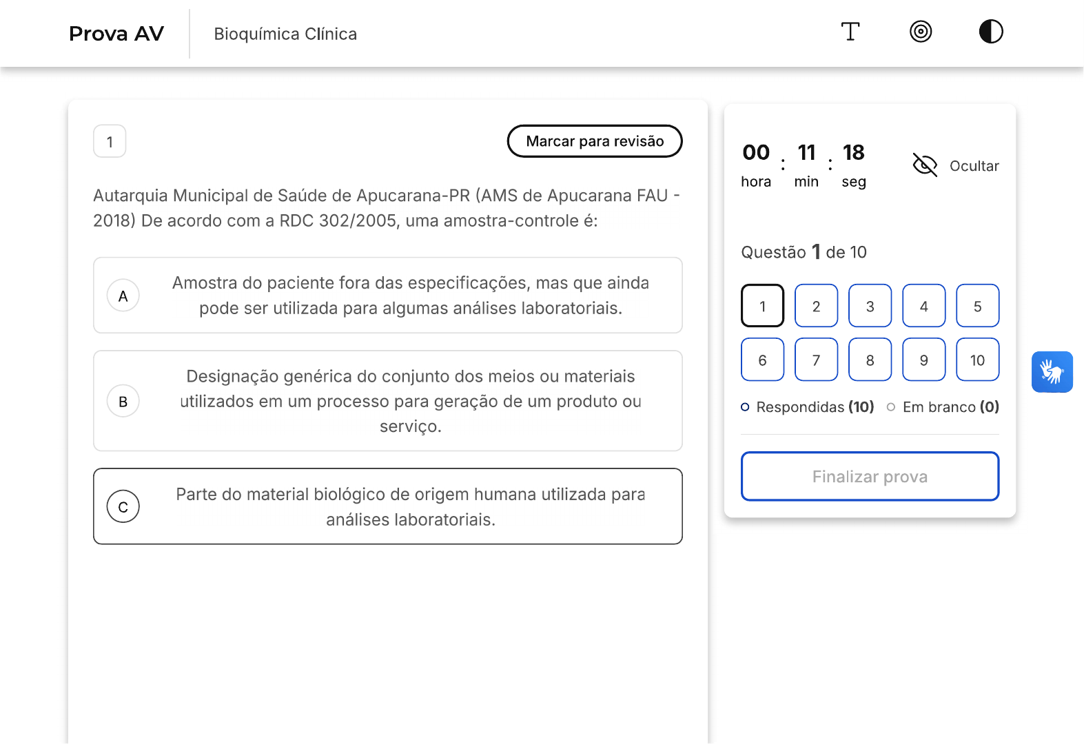 Prova AV Bioquímica Clínica T 1 Marcar para revisão 00 : 11 : 18 Ocultar hora min seg Autarquia Municipal de Saúde de Apucarana-PR (AMS de Apucarana FAU - 2018) De acordo com a RDC 302/2005, uma amostra-controle é: Questão 1 de 10 Amostra do paciente fora das especificações, mas que ainda A pode ser utilizada para algumas análises laboratoriais. 1 2 3 4 5 6 7 8 9 10 Designação genérica do conjunto dos meios ou materiais B utilizados em um processo para geração de um produto ou Respondidas (10) Em branco (0) serviço. Finalizar prova Parte do material biológico de origem humana utilizada para C análises laboratoriais.Material usado com a finalidade principal de monitorar a D estabilidade e a reprodutibilidade de um sistema analítico nas condições de uso na rotina. Substância ou preparação destinada à higienização, desinfecção, esterilização ou desinfestação domiciliar, em ambientes coletivos, E públicos e privados, em lugares de uso comum e no tratamento da água. 2 Marcar para revisão (IBFC-2016-EBSERH) infarto agudo do miocárdio é a necrose da célula miocárdica resultante da oferta inadequada de oxigênio ao músculo cardíaco. A princípio, ocorre isquemia e, se esta for grave e prolongada, segue-se o infarto do miocárdio, cuja extensão depende da artéria coronária obstruída, do grau de circulação colateral e das exigências de oxigênio do tecido suprido pela artéria. Os marcadores de lesão miocárdica são macromoléculas intracelulares liberadas após lesão da membrana do sarcolema dos miócitos decorrente de necrose. Sobre os marcadores utilizados na investigação do infarto agudo, assinale a alternativa correta:miocárdio contém quantidades expressivas de aldolase. A A elevação da atividade plasmática da aldolase indica alterações A elevação da enzima CK-MB (creatinoquinase M é um indicador B específico de lesão miocárdica, particularmente de infarto agudo do miocárdio. A lactato desidrogenase é uma enzima da classe das C oxidorredutases específica do músculo cardíaco. As transaminases podem ser utilizadas como marcadores de D lesão cardíaca, sendo encontradas somente nesse tecido. A lipase é um importante marcador do infarto agudo do E miocárdio. 3 Marcar para revisão (Adaptada de FUMARC - 2013 - PC/MG - Técnico Assistente da Polícia Civil - Técnico em Patologia Clínica) Inúmeras enzimas são clinicamente úteis para o reconhecimento e monitoramento de determinados processos patológicos. Aspartatoaminotransaminase (AST) e alanina aminotransferase (ALT) são encontradas em muitos órgãos, mas, se estão elevadas, a sugestão é de dano: A Renal B Hepático C Cardíaco D Pulmonar E Cerebral 4 Marcar para revisão (Adaptado de Coseac, Enfermagem, 2014) No exame físico, durante a inspeção da pele, alguns achados cutâneos podem estar associados a doenças cardiovasculares. Entre eles, a presença de xantelasma que pode indicar:A Níveis baixos de glicose B Níveis elevados de glicose C Níveis elevados de colesterol D Níveis elevados de ferro E Níveis baixos de colesterol 5 Marcar para revisão Adaptado de Prefeitura Municipal de Senador Canedo (Itame - 2019) serviço prestado pelo laboratório clínico é uma atividade complexa influenciada por vários fatores internos e ambientais que podem comprometer seus resultados. A complexidade da prestação de serviços médico-laboratoriais evidencia a necessidade de os laboratórios clínicos repensarem suas estruturas, seus processos e também suas relações de trabalho, pois seus serviços estão profundamente comprometidos com a qualidade dos resultados. Nesse contexto surge a Gestão da Qualidade, envolvendo um conjunto de técnicas e procedimentos operacionais que sedestinam a monitorar a qualidade dos exames. Sendo assim, o Controle de Qualidade Interno consiste: Na análise diária da amostra controle com valores dos analitos A conhecidos para avaliar a precisão dos ensaios. Na análise mensal da amostra controle com valores dos analitos B desconhecidos para avaliar a exatidão dos ensaios. Em um conjunto de ações praticadas por profissionais clínicos a fim de observar as diferenças operacionais que geram erros de C análise de exame de amostras de pacientes em vários laboratórios. Na avaliação do desempenho dos analistas clínicos através de D testes de proficiência, análise de suas operações e comparações interlaboratoriais com outros profissionais. Na avaliação quinzenal de ações praticadas por profissionais E administrativos dentro do laboratório clínico. 6 Marcar para revisãoA CK-MB é um importante marcador do infarto agudo do miocárdio. Sobre as metodologias de análise dessa fração da CK-MB, analise as afirmativas a seguir: I. A imunoinibição técnica sorologia que emprega anticorpos anti-CK-M para inibir a fração CK-MM é um método de análise. II. A imunoinibição técnica sorologia que emprega uma competição competitiva entre o CKMB e CKMM é um método de análise. III. Pode ser dosado também pelos ensaios imunoenzimáticos e de massa. É correto o que se afirma em: A I. B II. C III. D e E I e III.7 Marcar para revisão (Enade, Biomedicina, 2007) Um paciente portador de diabetes tipo II, sob tratamento médico, realizou os exames laboratoriais periódicos de acompanhamento. Constatou-se uma glicemia de jejum no limite inferior da normalidade, mas os valores de glicose incorporada à hemoglobina (hemoglobina glicada) revelaram-se significativamente acima do percentual recomendado. Essas observações permitem concluir que: paciente deve ter sofrido um episódio hiperglicêmico nas A últimas 24 horas. paciente deve ter sofrido um episódio hipoglicêmico nas B últimas 24 horas. sequestro de glicose pela hemoglobina deve estar provocando C episódios frequentes de hipoglicemia. paciente deve ter apresentado episódios frequentes de D hiperglicemia nos últimos 60 a 90 dias. Não há qualquer relação ent
