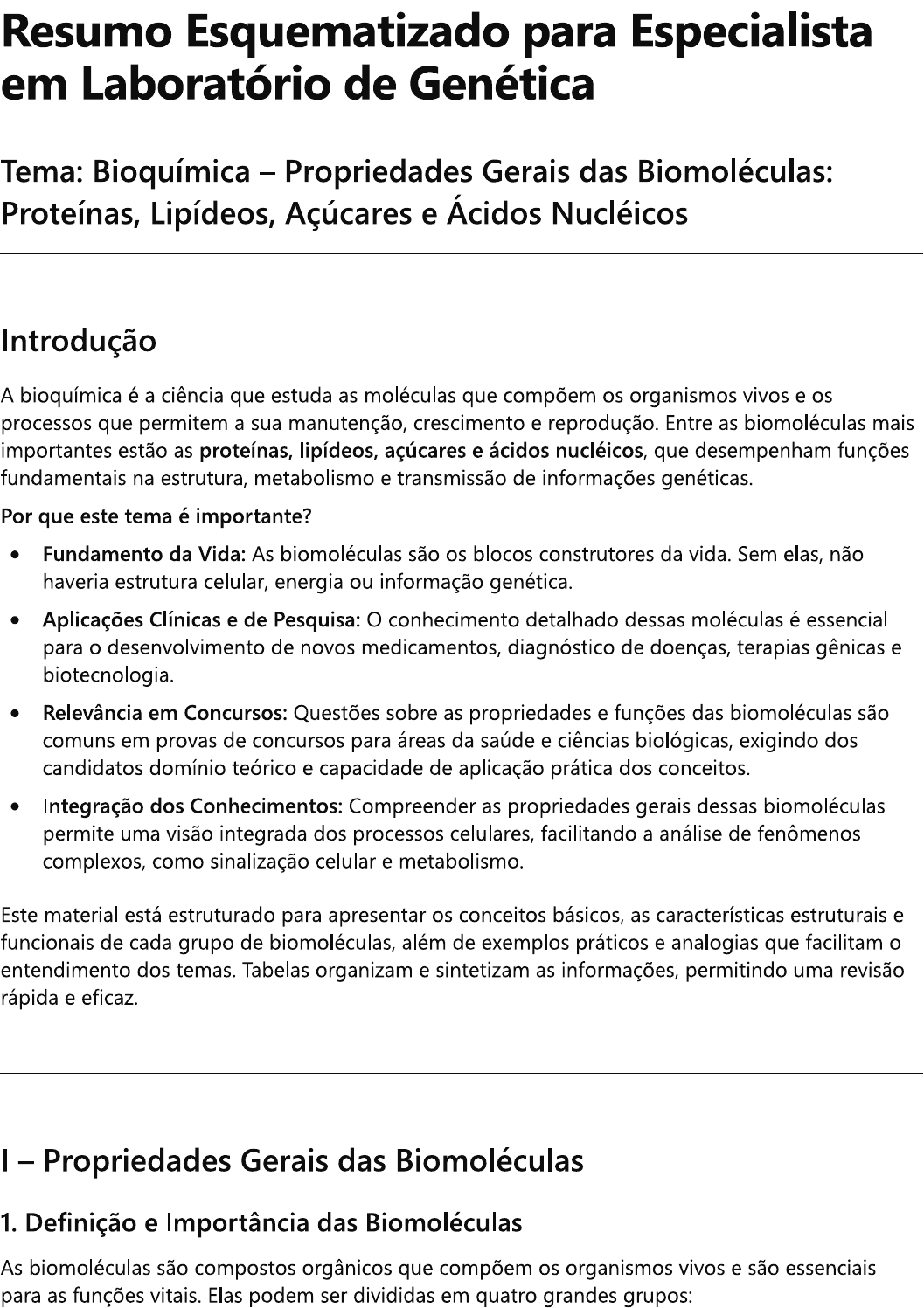 Resumo Esquematizado para Especialista em Laboratório de Genética Tema: Bioquímica - Propriedades Gerais das Proteínas, Lipídeos, Açúcares e Ácidos Nucléicos Introdução A bioquímica é a ciência que estuda as moléculas que compõem os organismos vivos e os processos que permitem a sua manutenção, crescimento e reprodução. Entre as mais importantes estão as proteínas, lipídeos, açúcares e ácidos nucléicos, que desempenham funções fundamentais na estrutura, metabolismo e transmissão de informações genéticas. Por que este tema é importante? Fundamento da Vida: As são os blocos construtores da vida. Sem elas, não haveria estrutura celular, energia ou informação genética. Aplicações Clínicas e de Pesquisa: conhecimento detalhado dessas moléculas é essencial para o desenvolvimento de novos medicamentos, diagnóstico de doenças, terapias gênicas e biotecnologia. Relevância em Concursos: Questões sobre as propriedades e funções das são comuns em provas de concursos para áreas da saúde e ciências biológicas, exigindo dos candidatos domínio teórico e capacidade de aplicação prática dos conceitos. Integração dos Conhecimentos: Compreender as propriedades gerais dessas permite uma visão integrada dos processos celulares, facilitando a análise de fenômenos complexos, como sinalização celular e metabolismo. Este material está estruturado para apresentar os conceitos básicos, as características estruturais e funcionais de cada grupo de além de exemplos práticos e analogias que facilitam o entendimento dos temas. Tabelas organizam e sintetizam as informações, permitindo uma revisão rápida e eficaz. I - Propriedades Gerais das 1. Definição e Importância das As são compostos orgânicos que compõem os organismos vivos e são essenciais para as funções vitais. Elas podem ser divididas em quatro grandes grupos:Proteínas: Polímeros de aminoácidos que desempenham funções estruturais, enzimáticas, de transporte e defesa. Lipídeos: Compostos majoritariamente hidrofóbicos que atuam no armazenamento de energia, na formação de membranas celulares e na sinalização. Açúcares (Carboidratos): Polímeros de monossacarídeos que fornecem energia e têm funções estruturais. Ácidos Nucléicos: DNA e RNA, que armazenam, transmitem e expressam a informação genética. Analogia: Imagine as biomoléculas como os "ingredientes" de uma receita complexa - cada grupo tem um papel específico, assim como ingredientes diversos são necessários para preparar um prato completo. Sem proteínas, não há enzimas para catalisar reações; sem lipídeos, não há membranas que separam os compartimentos; sem açúcares, a energia não é armazenada; e sem ácidos nucléicos, não há instruções para a montagem de tudo isso. Tabela 1 - Grupos Principais de Biomoléculas Grupo Composição Básica Funções Principais Exemplos Proteínas Aminoácidos Catalisar reações, estrutura, transporte, Hemoglobina, enzima defesa anticorpos Lipídeos Ácidos graxos e glicerol Armazenamento de energia, formação Triglicerídeos, de membranas, sinalização fosfolipídios, esteróide Açúcares Monossacarídeos e Fornecer energia, função estrutural Glicose, amido, celulo polissacarídeos Ácidos Nucleotídeos (DNA, Armazenamento e transmissão da DNA, RNA Nucléicos RNA) informação genética - Proteínas 1. Estrutura e Função das Proteínas As proteínas são polímeros de aminoácidos e possuem níveis estruturais distintos que determinam sua função. 1.1 Níveis Estruturais das Proteínas Estrutura Primária: Sequência linear de aminoácidos. Estrutura Secundária: Arranjos locais, como hélices alfa e folhas beta, mantidos por ligações de hidrogênio.Estrutura Terciária: Dobramento tridimensional da proteína, estabilizado por interações hidrofóbicas, pontes de hidrogênio e ligações Estrutura Quaternária: Associação de duas ou mais subunidades proteicas. Analogia: Pense na proteína como um colar de contas. A estrutura primária é a sequência de contas, a estrutura secundária são os padrões formados pelas contas (como tranças ou nós), e a estrutura terciária é a forma final do colar. Quando vários colares se unem, temos a estrutura quaternária. Tabela 2 - Níveis Estruturais das Proteínas Nível Estrutural Descrição Forças Envolvidas Exemplo Primária Sequência linear de Ligações peptídicas Sequência de aminoácid aminoácidos em uma enzima Secundária Hélices alfa e folhas Ligações de hidrogênio Estrutura de queratina beta Terciária Dobramento Interações hidrofóbicas, pontes de Conformação final de un tridimensional hidrogênio, ligações globulina Quaternária Associação de Forças intermoleculares Hemoglobina subunidades 2. Funções das Proteínas As proteínas desempenham funções diversas e essenciais para a célula: Enzimática: Catalisam reações bioquímicas (ex.: DNA polimerase). Estrutural: Contribuem para a forma e a integridade celular (ex.: colágeno, queratina). Transporte: Movimentam substâncias (ex.: hemoglobina transporta oxigênio). Defesa: Parte do sistema imunológico (ex.: anticorpos). Regulação: Controlam processos celulares (ex.: hormônios, fatores de transcrição). Tabela 3 - Funções das Proteínas Função Descrição Exemplo Enzimática Acelera reações químicas Amilase, DNA polimerase Estrutural Fornece suporte e forma à célula Colágeno, queratina Transporte Transporta moléculas e íons Hemoglobina, canais Defesa Protege contra patógenos Anticorpos, complementoFunção Descrição Exemplo Regulatória Modula a atividade de processos celulares Hormônios, receptores nucleares 3. Aplicações Práticas em Laboratório O estudo das proteínas é crucial para diversas áreas, como diagnóstico, desenvolvimento de terapias e pesquisa de novos fármacos. Tabela 4 - Aplicações das Proteínas em Genética Aplicação Técnica Utilizada Benefícios Exemplo Diag