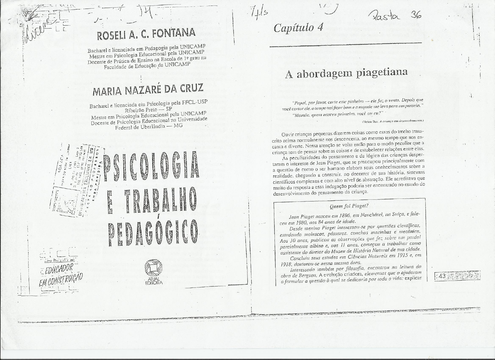 Pasta 36 ROSELI A. C. FONTANA Capítulo 4 Bacharel e licenciada em Pedagogia pela UNICAMP Mestre em Psicologia Educacional pela UNICAMP Docente de Prática de Ensino na Escola de grau na Faculdade de Educação da UNICAMP A abordagem piagetiana MARIA NAZARE DA CRUZ Bacharch e licenciada ein Psicologia pela FFCL-USP "Papai, por corte este pinheiro - o vento. Depois que Ribeirão Preto - SP você tempo vai ficar bom a me para um Mestre em Psicologia Educacional pela UNICAMP Docente de Psicologia Educacional na Universidade quem você cu? Federal de - MG A cm Ouvir crianças pequenas dizerem coisas como essas do trecho trans- crito acima normalmente nos desconcerta. ao mesmo tempo que nos en- canta e Nossa atenção se volta então para o modo peculiar que criança tem de pensar sobre as coisas e de estabelecer relações entre elas. As peculiaridades do pensamento e da lógica das crianças desper- taram o interesse de Jean Piagel, que se preocupou principalmente com a questão de como o ser humano elabora seus conhecimentos sobre a chegando a no decorrer de sua sistemas científicos complexos com alto nível de abstração. Ele acreditava que da resposta a essa indagação poderia ser encontrado no estudo do TRABALHO desenvolvimento do pensamento da criança. Quem Piaget? Jean 1896, em na Suíça, e fale- PEDAGOGICO ceu cm 1980, aos 84 anos de idade. Desde menino Piaget interessou-se por questões científicas, estudando moluscos, pássaros. conchas marinhas e Aos 10 anos, publicou as observações que fez sobre pardal parcialmente albino e, aos 11 anos, começou a trabalhar como assistente do diretor do Museu de História Natural de sua cidade. EDUCADOR Concluiu estudos em Ciências Naturais em 1915 cm doutorou-se nessa mesma área. EM Interessado lambém por filosofia, leitura da ATUAL obra de Bergson, A evolução criadora, elementos que o ajudarant EDITORA a formular a quesião à qual se dedicaria por a vida: explicar 43a forma pela qual o homem atinge o conhecimento lógico-abstrato Na década de 70, já trabalhando exclusivamente nas pesqui- que o distingue das outras espécies animais. sas do Centro de Epistemologia, dedicou-se à investigação Embora se tratasse de uma questão tipicamente a dos mecanismos de transição que impulsionam a evo- interessava abordá-la cientificamente. Ao longo de sell traba- lução do desenvolvimento cognitivo. lho, então, o desafio de construir uma teoria do conheci- Sua vasta produção é um marco de importância para mento baseada na biologia e em que as especulações filosóficas esti- a psicologia para os estudos do homem século XX. vessem ancoradas na pesquisa empírica. que Piaget entre a filosofia e a biologia foi a psicologia do desenvolvimento. Procurando compreender como o homem elabora o conhecimento, A elaboração da teoria explicativa da géne- Piaget desenvolveu o que chamou de psicologia genética. A palavra gené- se do conhecimento no homem Piaget a que ele próprio aplicou à sua psicologia. refere-se à busca das origens formular propostas e metodológicas e dos processos de formação do pensamento e do conhecimento. inovadoras quanto à natureza dos processos de A infância é considerada como um período particular do processo desenvolvimento da criança e que de formação do pensamento. que só se completa na idade adulta. É im- as teses do e do com- portante. não confundir as contribuições dadas por Piaget à com- preensão do desenvolvimento cognitivo da criança com uma portamentalismo. fundamento básico de sua concepção do gia da Ele não se dedicou a estudar o pensamento infantil funcionamento do desenvolvimento motivado por um interesse pela infância em si e também não elaborou cognitivo i o de que as relações entre organismo sua psicologia genética movido pelo interesse por questões propria- mente O centro de seu trabalho e de todos os seus e o meio são relações de troca, pelas quais o orga- é o desenvolvimento do conhecimento. nismo adapta-se an meio ao mesmo A formação de Piaget em Naturais levou-o a buscar com- assimila, de acordo com suas mm pro- cesso de equilibrações sucessivas. Determinar as preender conhecimento com base na biologia. Em sua concepção. contribuições das atividades do indivíduo e das conhecer é organizar. e explicar a realidade a partir daquilo restrições do ambiente na aquisição do conheci- que se vivencia nas experiências com os objetos do conhecimento. No entanto. experiência não é a mesma coisa que conhecimento. Este mento foi o foca do seu trabalho experimental. No período de 1921 a 1925, Piaget na coleta pressupõe a organização da num sistema de relações. Por exemplo. "a humanidade atravessou alguns milênios sem a rela- de dados que permitissem esboçar os princípios E fundamen- ção entre vida calor do sol; conhecer algo a respeito do calor solar seria tos de sua teoria do conhecimento. Abordou temas gerais, como inserir o calor sentido na pele num sistema de relações que permite a relação entre pensamento e linguagem (1923), desenvolvi- compreendê-lo como condição de existência da vida" (Chiarottino. 1988). mento, do julgamento do raciocínio (1924), da re- presentação do (1926), da causalidade física (1927) e do julgamento moral (1927). Esses estudos foram retomados, revis- 105 e aprofundados ao longo das décadas seguintes. Conhecimento e adaptação: os processos de No período de 1925 a 1931, com o nascimento de seus três assimilação e acomodação filhos, dedicou-se à observação meticulosa do desenvolvi- mento dos bebês, elaborando análises sobre a construção do real Mas como se dá a inserção de um objeto de num e o desenvolvimento da inteligência. sistema de relações? Segundo Piaget, isso ocorre fundamentalmente Na década de 30, ajudado por seus colaboradores, concentrou por meio da ação do indivíduo sobre o objeto. Ao agir sobre o meio, a pesquisa na gênese das noções de quantidade, número, tem